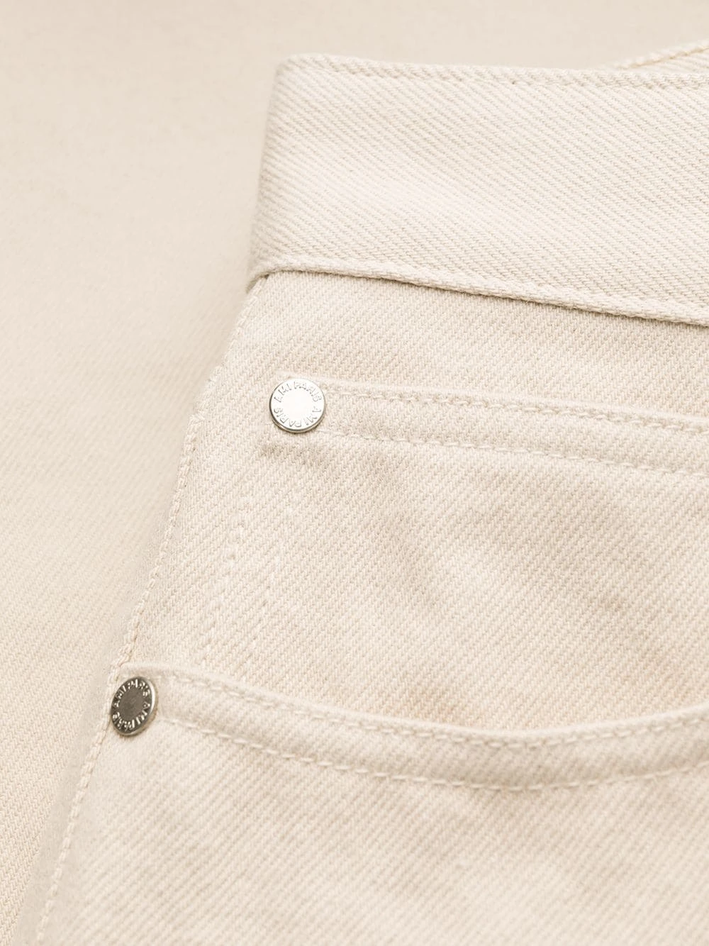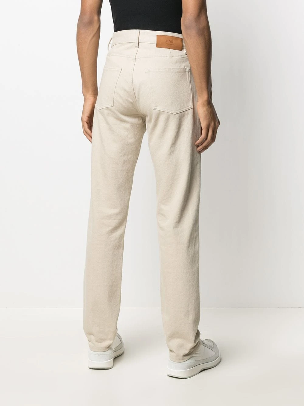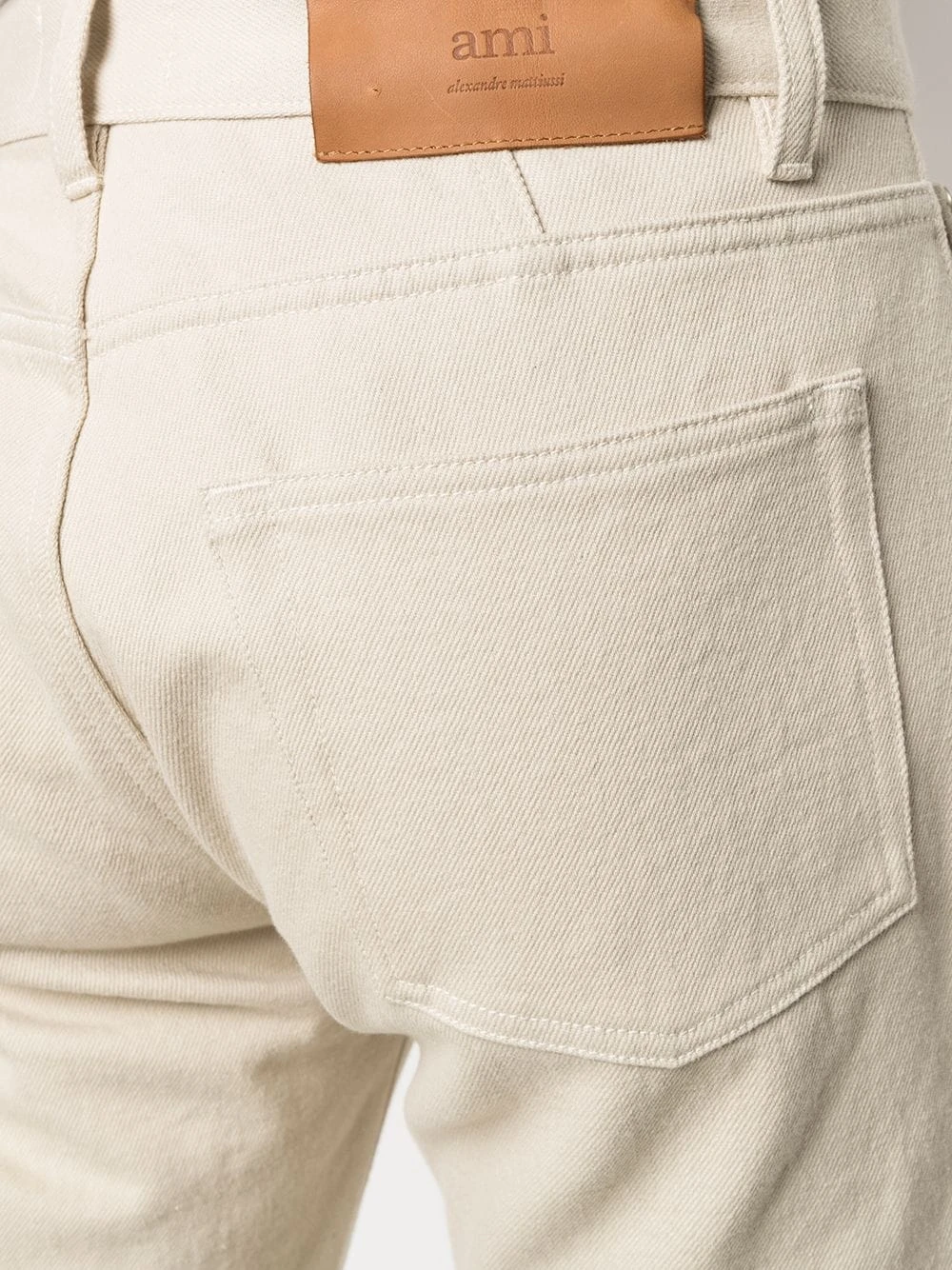Patch logo sur l’arrière, coupe droite, fermeture à zip et boutons sur le devant, 5 poches classiques. Matière : coton.