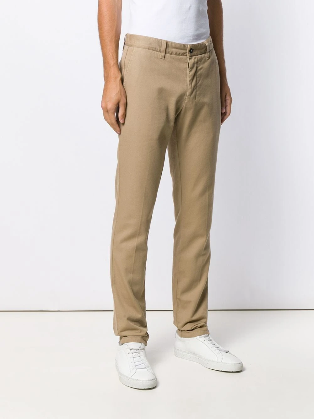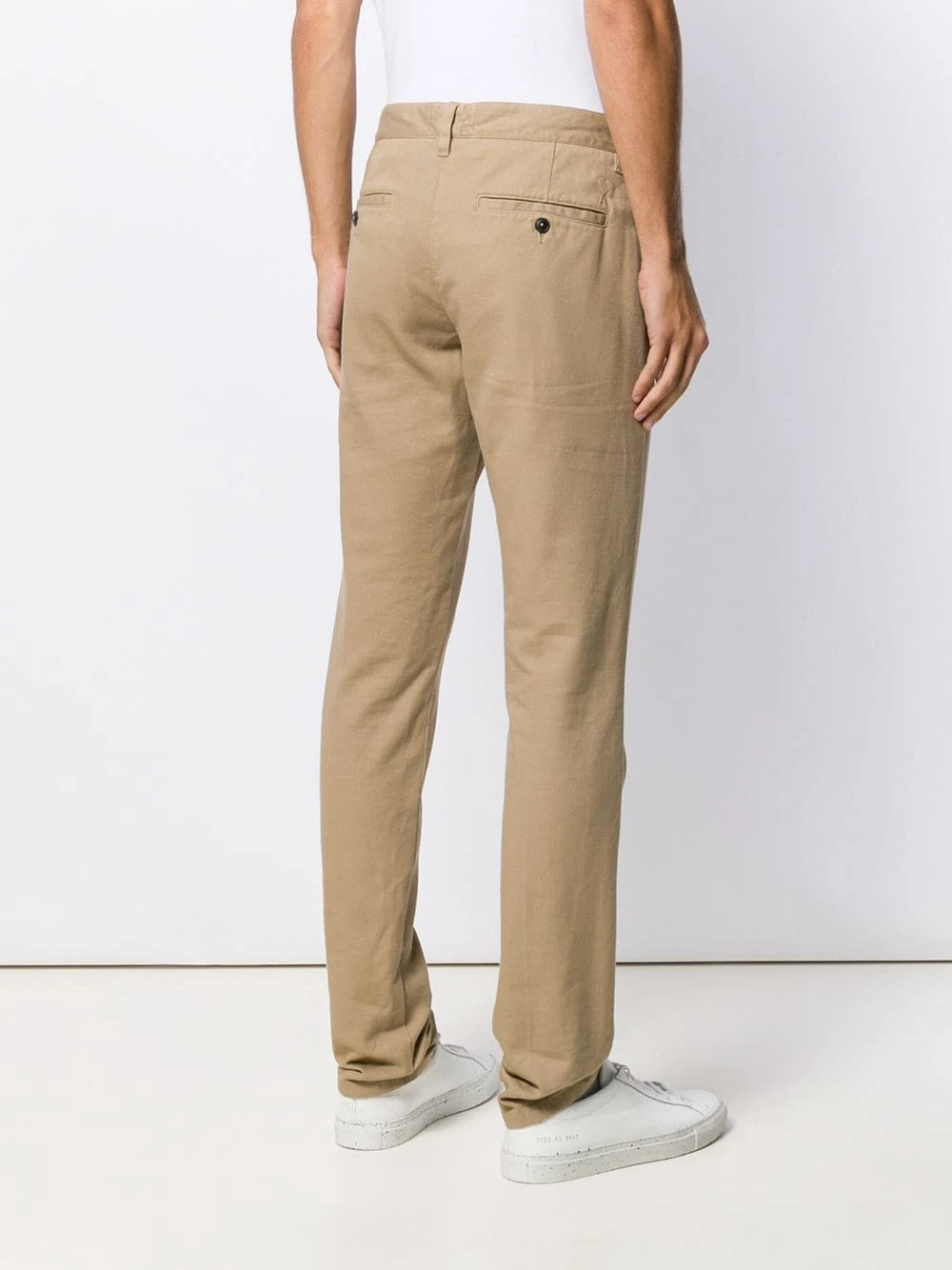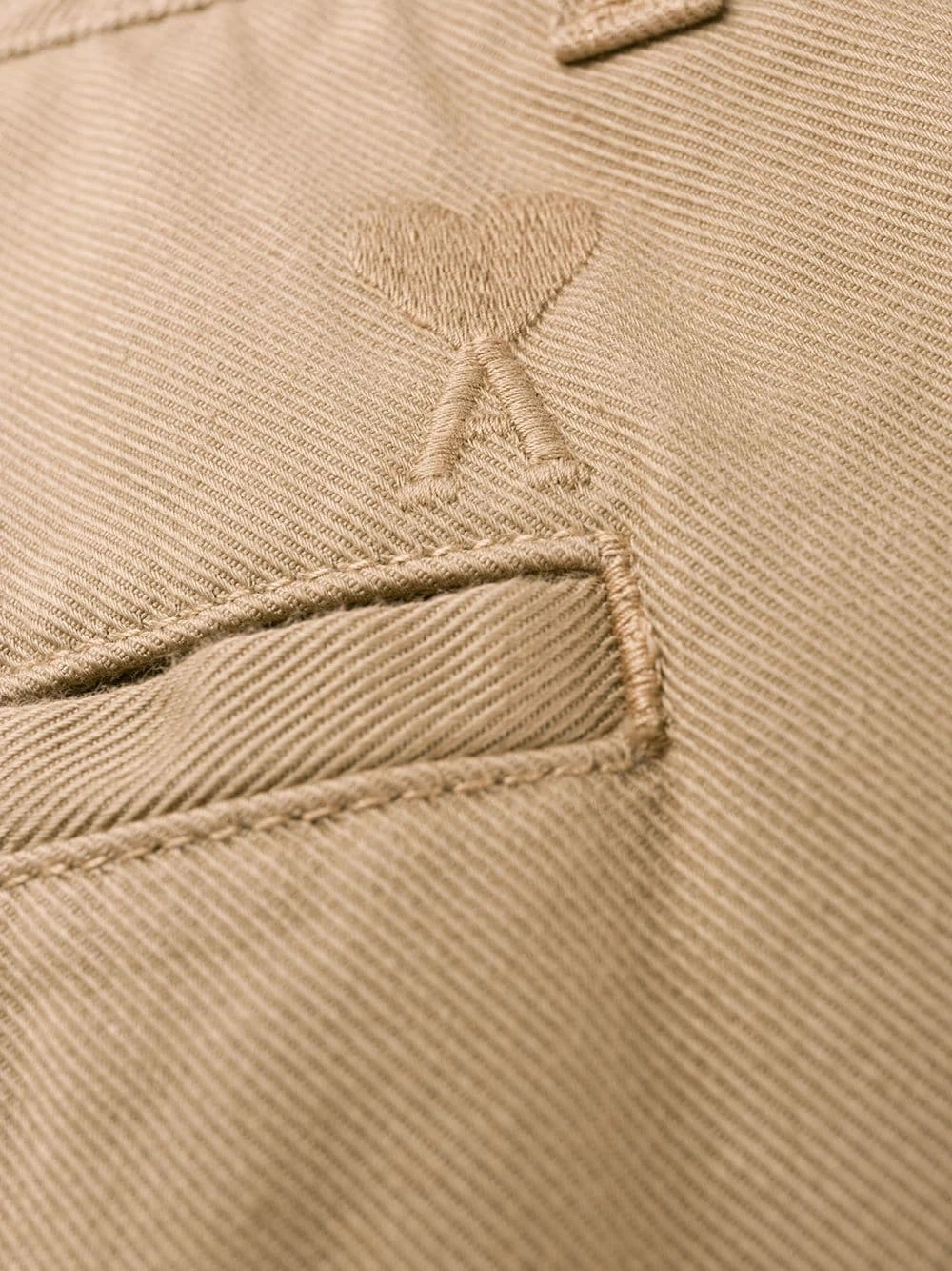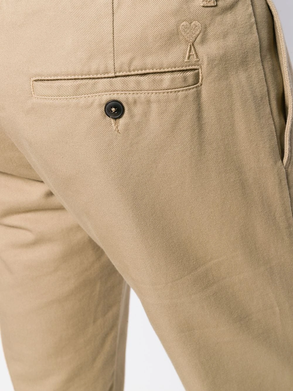 Pantalon chino droit en coton AMI Paris avec fermeture à zip et patte de boutonnage, poches latérales fendues, coupe droite et longueur classique. Couleur : marron.