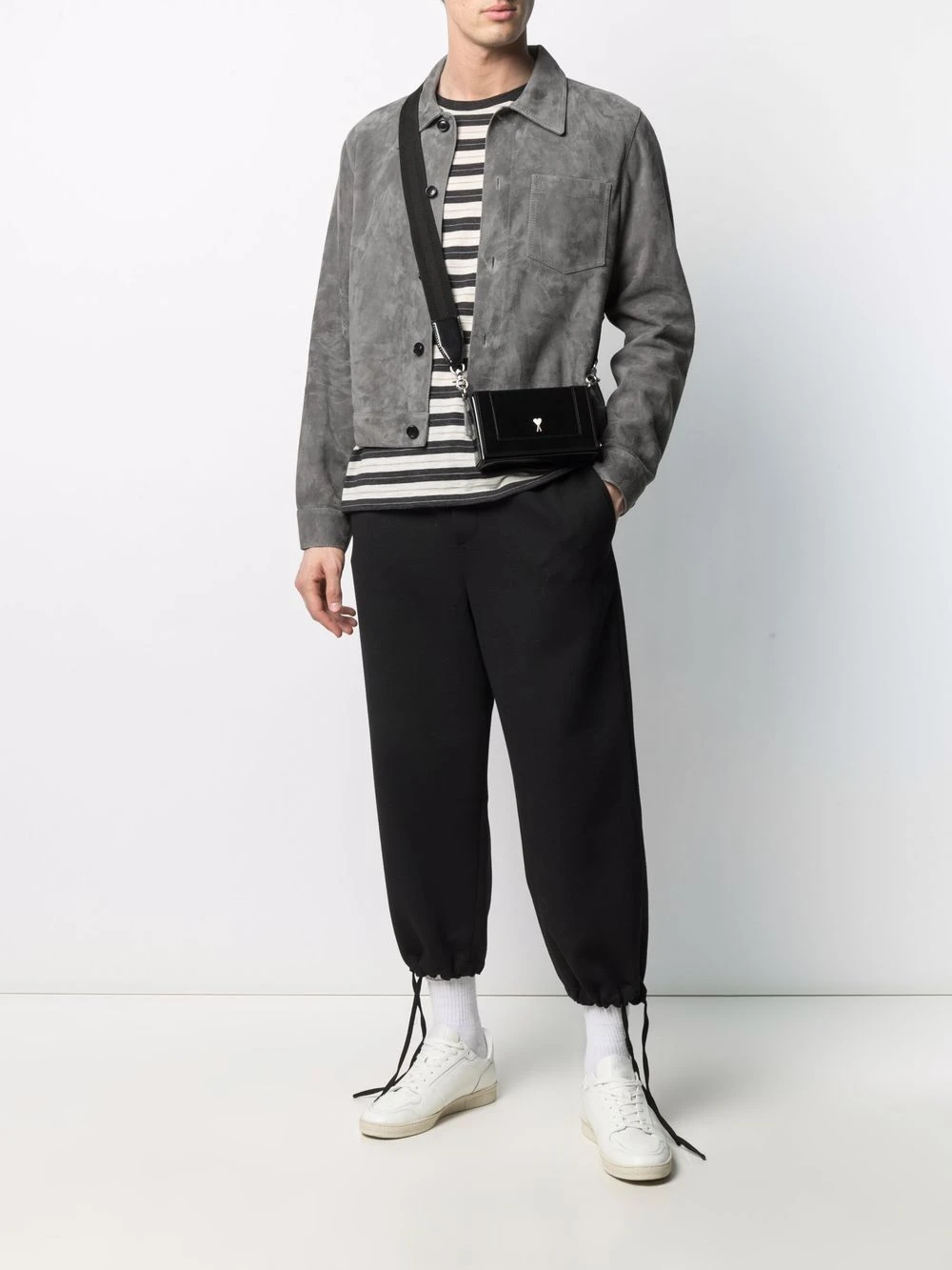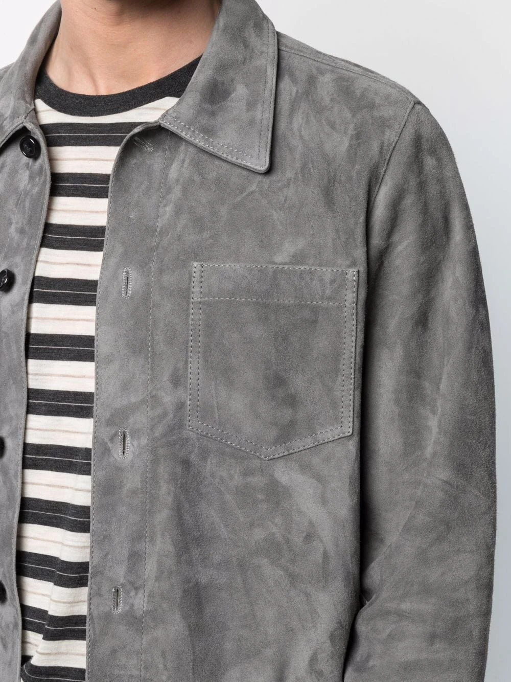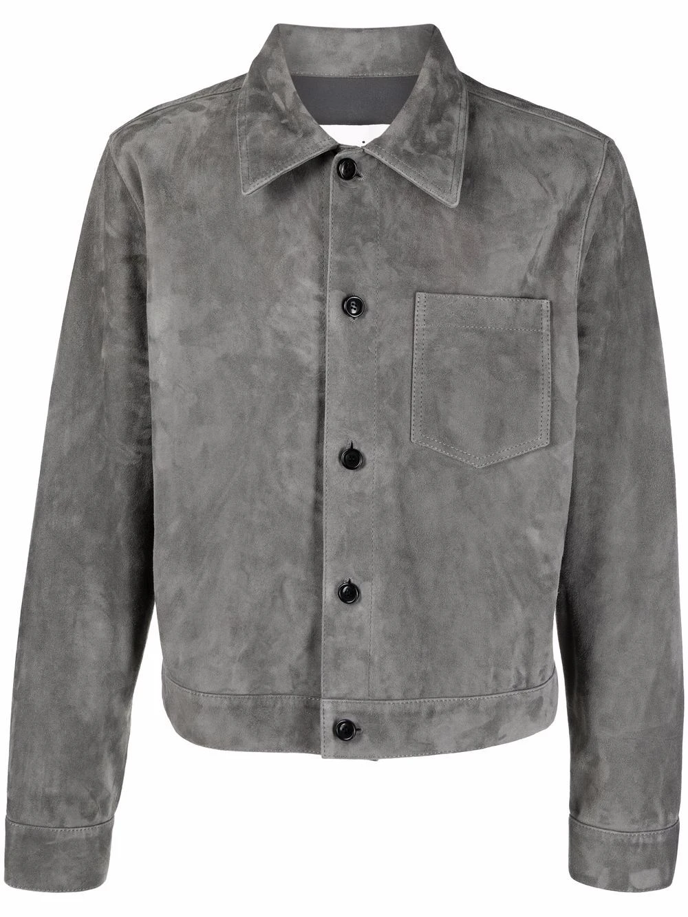 Col classique, boutonnière sur le devant, poche poitrine plaquée, manches longues, ourlet droit. Couleur : gris. Matière : peau de chèvre.