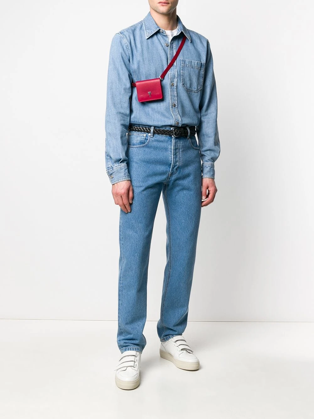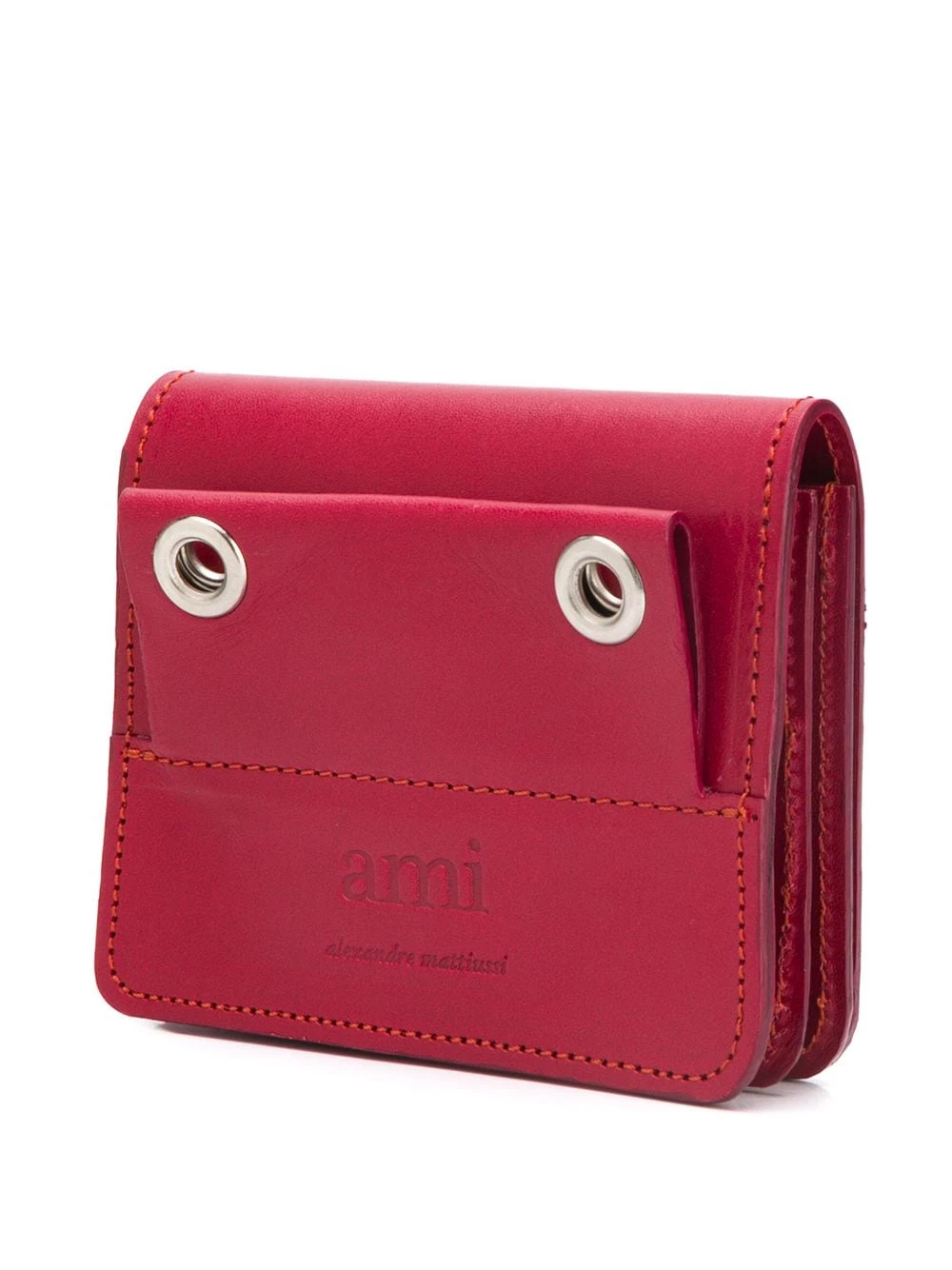 Mini pochette Ami de Coeur en cuir de veau AMI Paris avec bride portée épaule détachable, plaque logo sur le devant, fermeture magnétique et compartiment intérieur. Couleur : rouge.