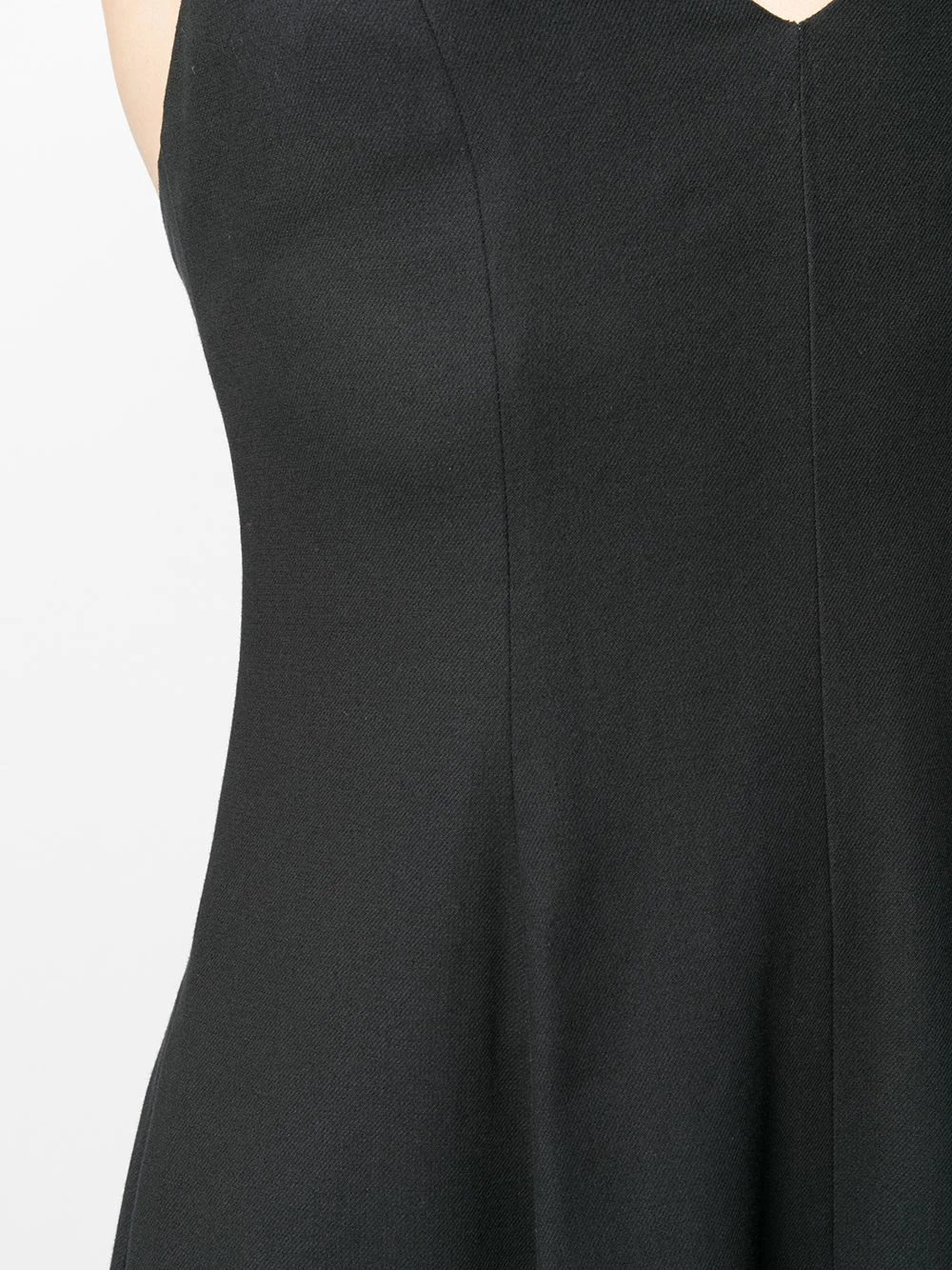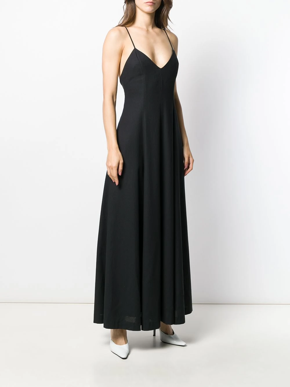 Robe longue évasée à col v en coton AMI Paris avec col v, fines bretelles, dos-nu, taille ajusté, coupe évasée et coupe longue. Couleur : noir.