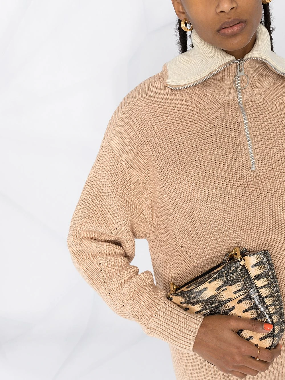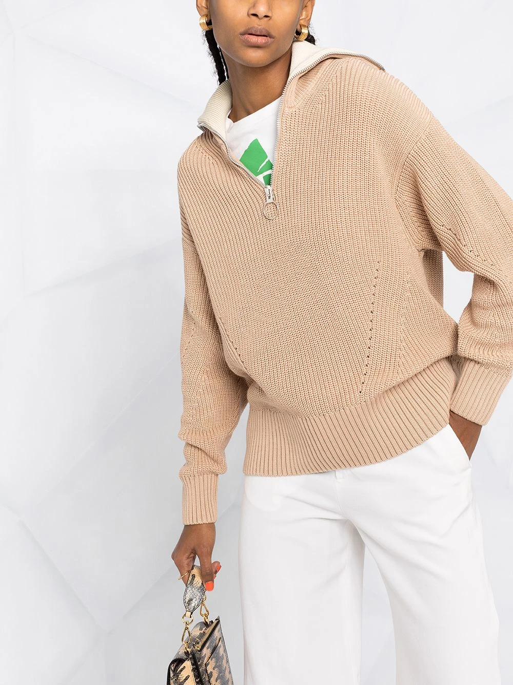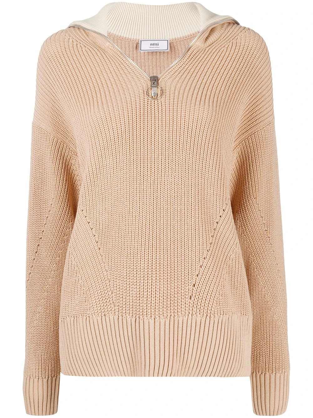 Fermeture zippée devant, manches longues, poignets nervurés, design tricoté. Couleur : tons neutres. Matière : coton.