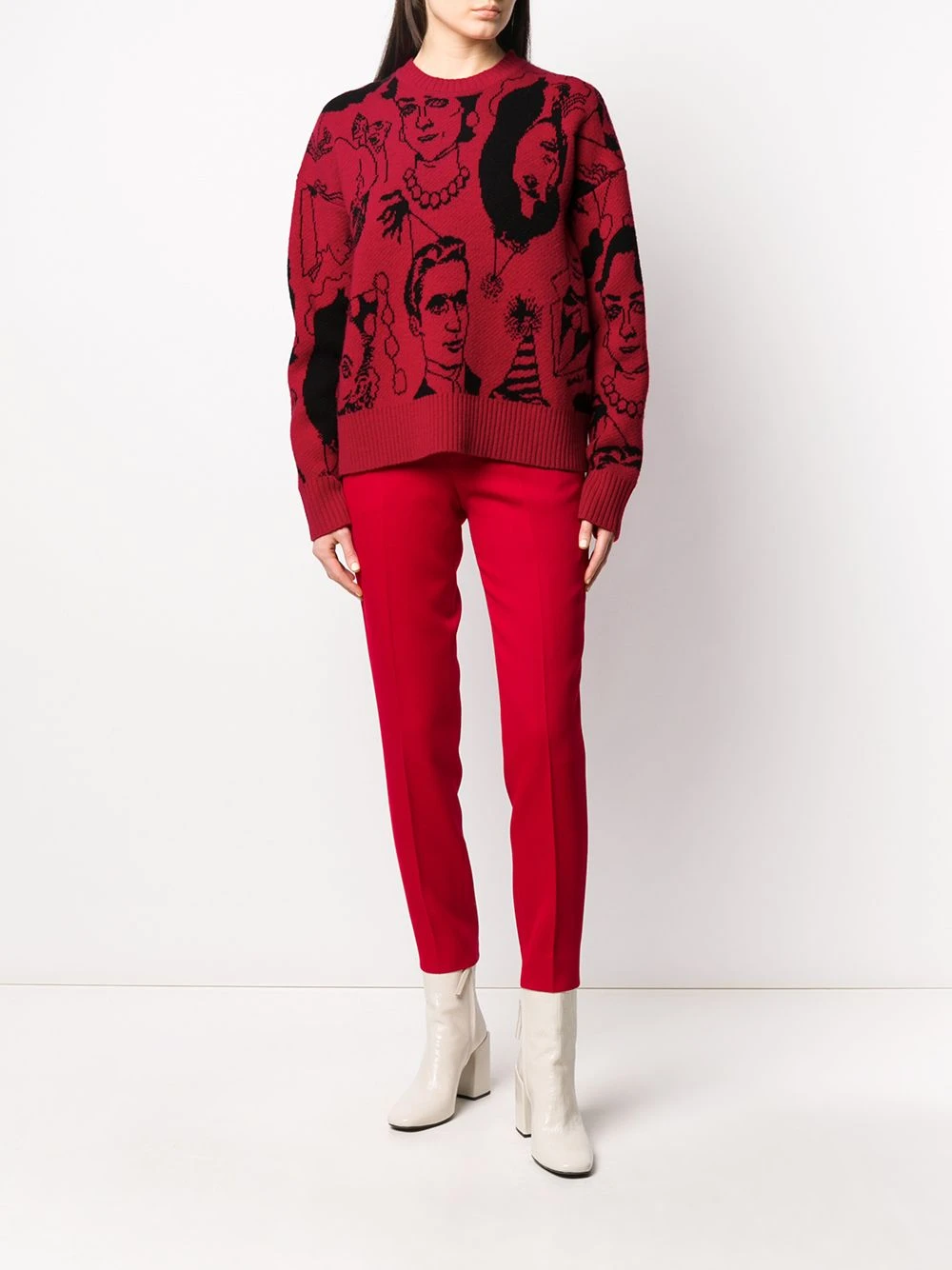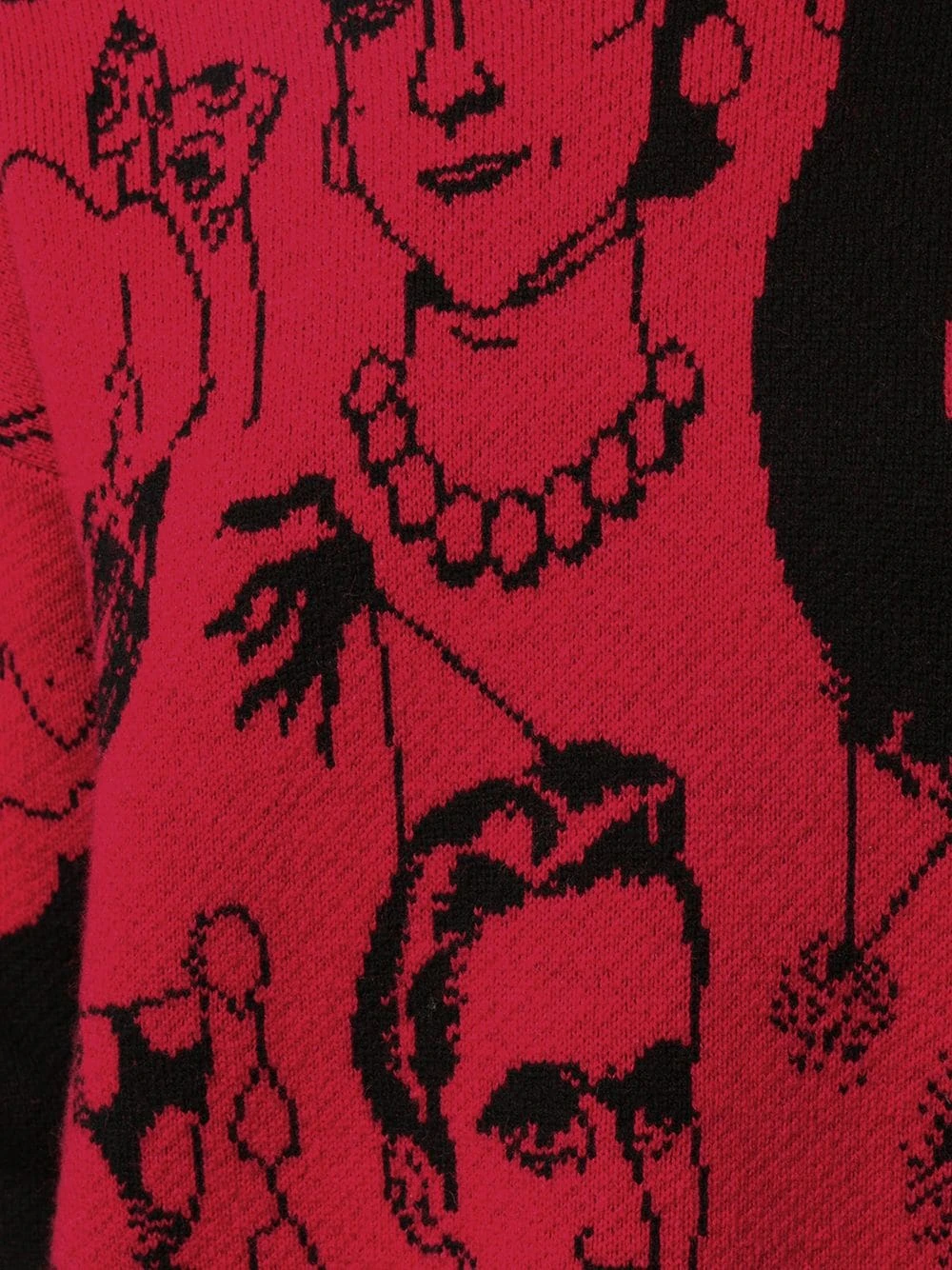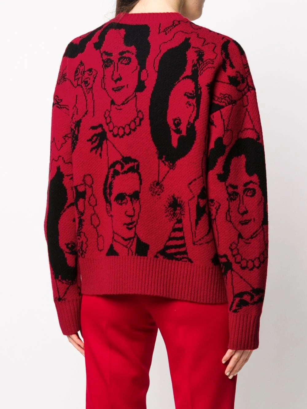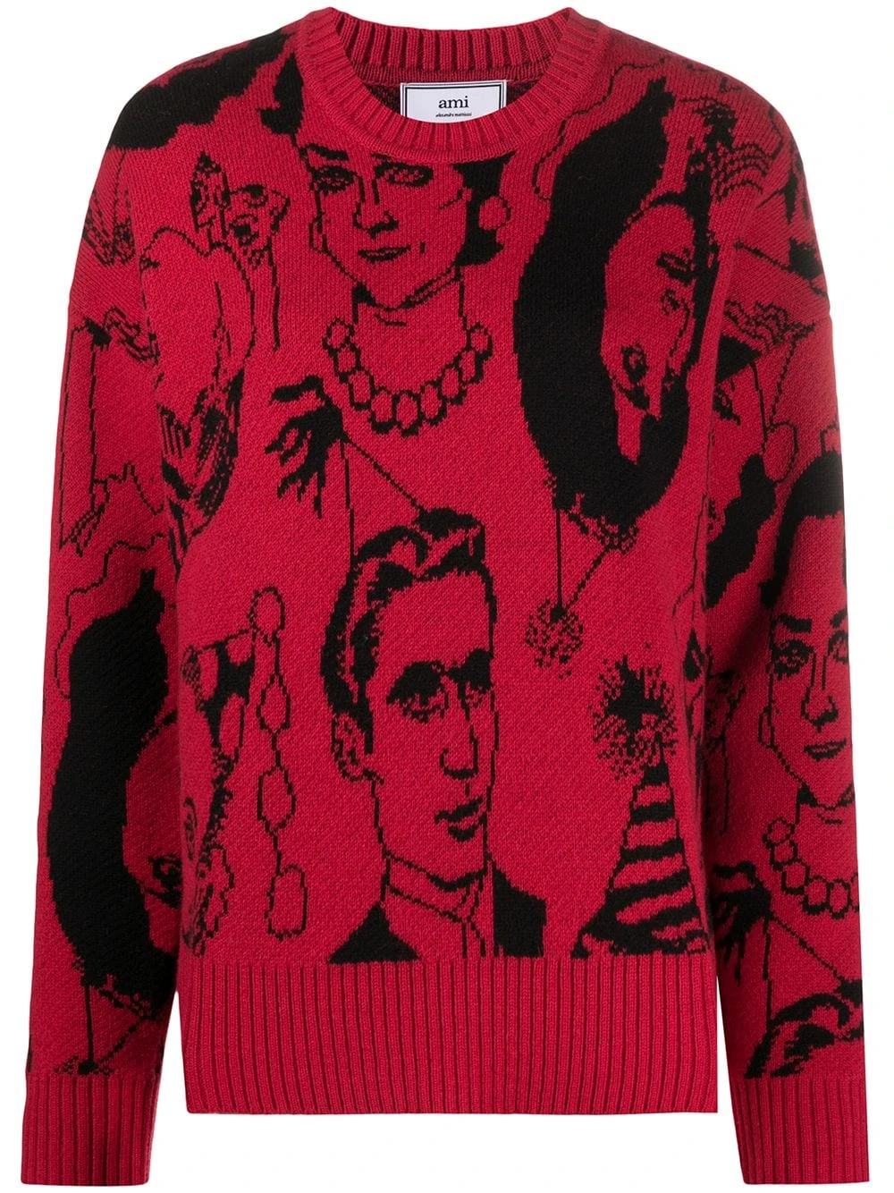 Motif jacquard, encolure ras du cou, manches longues, poignets nervurés, ourlet nervuré. Matière : laine vierge.