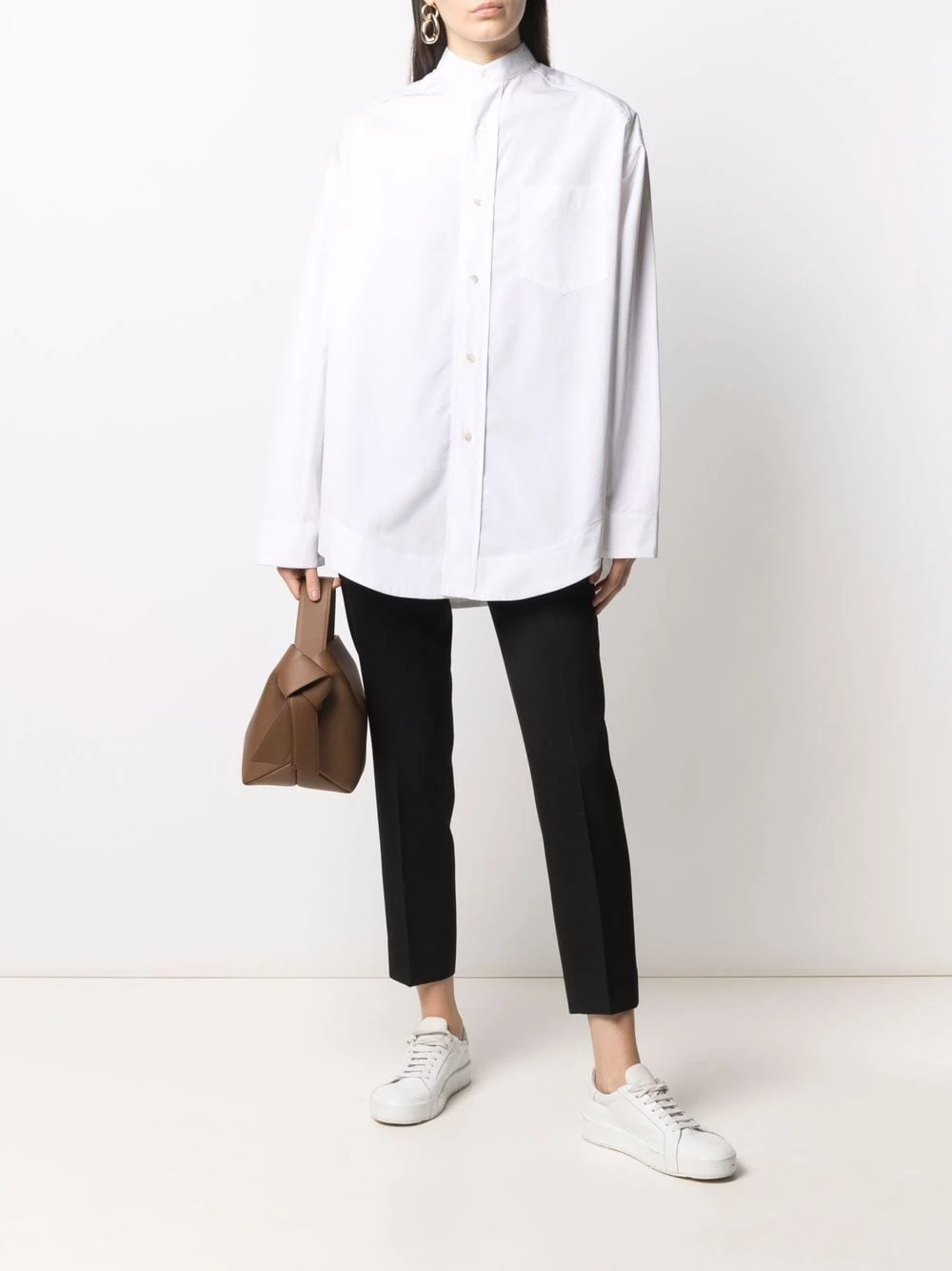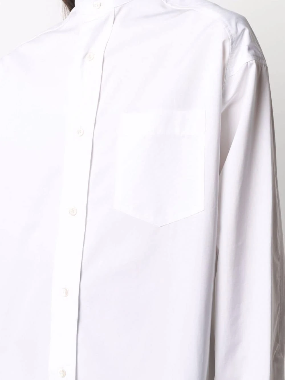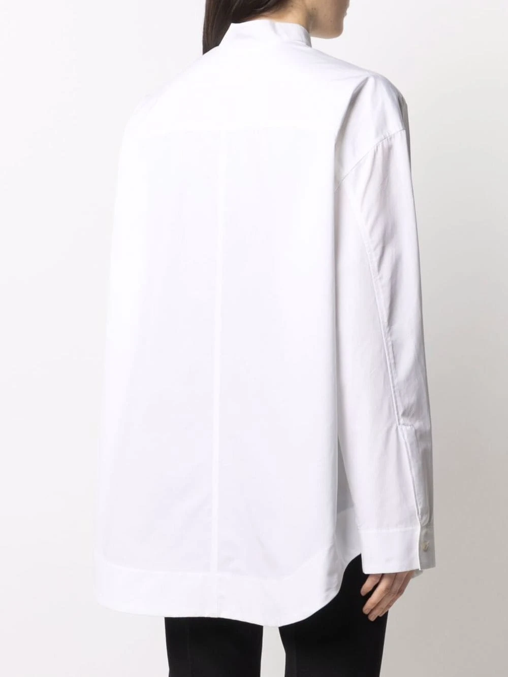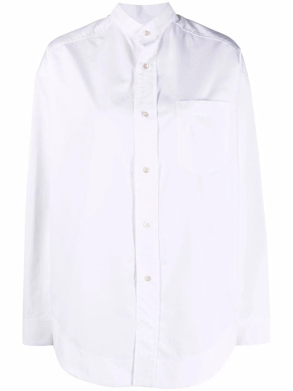 Col montant, boutonnière sur le devant, manches longues, poche poitrine plaquée, ourlet incurvé. Couleur : blanc.