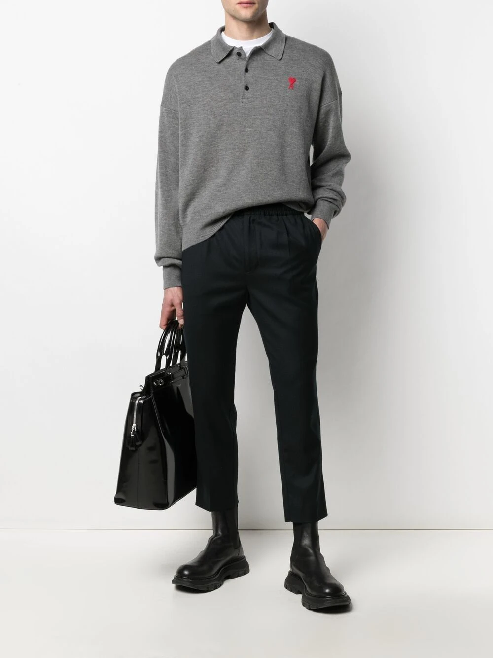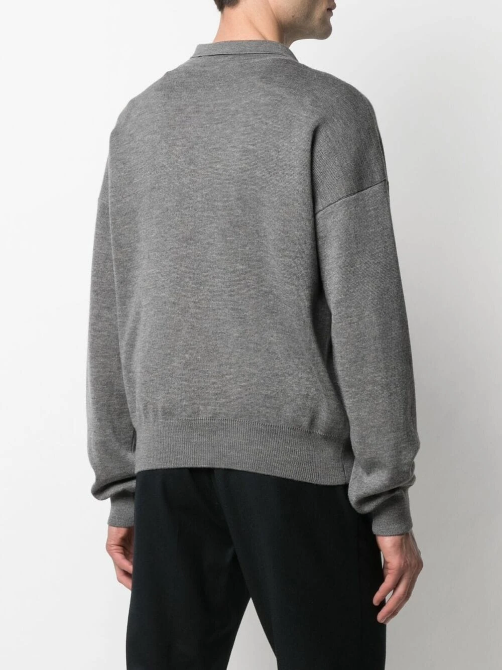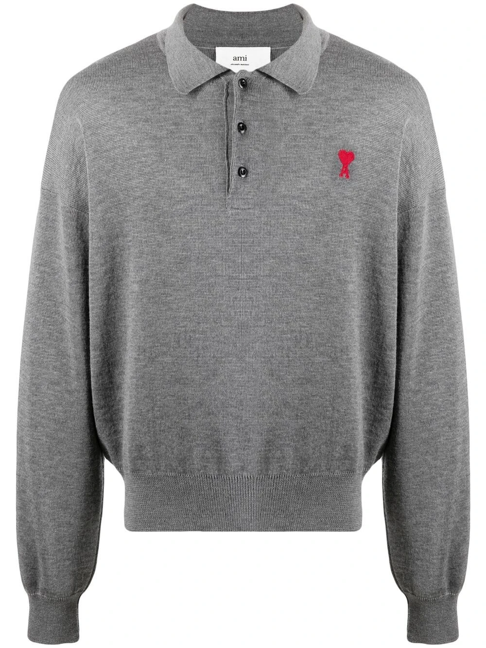 Logo Ami de Coeur signature, col polo, patte de boutonnage sur le devant, effet d’épaules descendues, manches longues. Couleur : gris. Matière : mérinos.