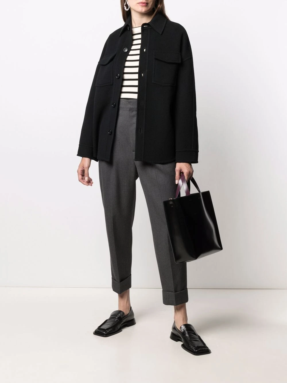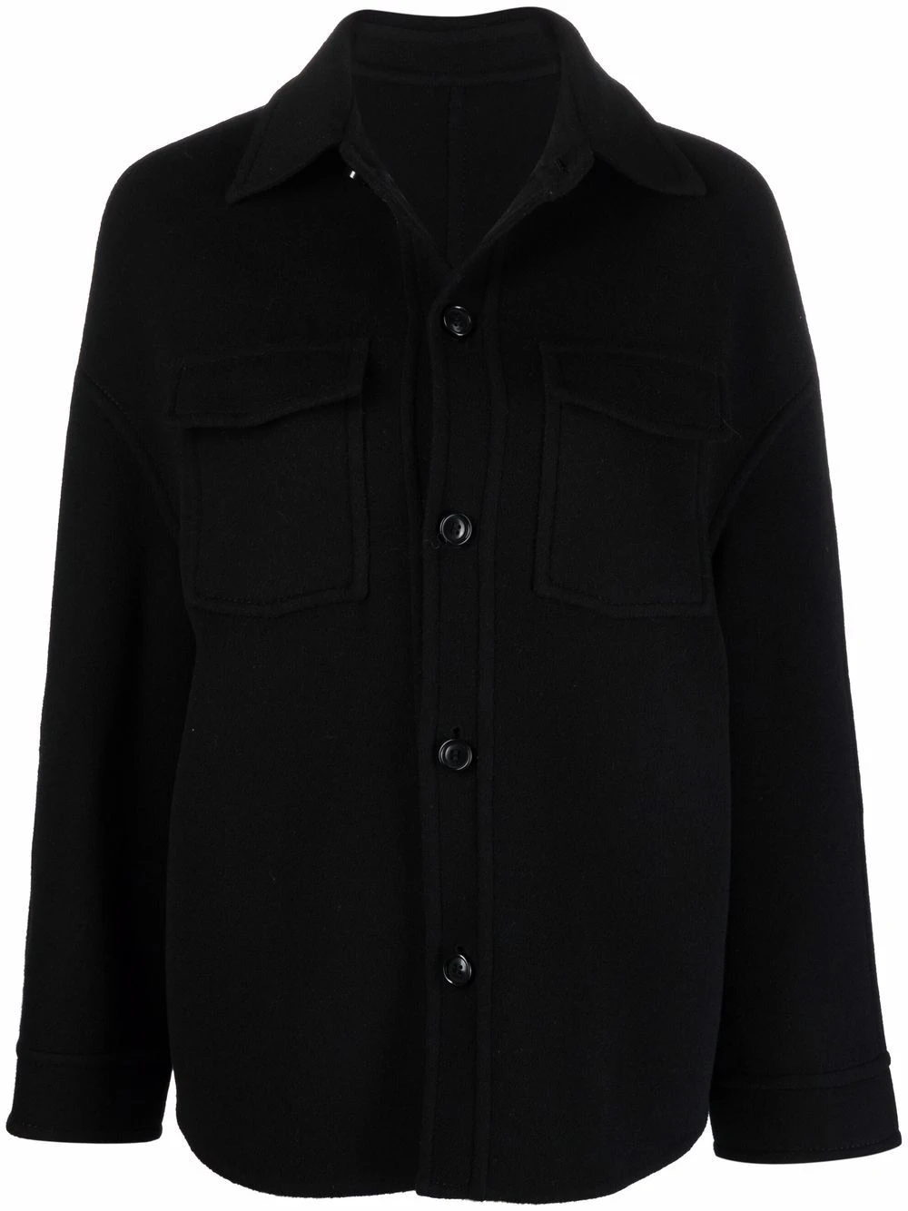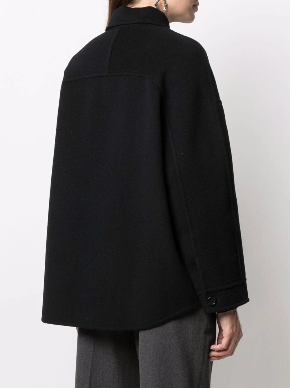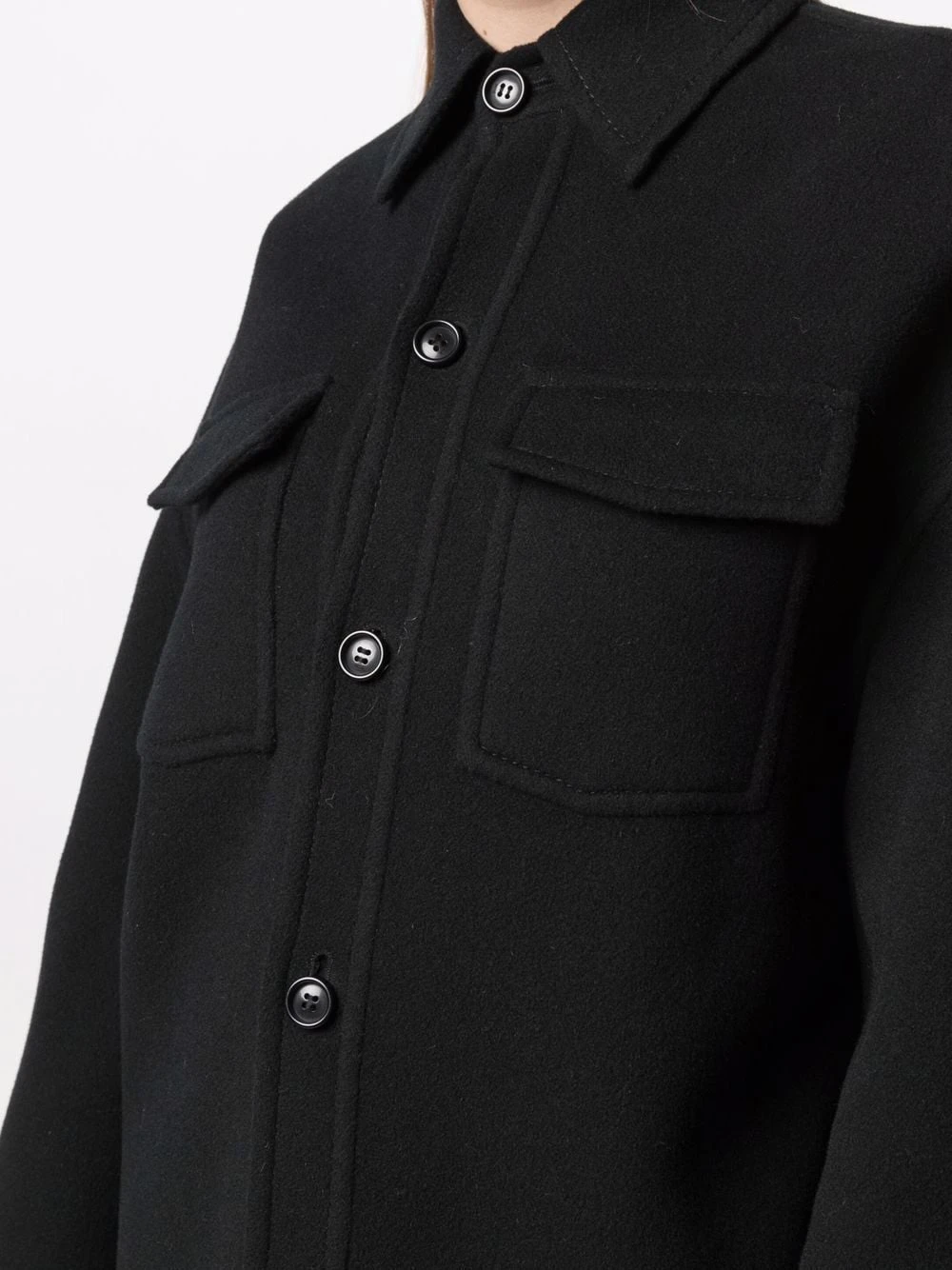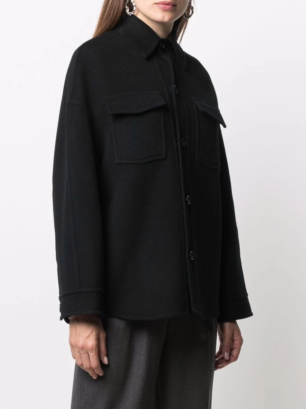 Col classique, deux poches poitrine à rabat, effet d’épaules descendues, manches longues, poignets boutonnés, boutonnière sur le devant. Couleur : noir. Matière : laine vierge.