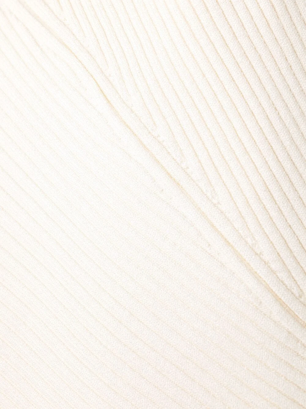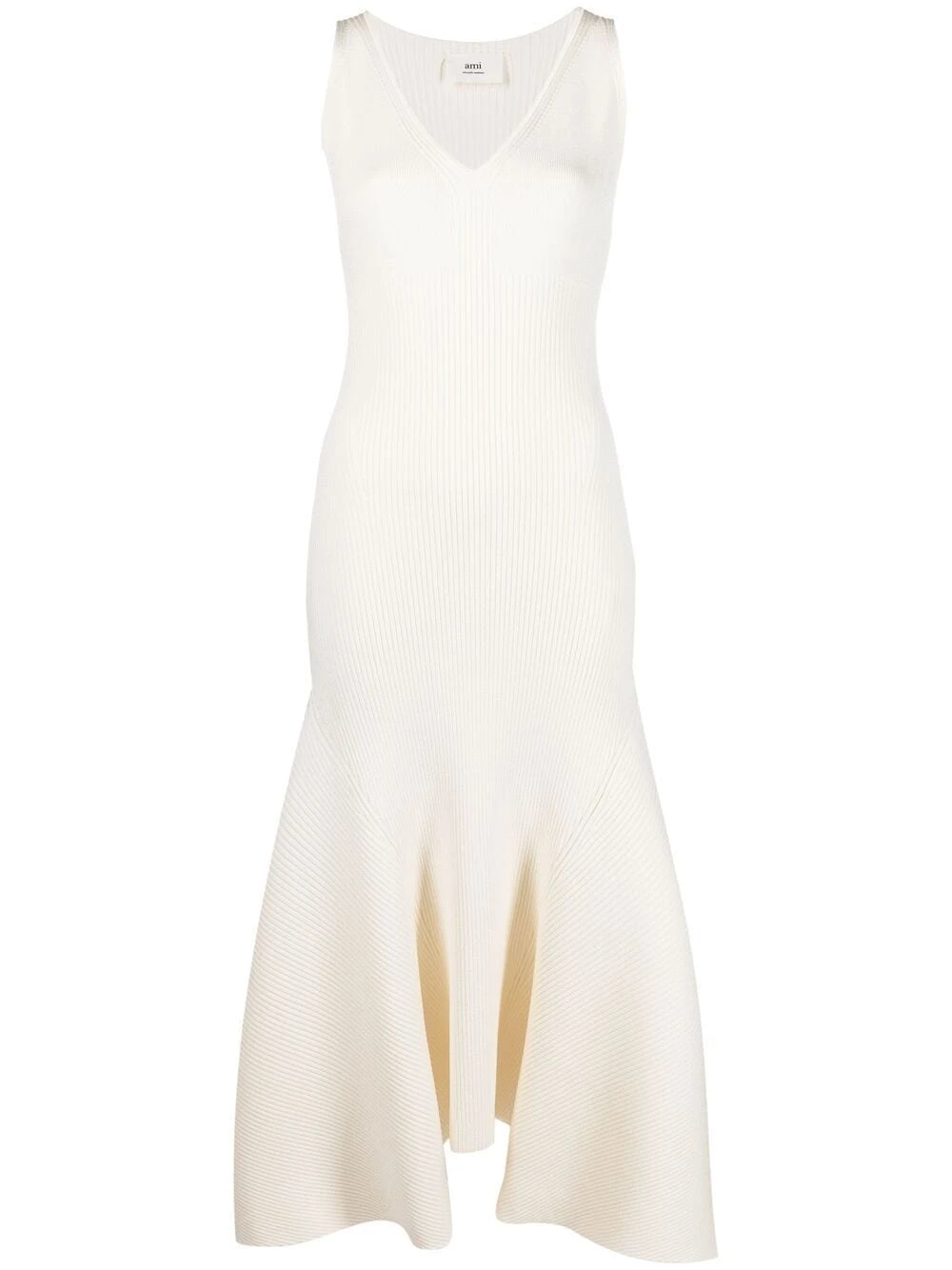 Robe nervurée à col v AMI Paris avec col v, un design sans manches, tricot nervuré, silhouette évasée et ourlet asymétrique.