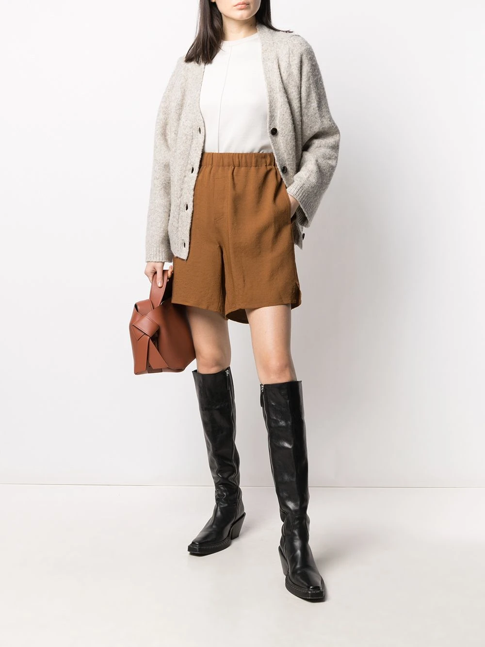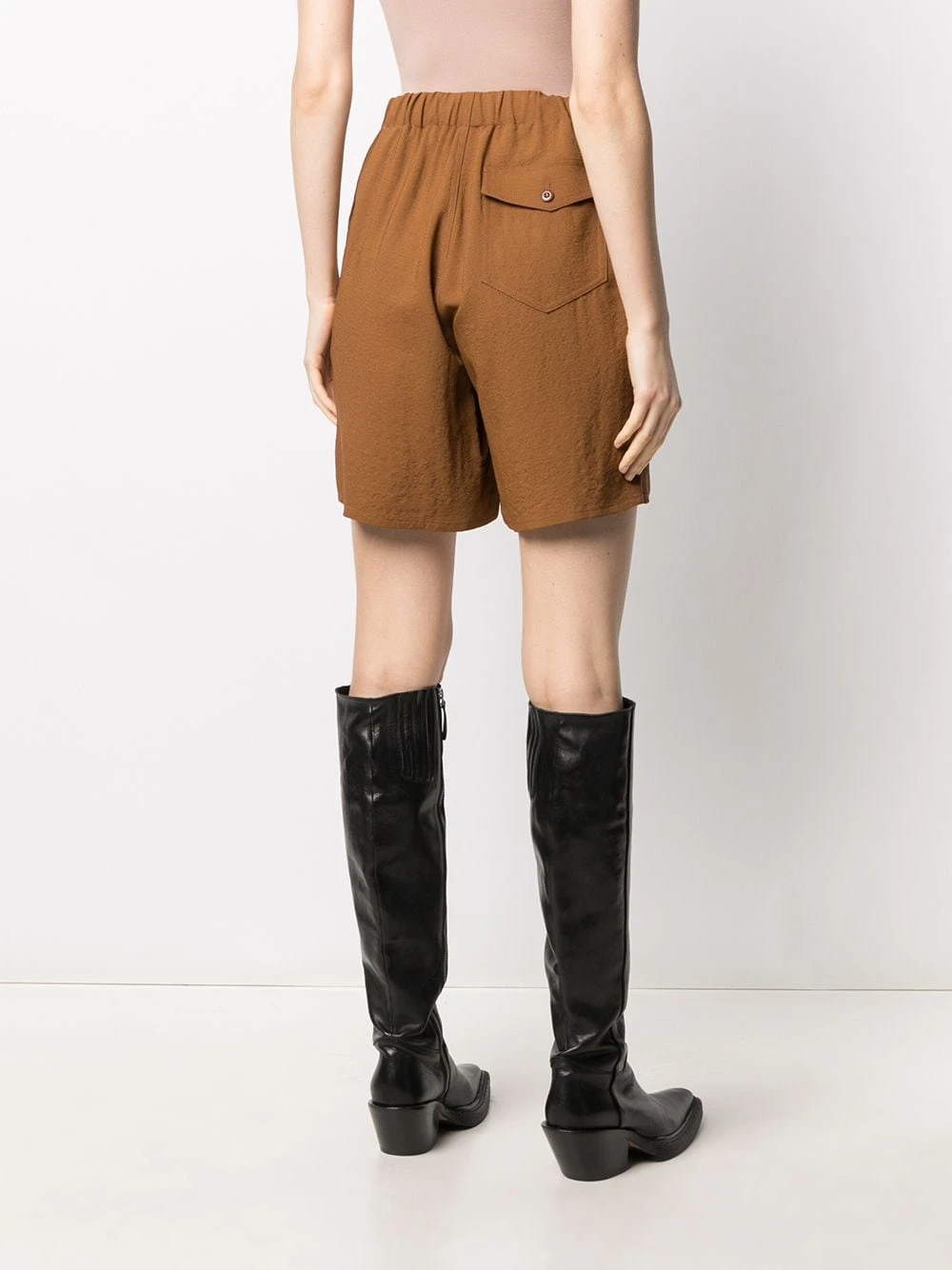 Taille haute, ceinture élastique, poches latérales fendues, longueur genou, poche arrière à rabat. Couleur : marron.