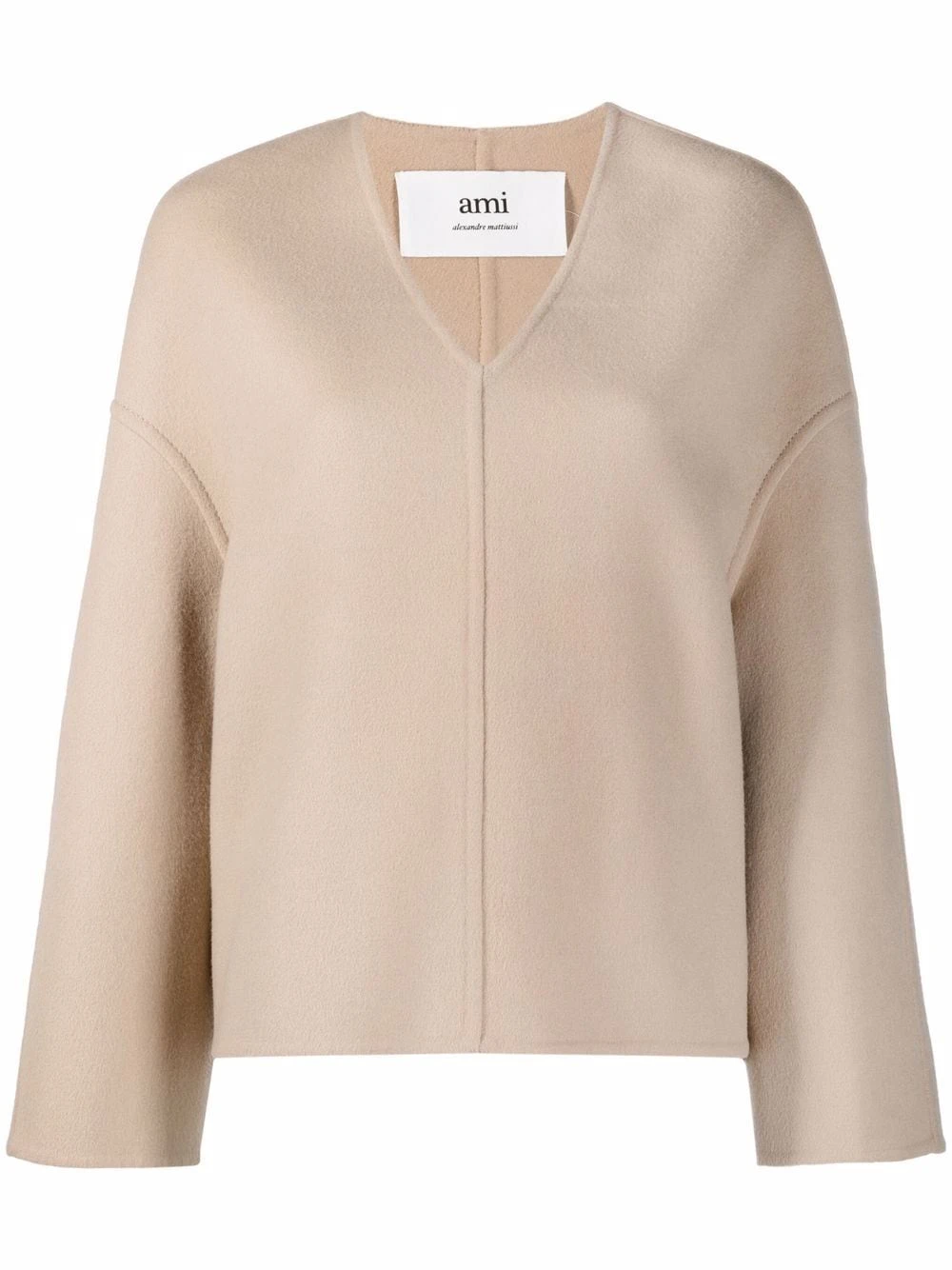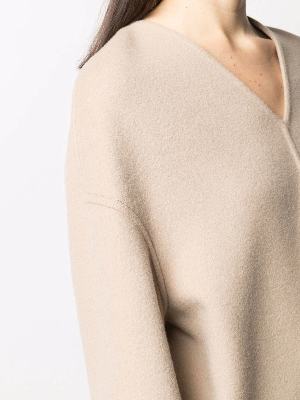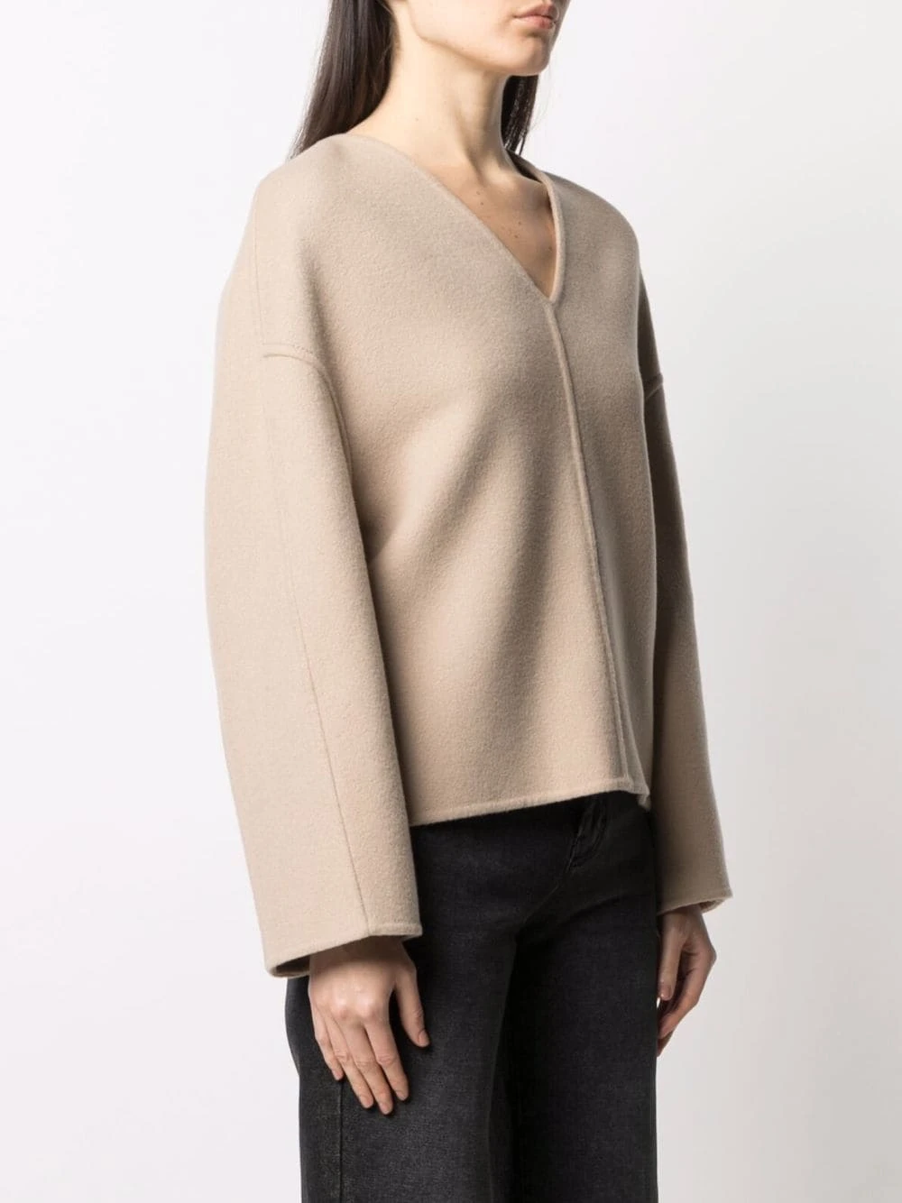 Col v, effet d’épaules descendues, manches longues, coutures ton sur ton, ourlet droit. Matière : laine vierge.