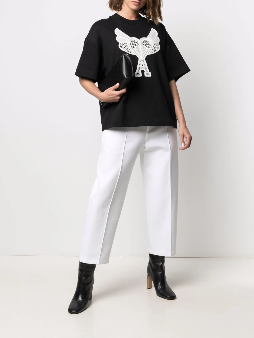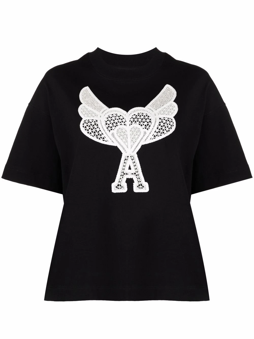 Encolure ronde, logo Ami de Coeur signature, détails en dentelle, manches courtes, ourlet droit. Couleur : noir. Matière : coton.