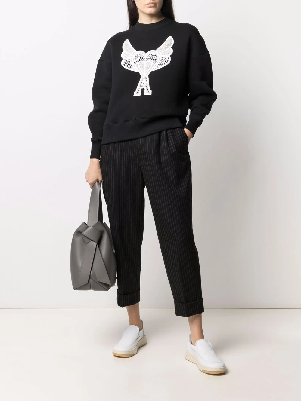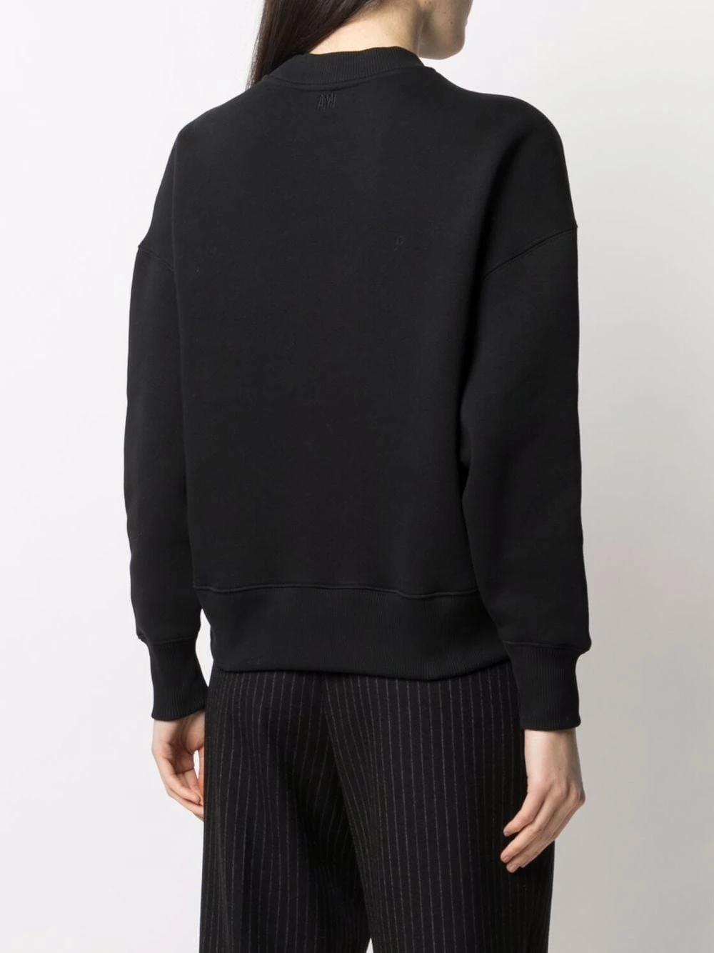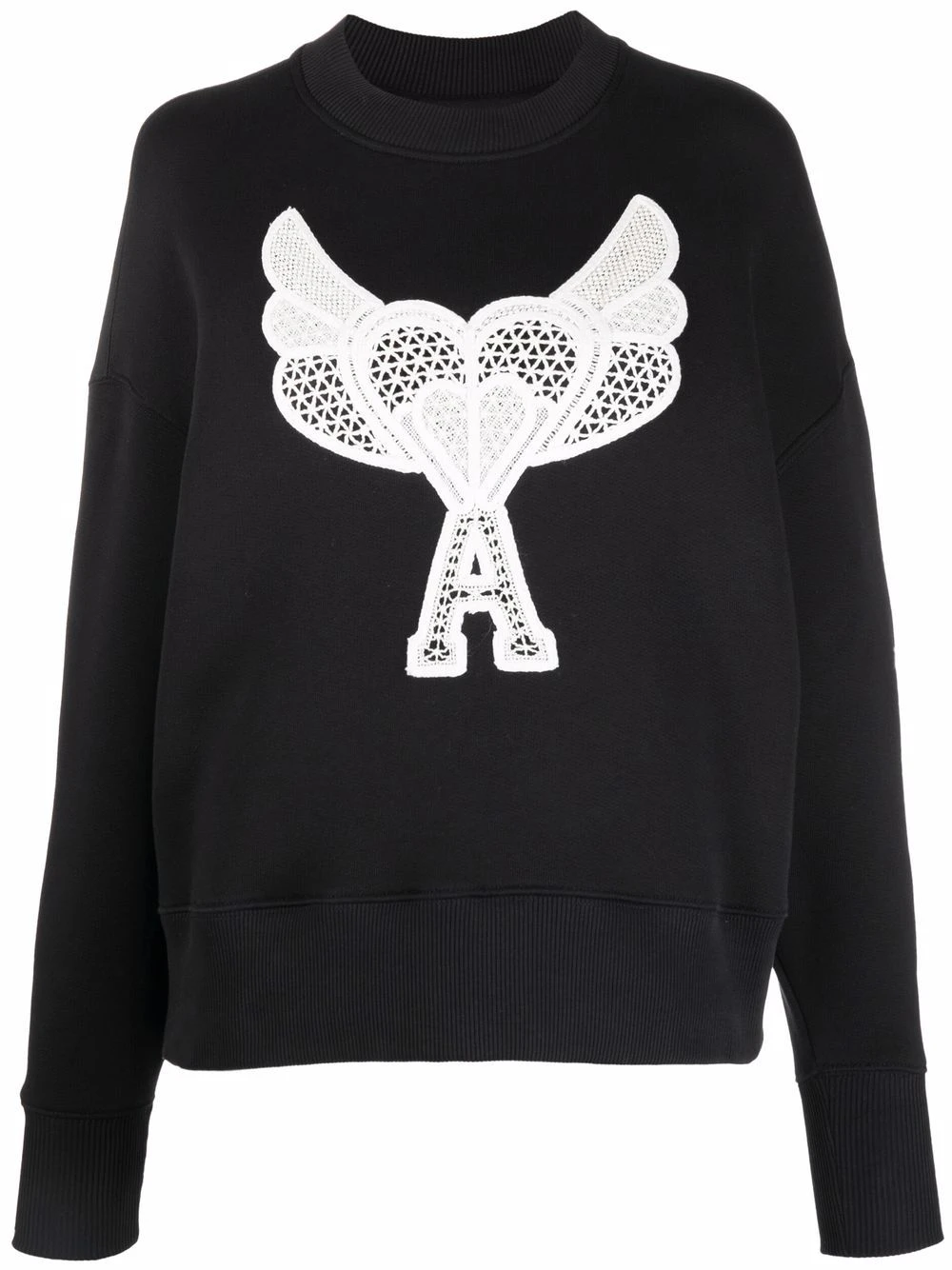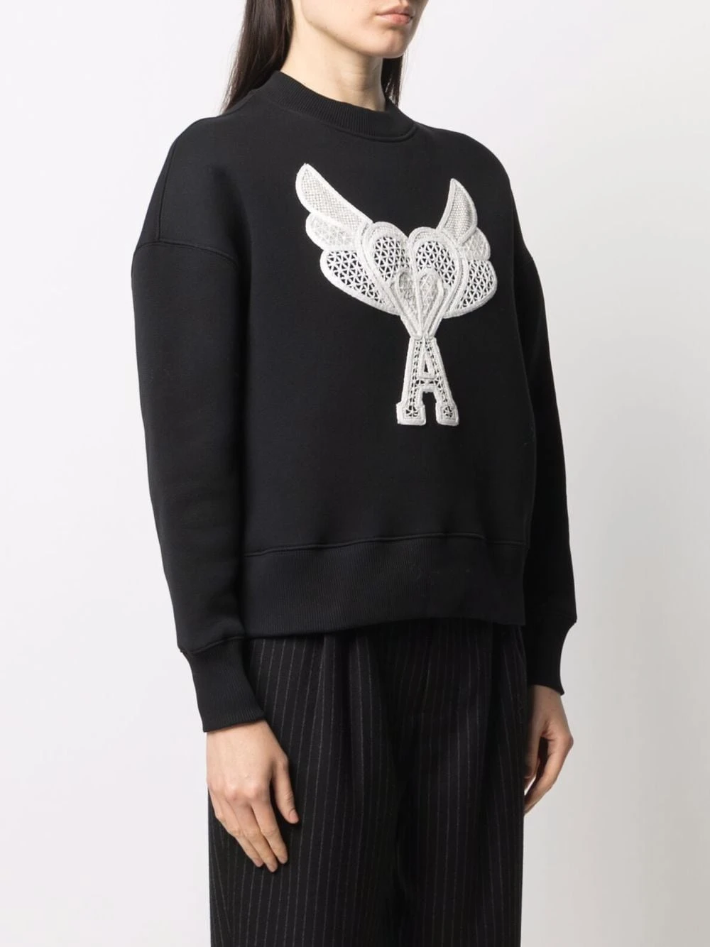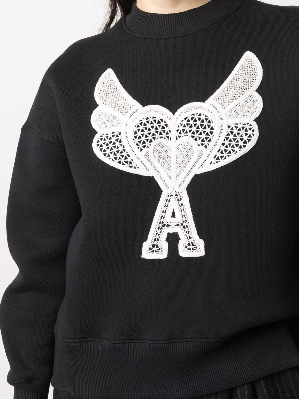 Encolure ras du cou, logo Ami de Coeur signature, détails en dentelle, manches longues, poignets nervurés, ourlet nervuré. Couleur : noir.