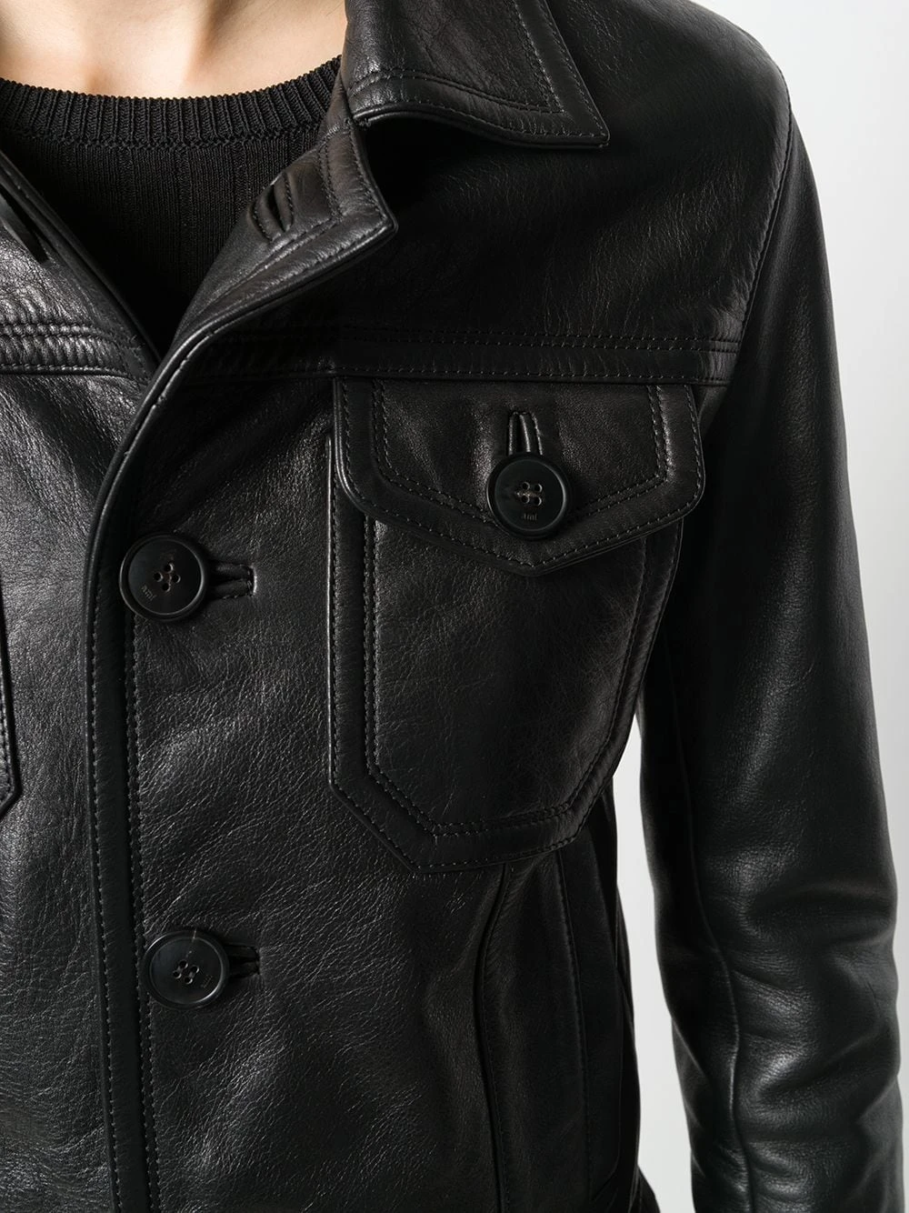Veste crop à poches poitrine en cuir de veau AMI Paris avec col classique, boutonnière sur le devant, manches longues, deux poches poitrine, poches devant et coupe crop. Couleur : noir.