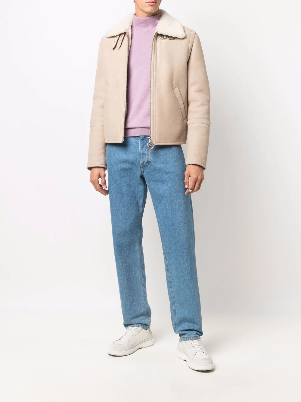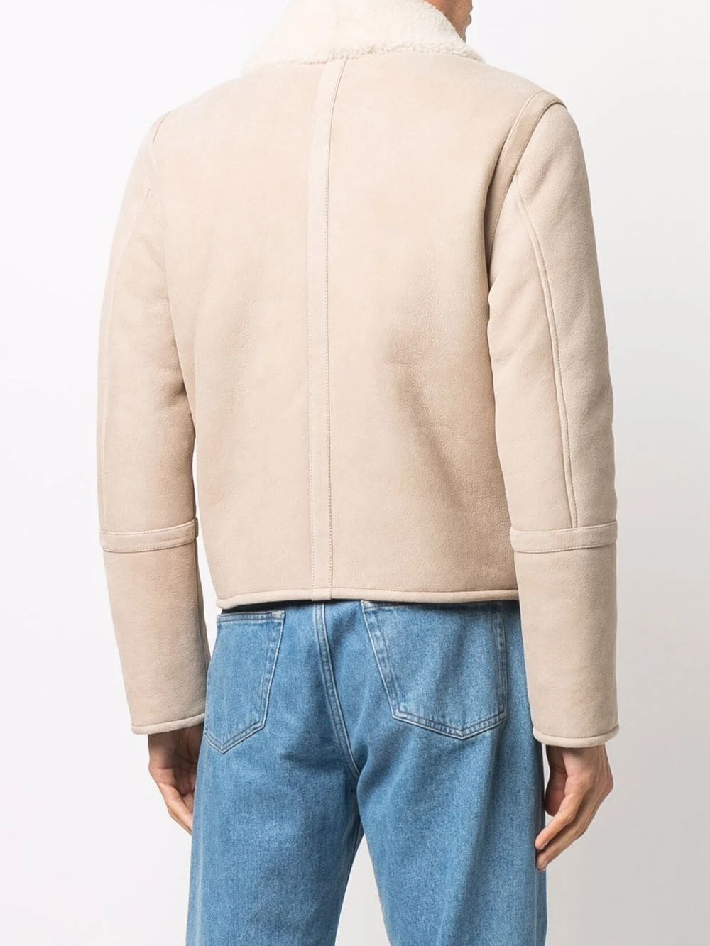 Col en peau lainée, fermeture à lanière à boucle, manches longues, fermeture zippée devant, deux poches passepoilées latérales, doublure en mouton retourné. Matière : peau de mouton.
