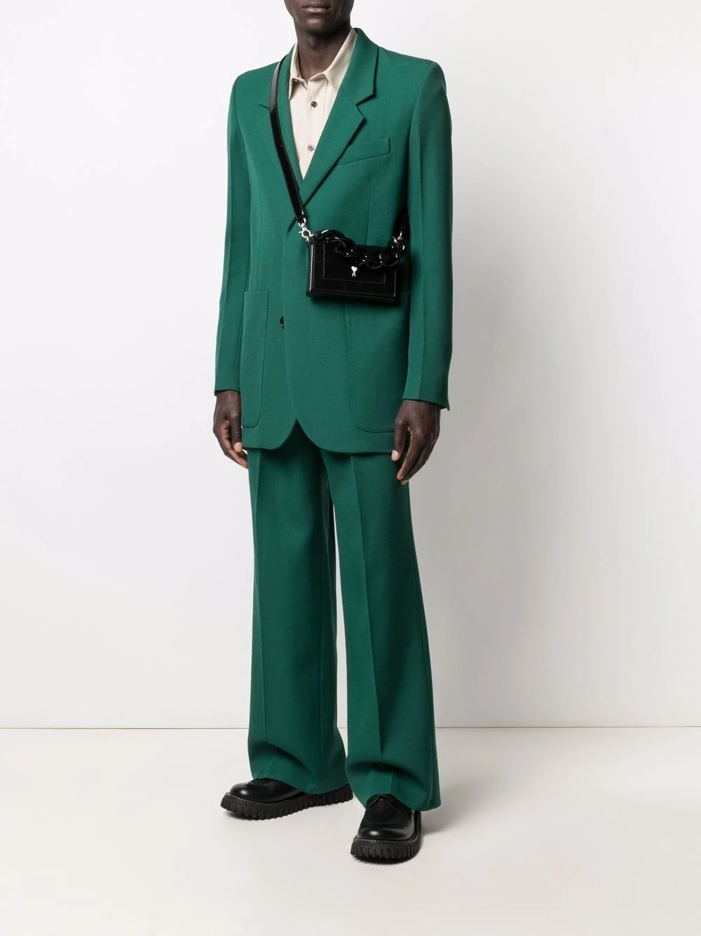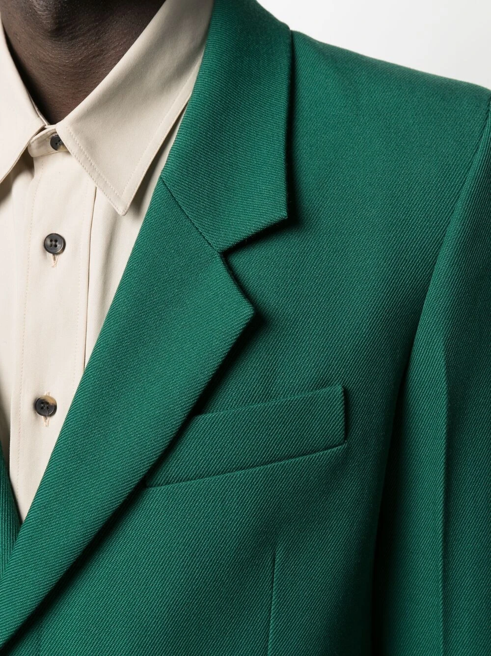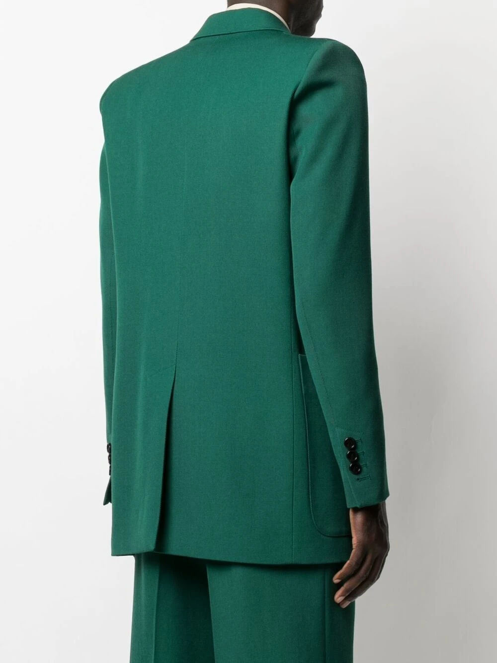 Revers crantés, boutonnière dissimulée sur le devant, manches longues, deux poches plaquées avant, doublure intégrale, fente arrière. Couleur : vert. Matière : laine vierge.