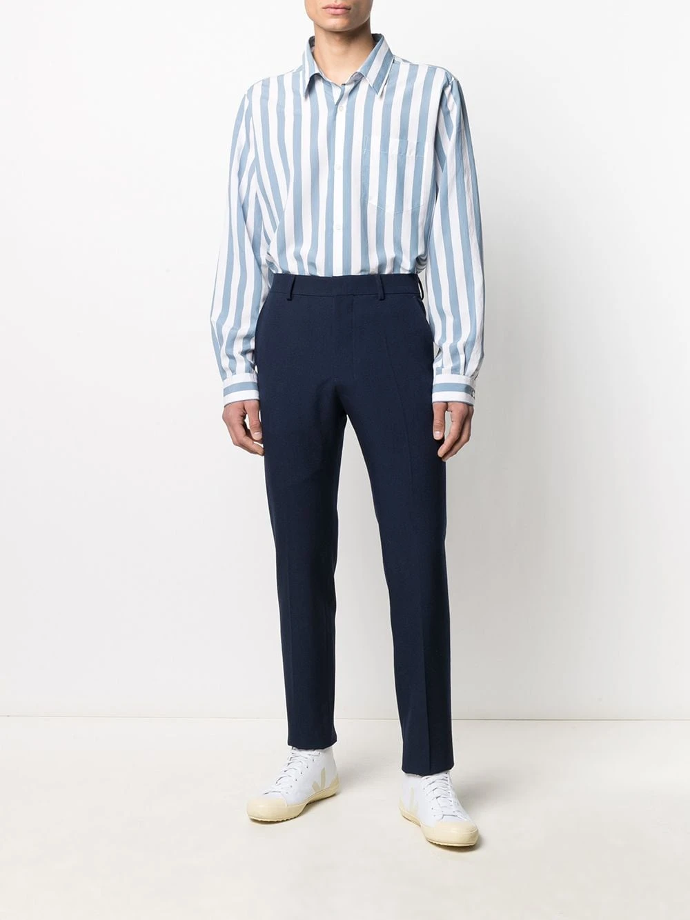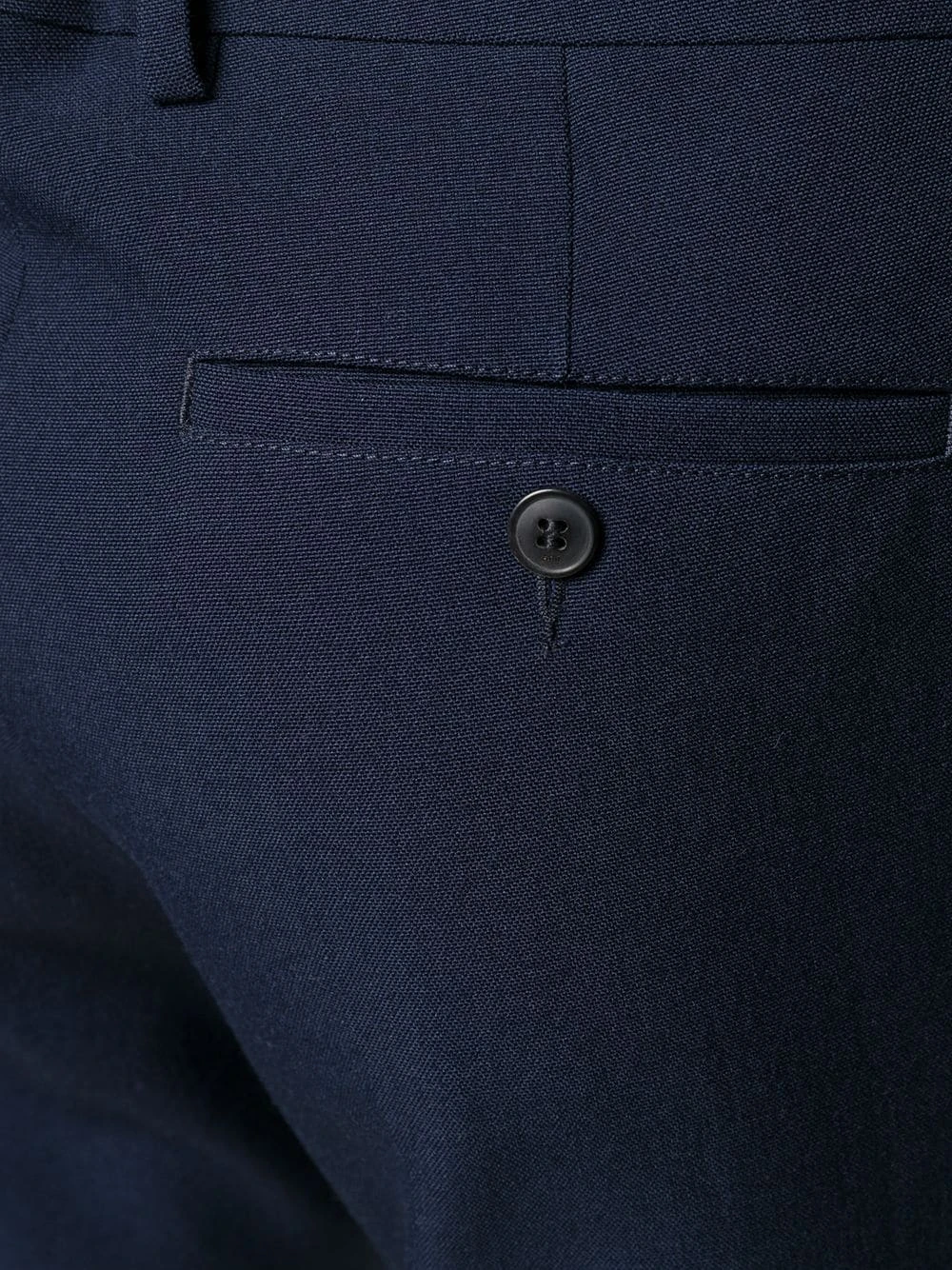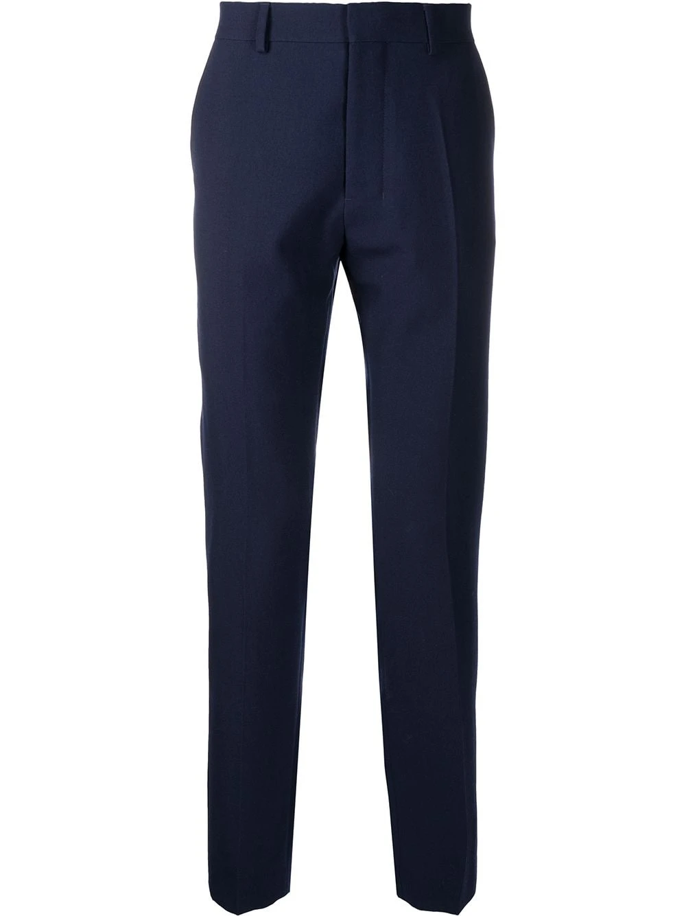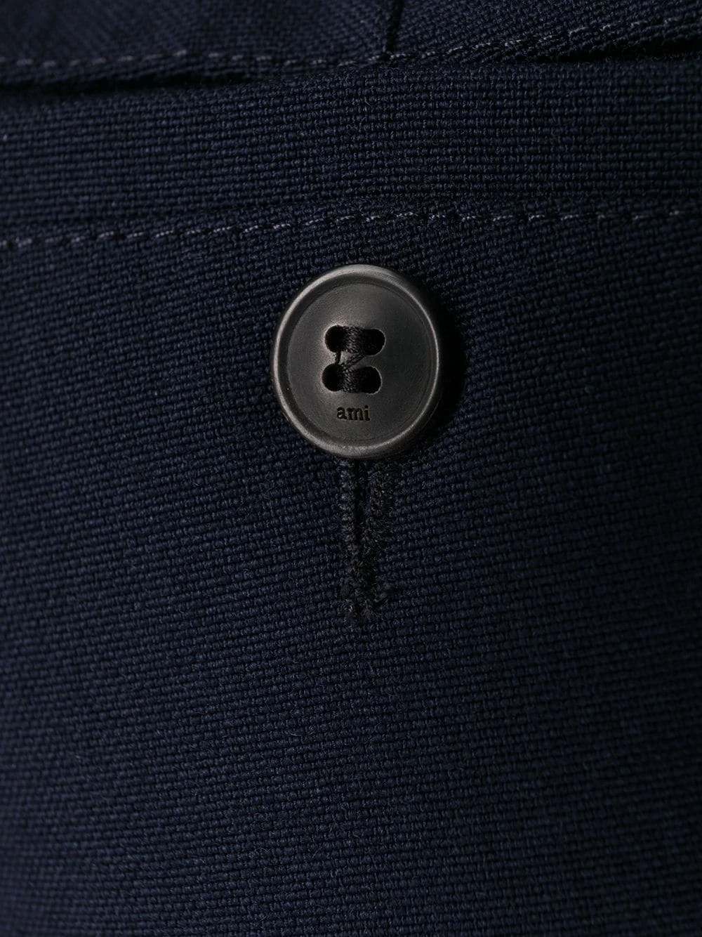 Pantalon de costume slim en laine AMI Paris avec agrafe et zip, passants de ceinture, poches latérales fendues, deux poches passepoilées boutonnées au dos et coupe slim.