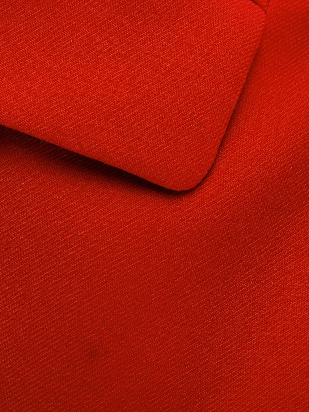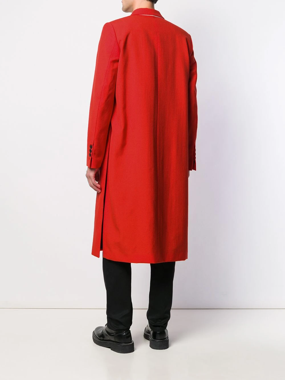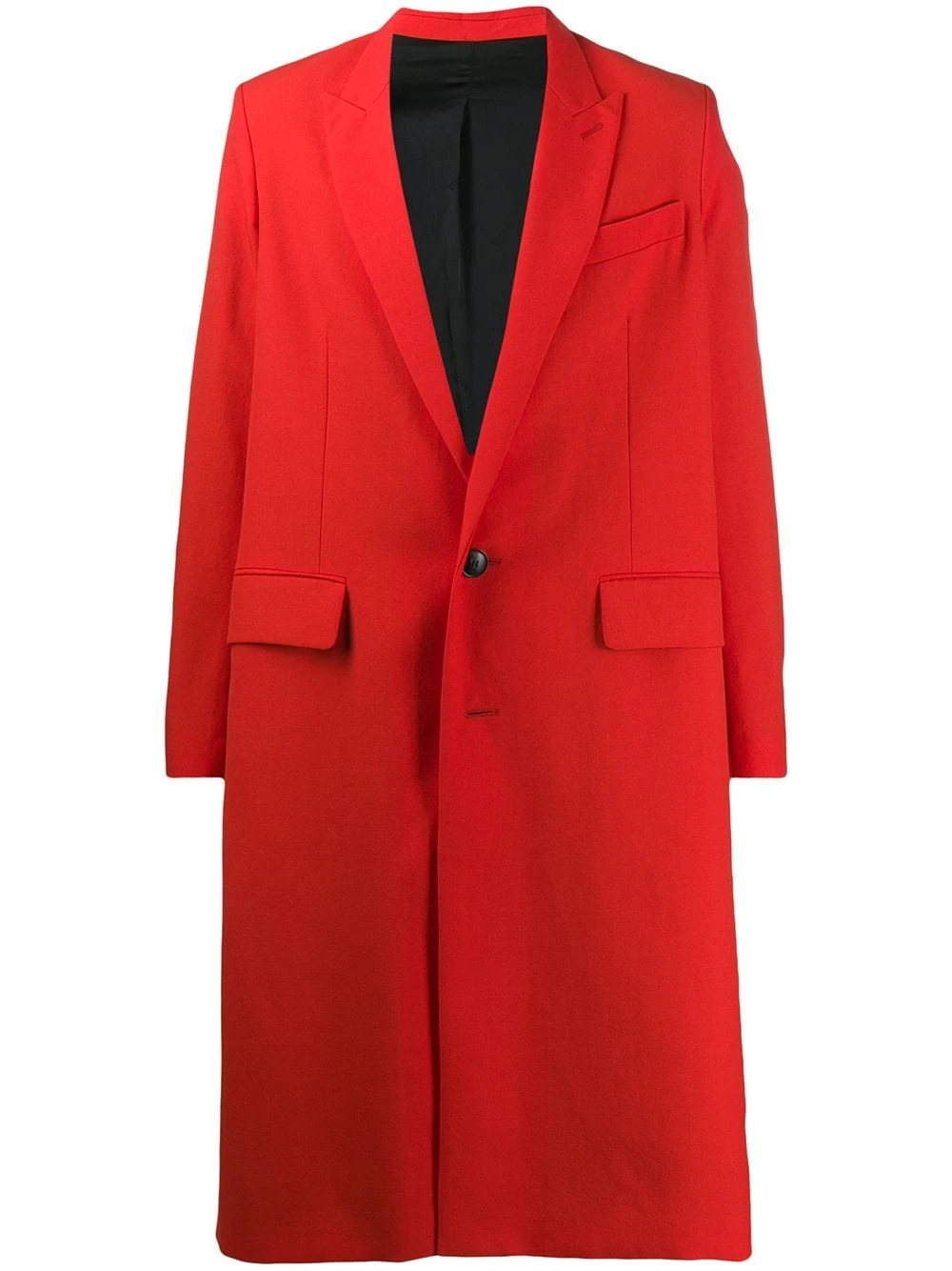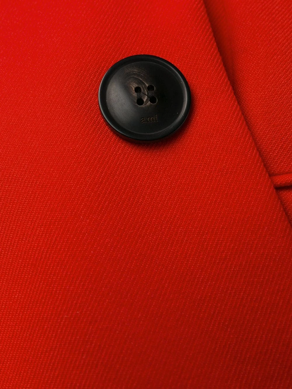 Manteau long boutonné en laine vierge AMI Paris avec col à revers crantés, boutonnière sur le devant, manches longues, poche poitrine, poches devant à rabat, fentes latérales et longueur medium. Couleur : rouge.