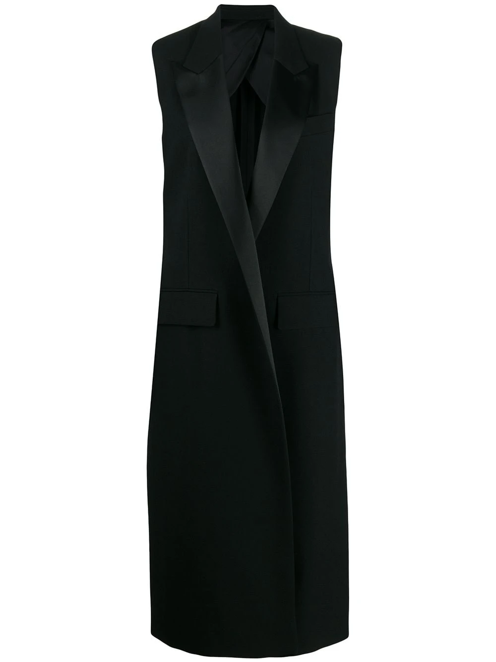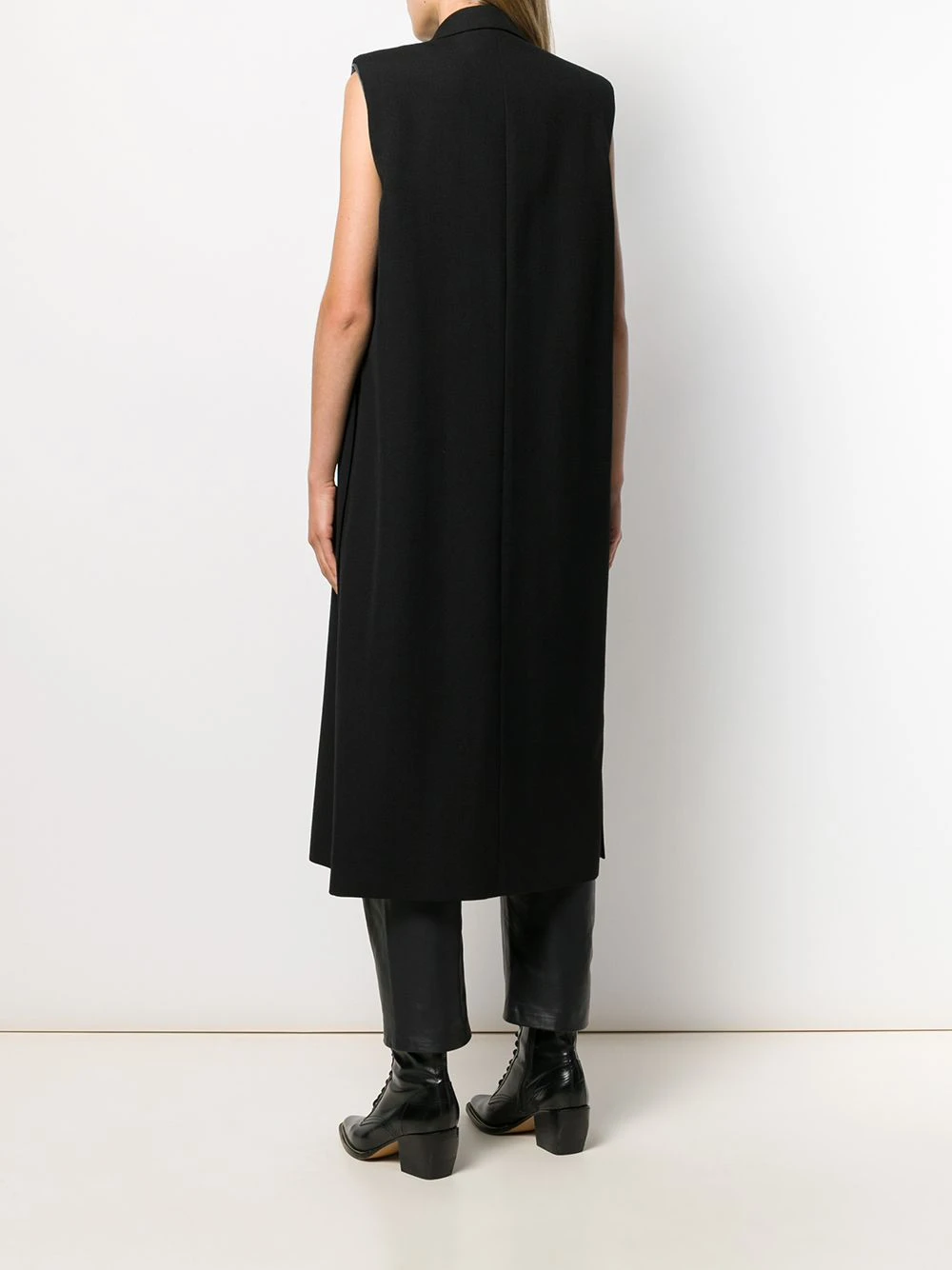 Veston long AMI Paris avec revers crantés, un design sans manches, poches devant et coupe longue. Couleur : noir.