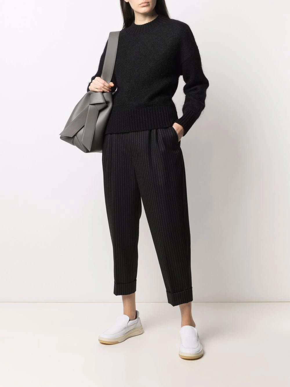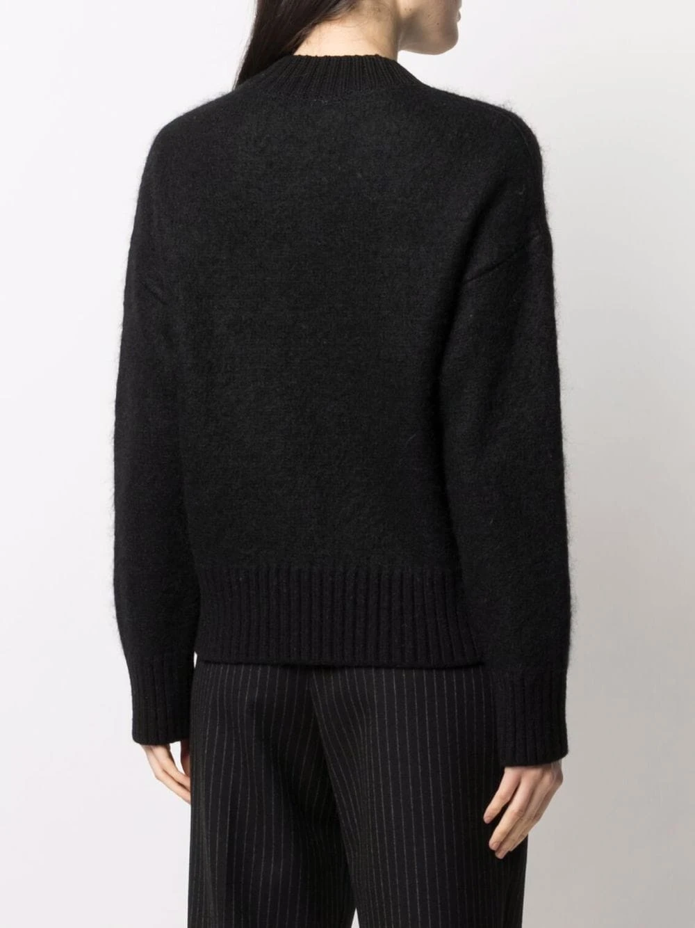 Design tricoté, encolure ras du cou, manches longues, poignets nervurés, ourlet nervuré. Couleur : noir. Matière : laine.