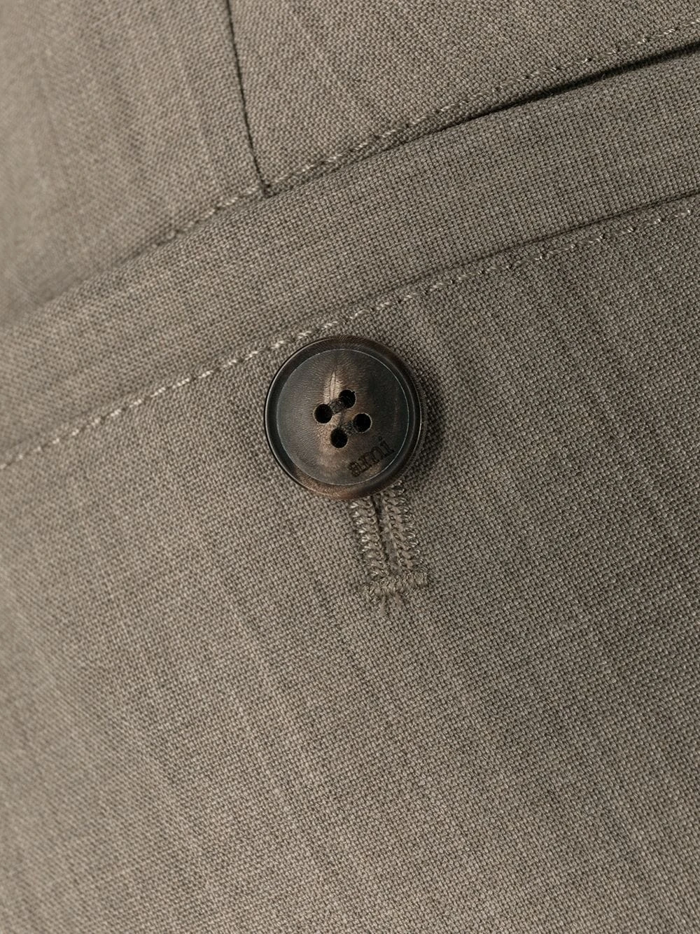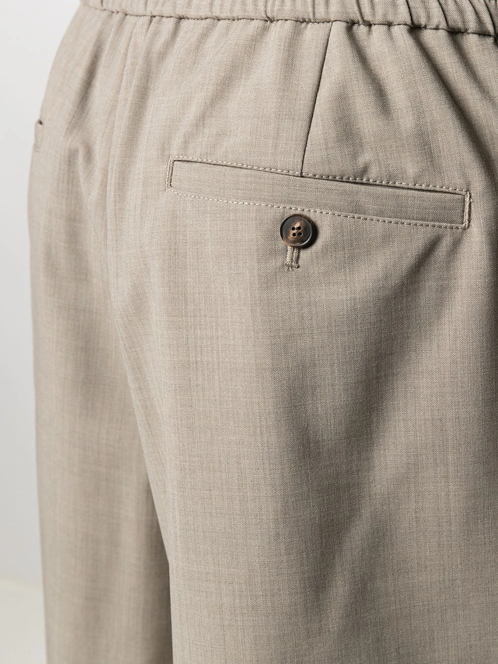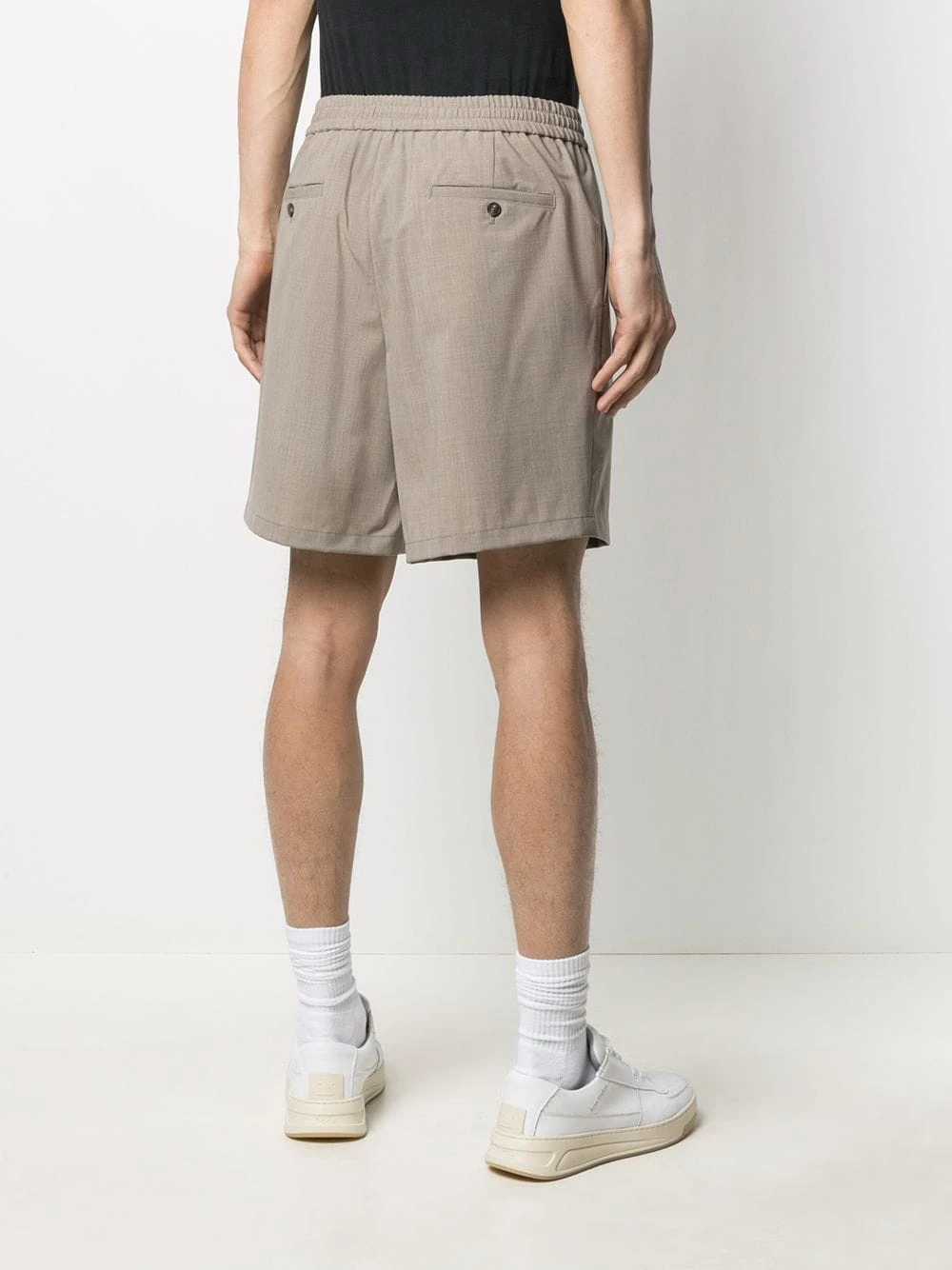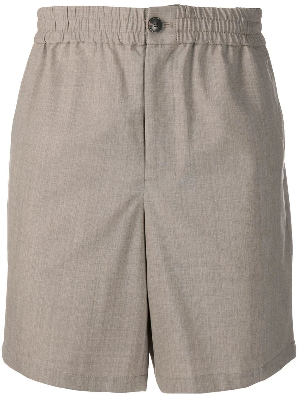 Bermuda à taille élastiquée en laine AMI Paris avec ceinture élastique, boutonnière sur le devant, poches latérales fendues et deux poches passepoilées boutonnées au dos.