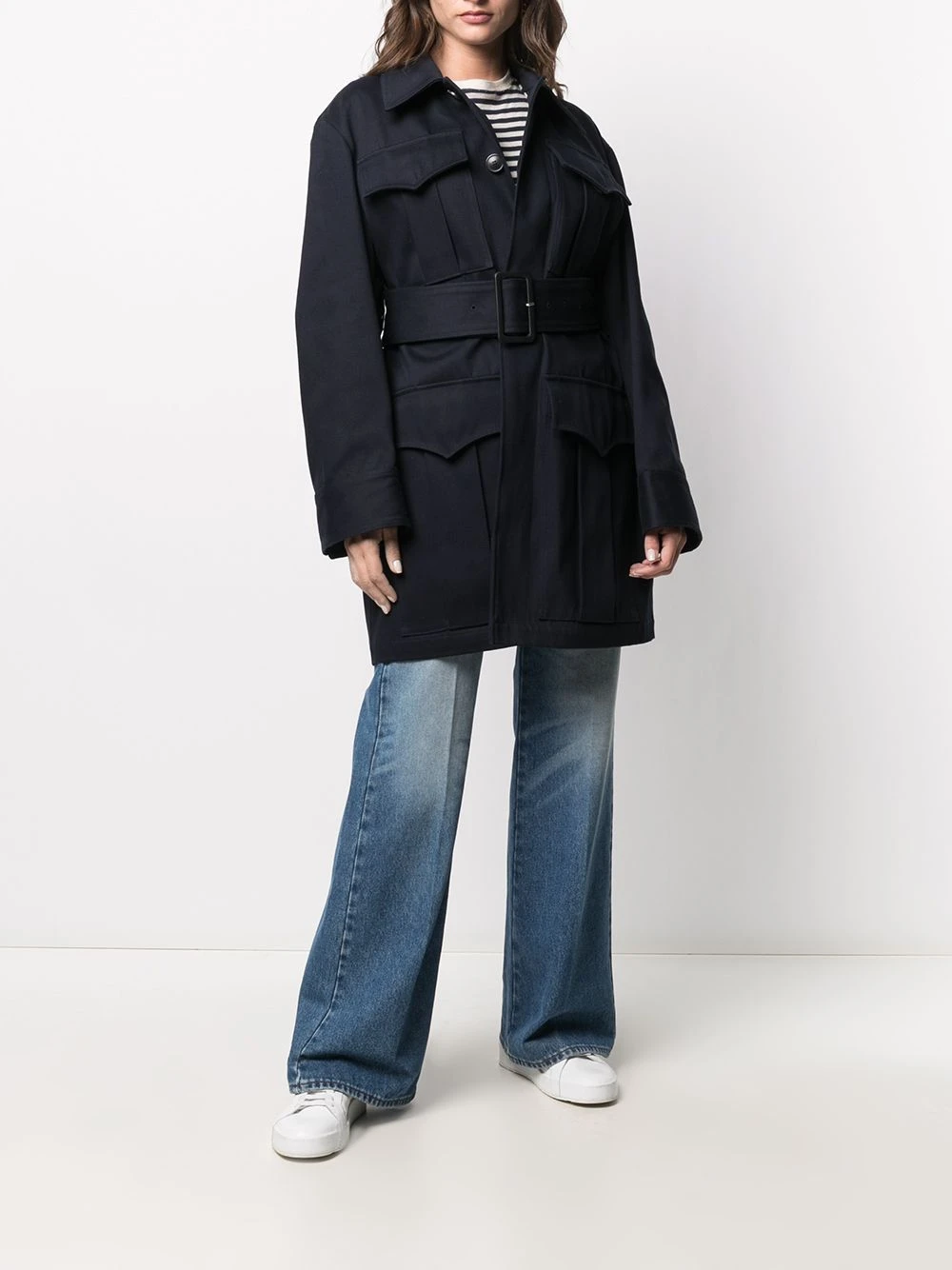 Patch logo sur l’arrière, coupe évasée, taille haute, passants de ceinture, fermeture à zip et boutons sur le devant, 5 poches classiques. Matière : coton.