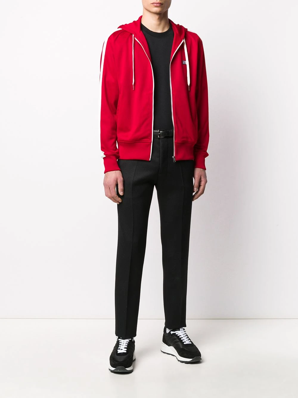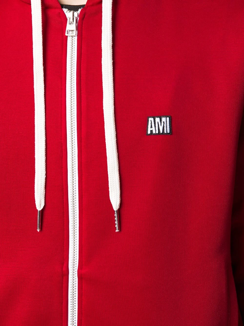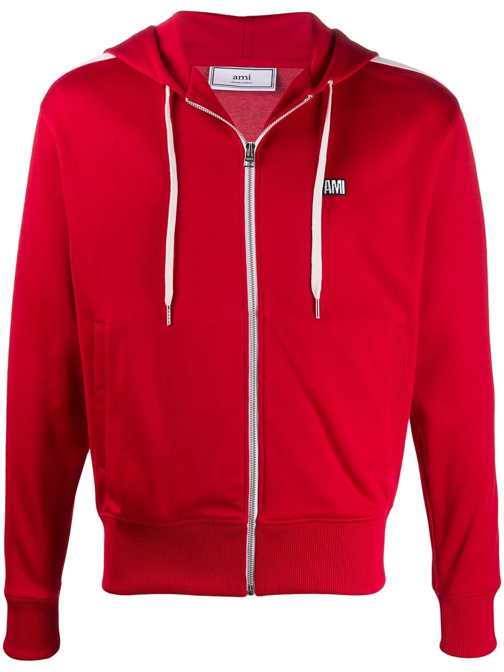 Patch logo sur le devant, capuche souple à lien de resserrage, fermeture zippée devant, deux poches latérales passepoilées, manches longues. Couleur : rouge. Matière : COTON MÉLANGÉ.