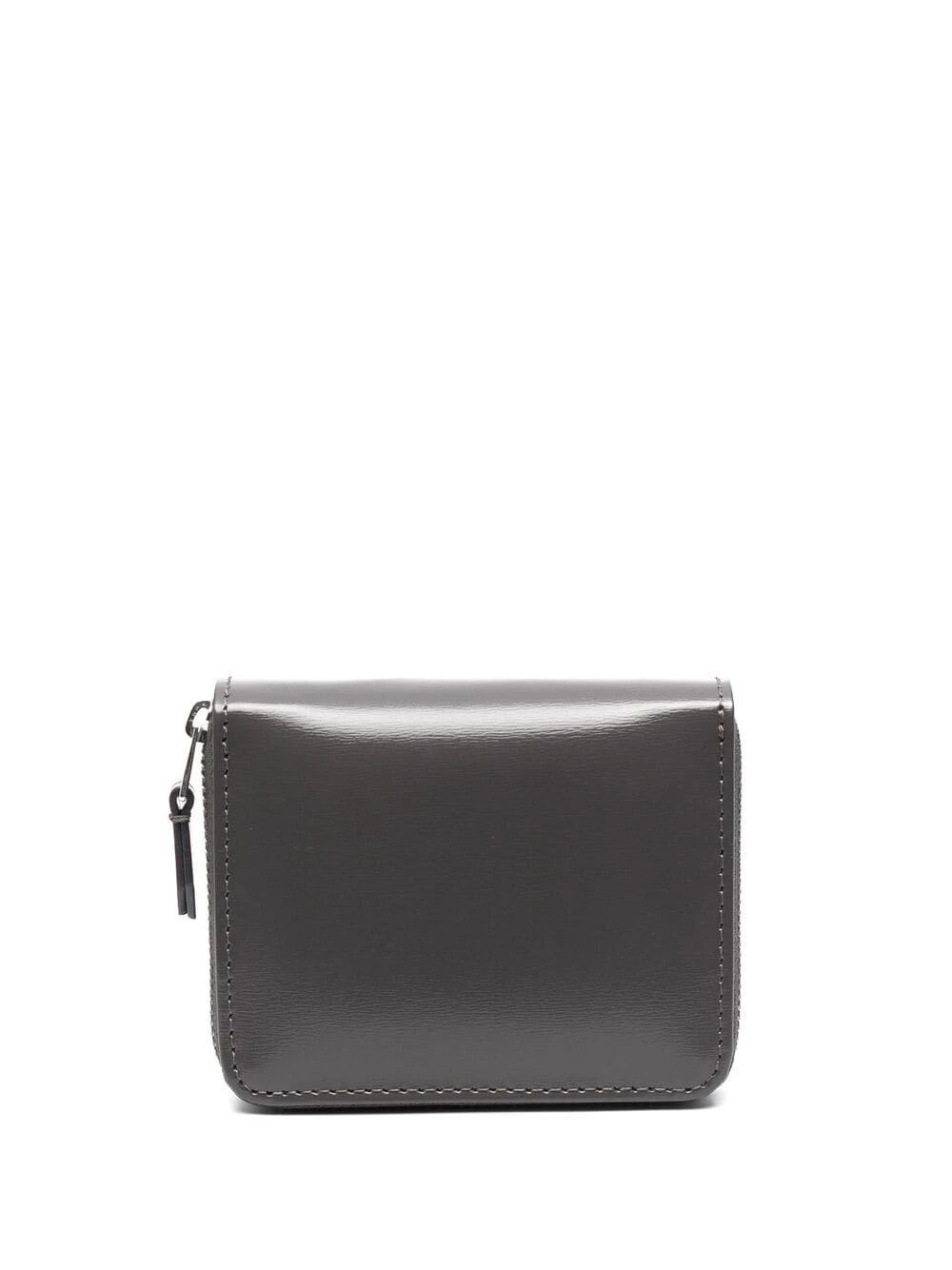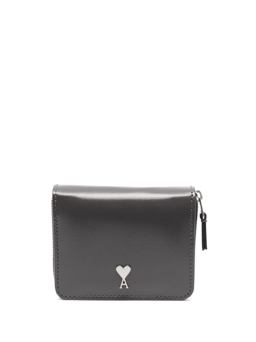 Ornements argentés, fermeture à boutons pression, compartiment à billets, compartiments intérieurs pour carte. Couleur : gris. Matière : cuir.