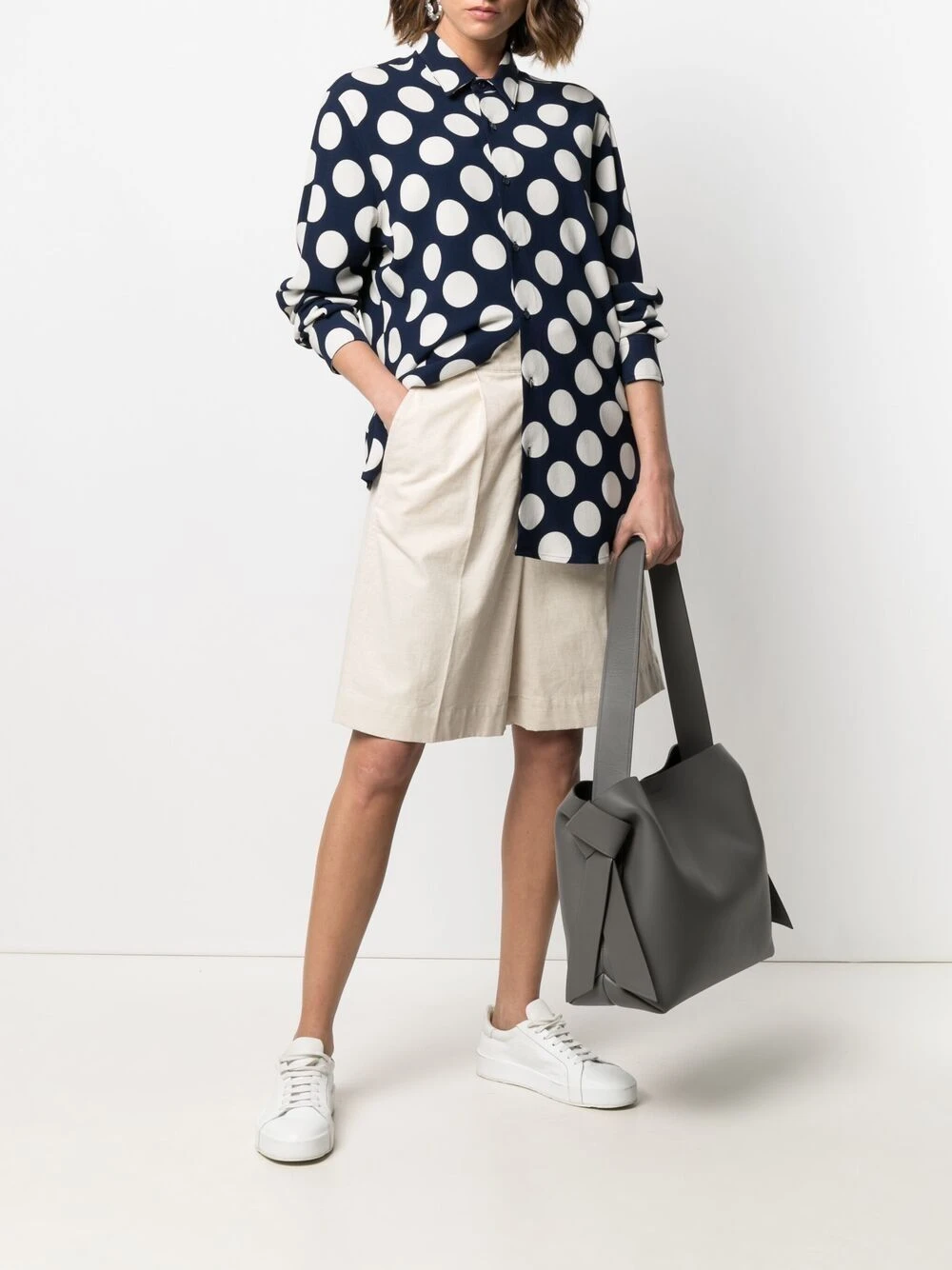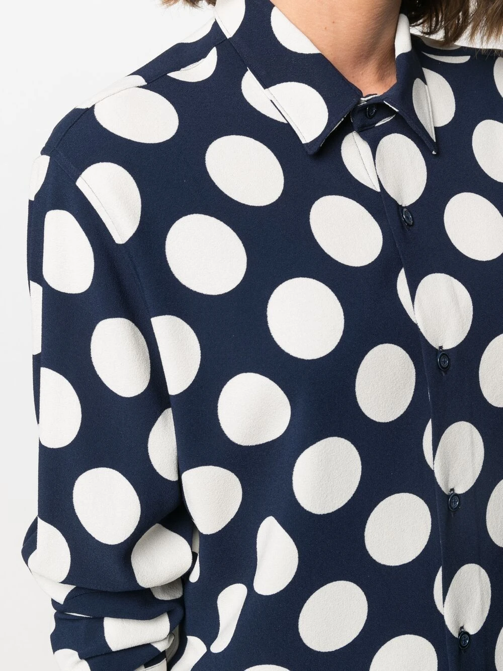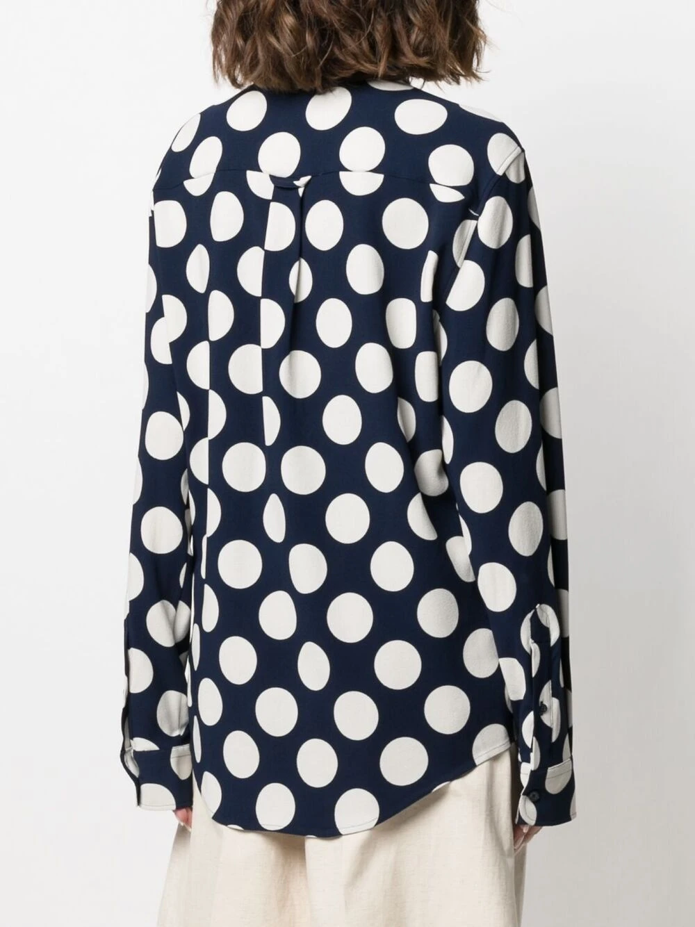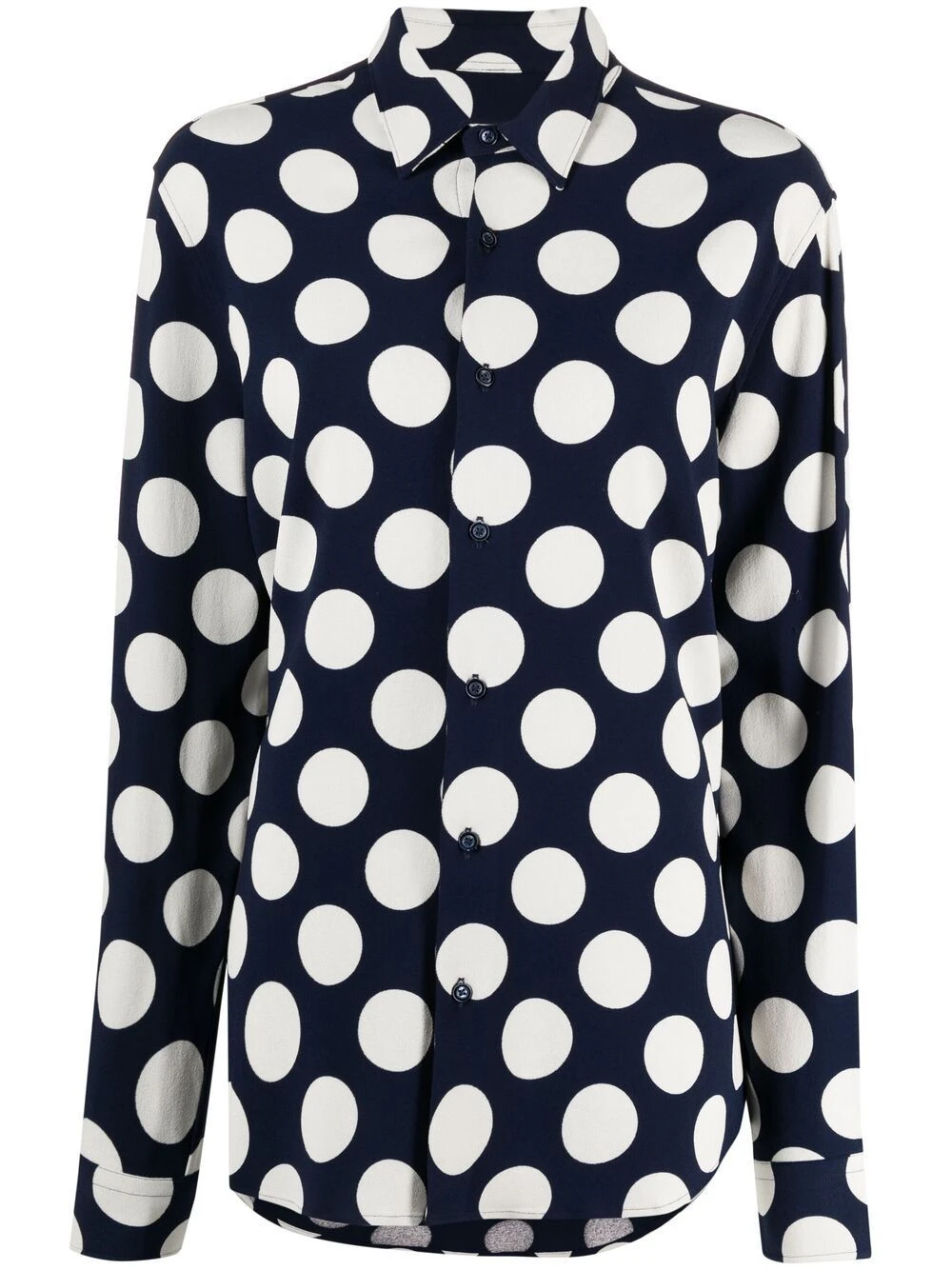 Col cranté, boutonnière sur le devant, manches longues, imprimé à pois.