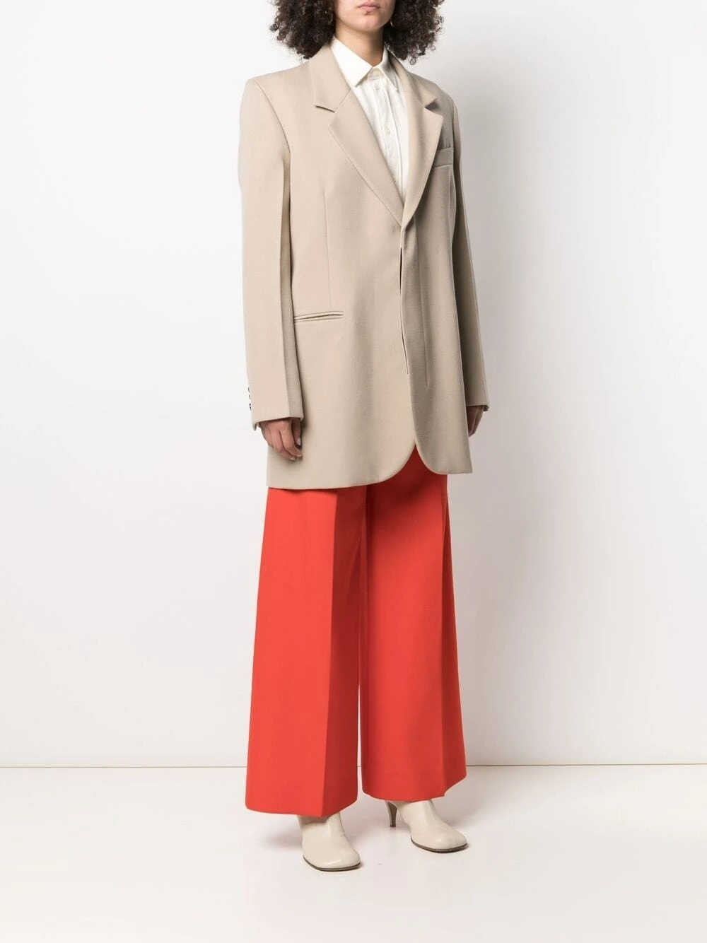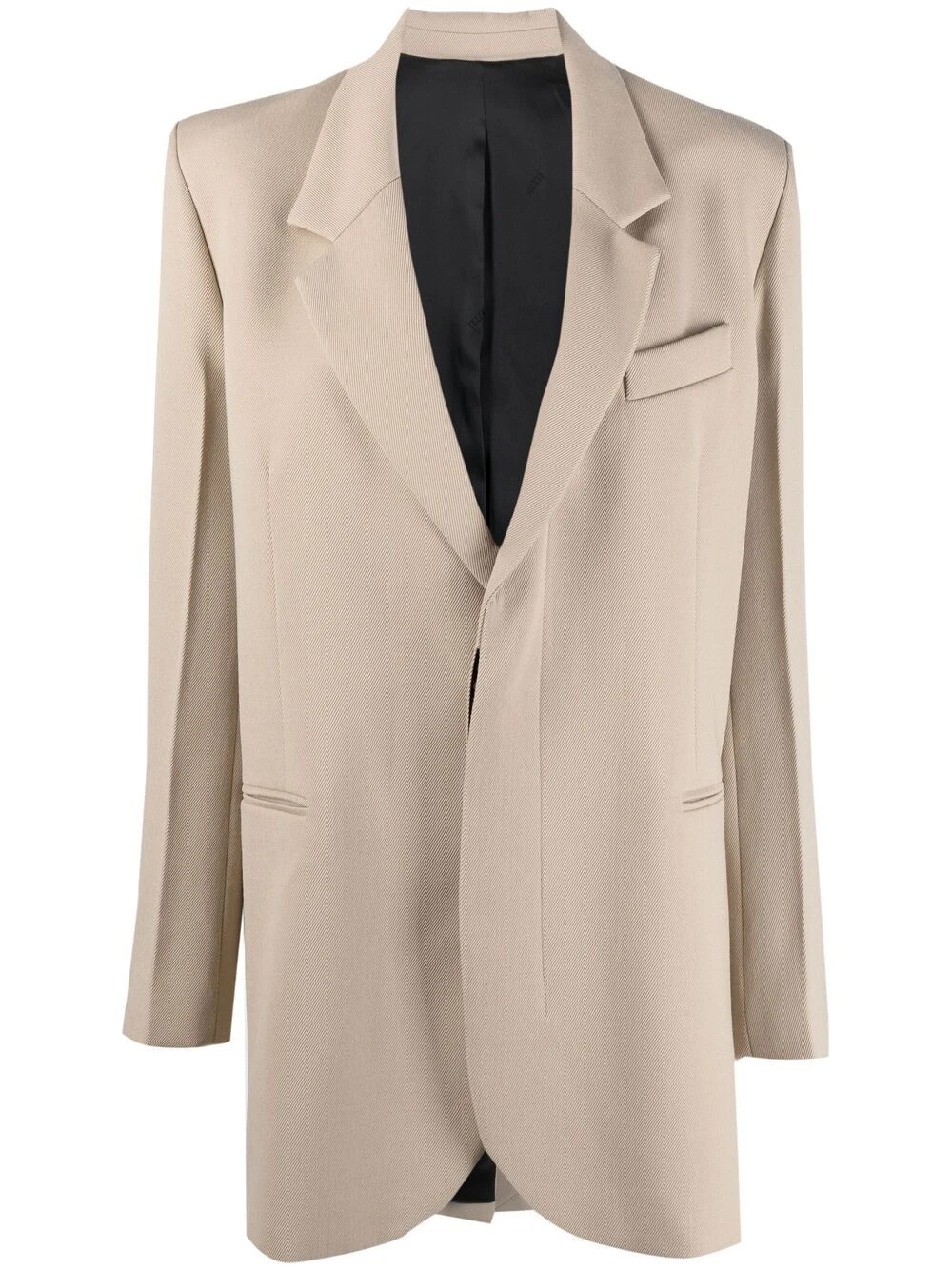Revers crantés, épaulettes, boutonnière sur le devant, manches longues, poche passepoilée sur la poitrine, deux poches passepoilées avant, coupe longue, fente arrière. Matière : laine vierge.