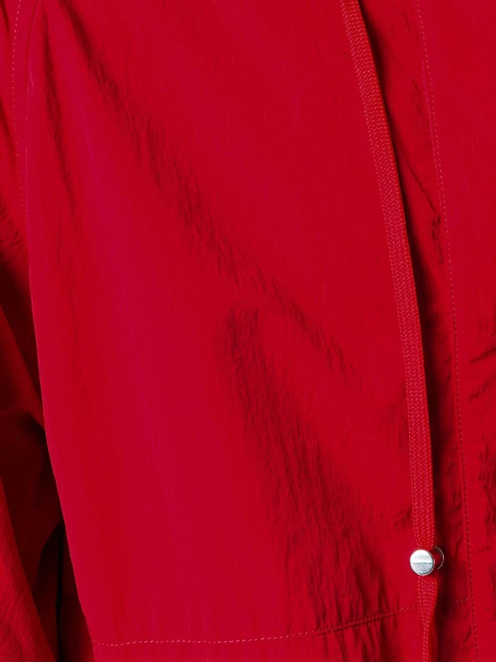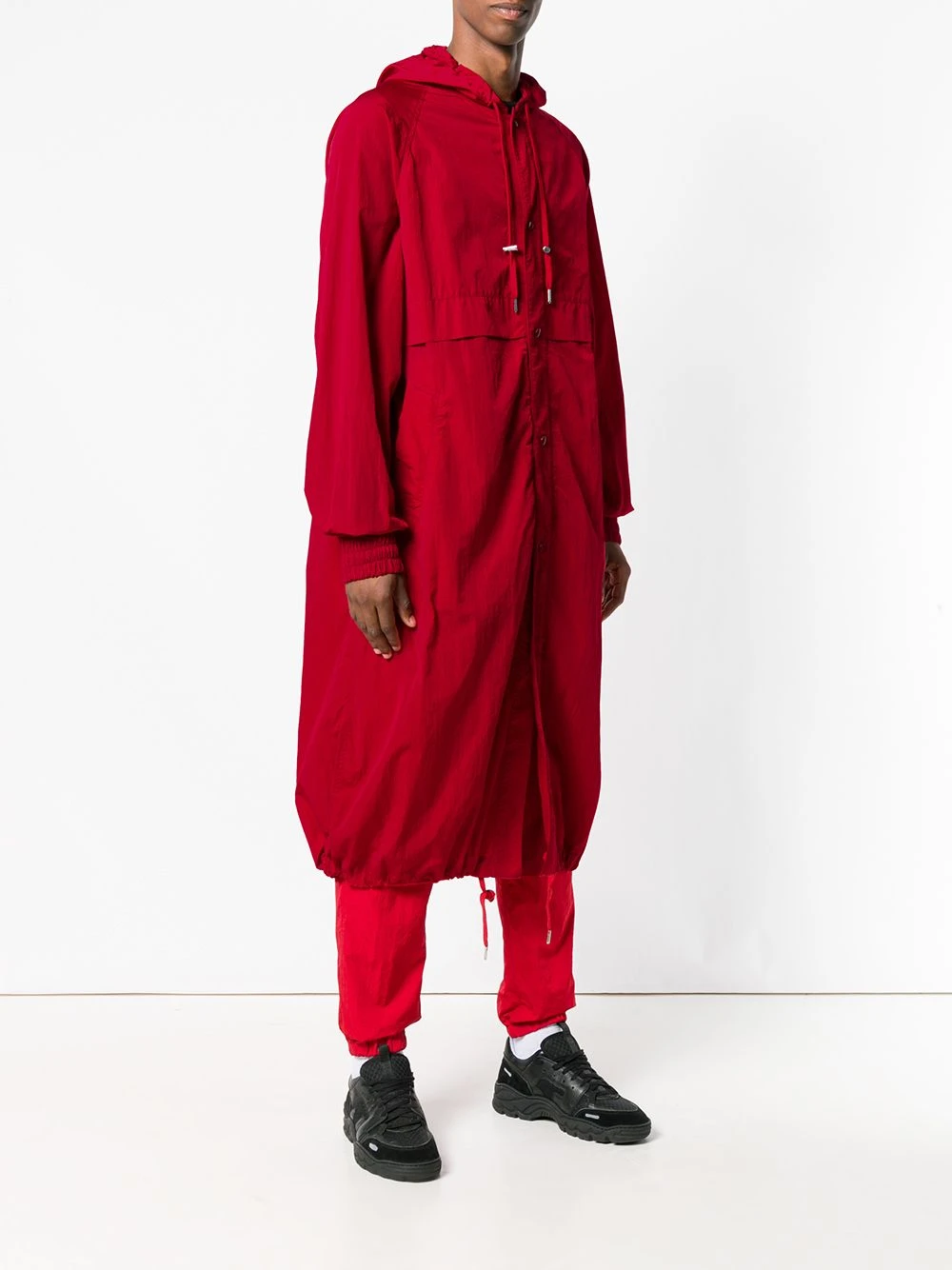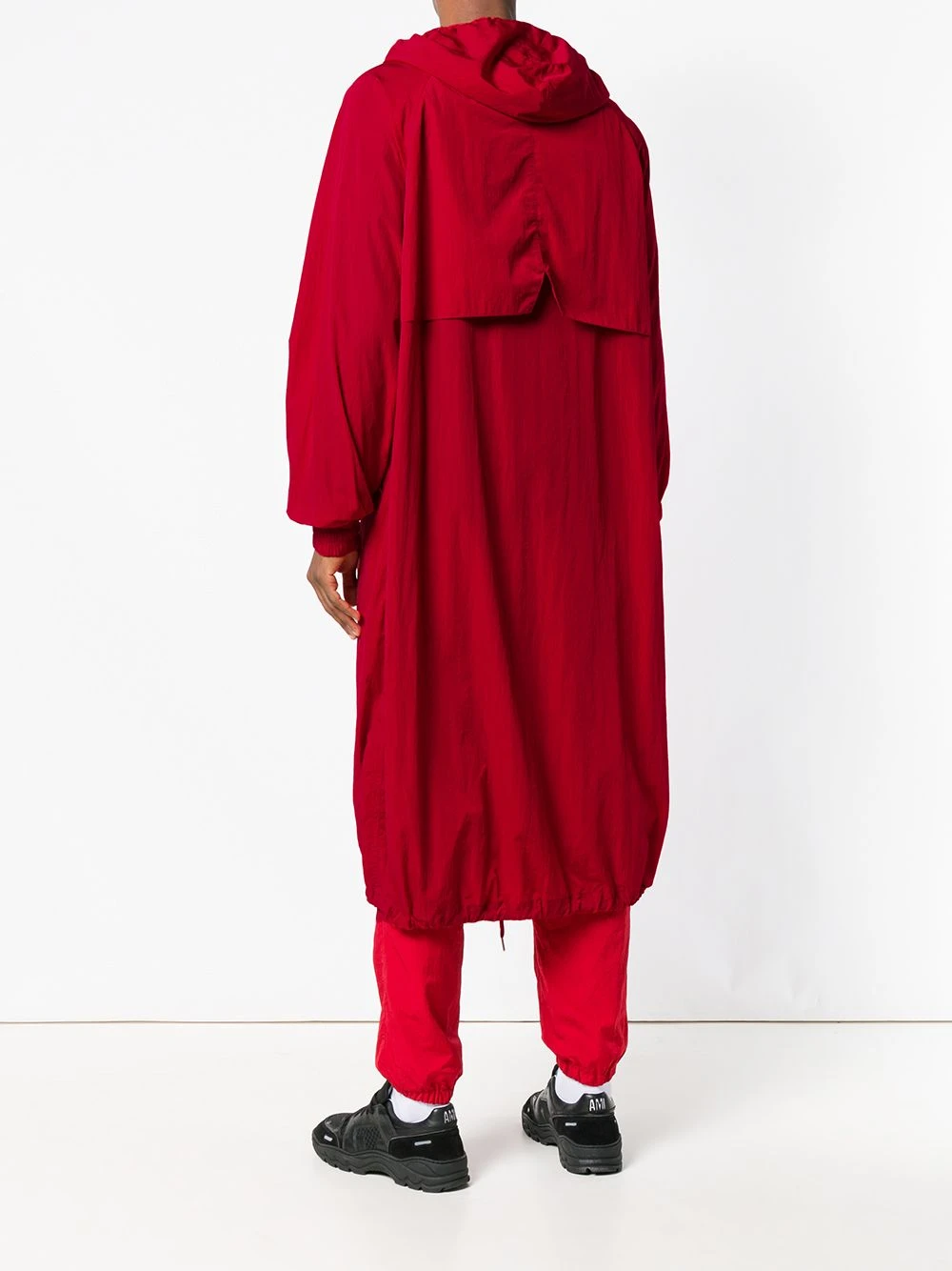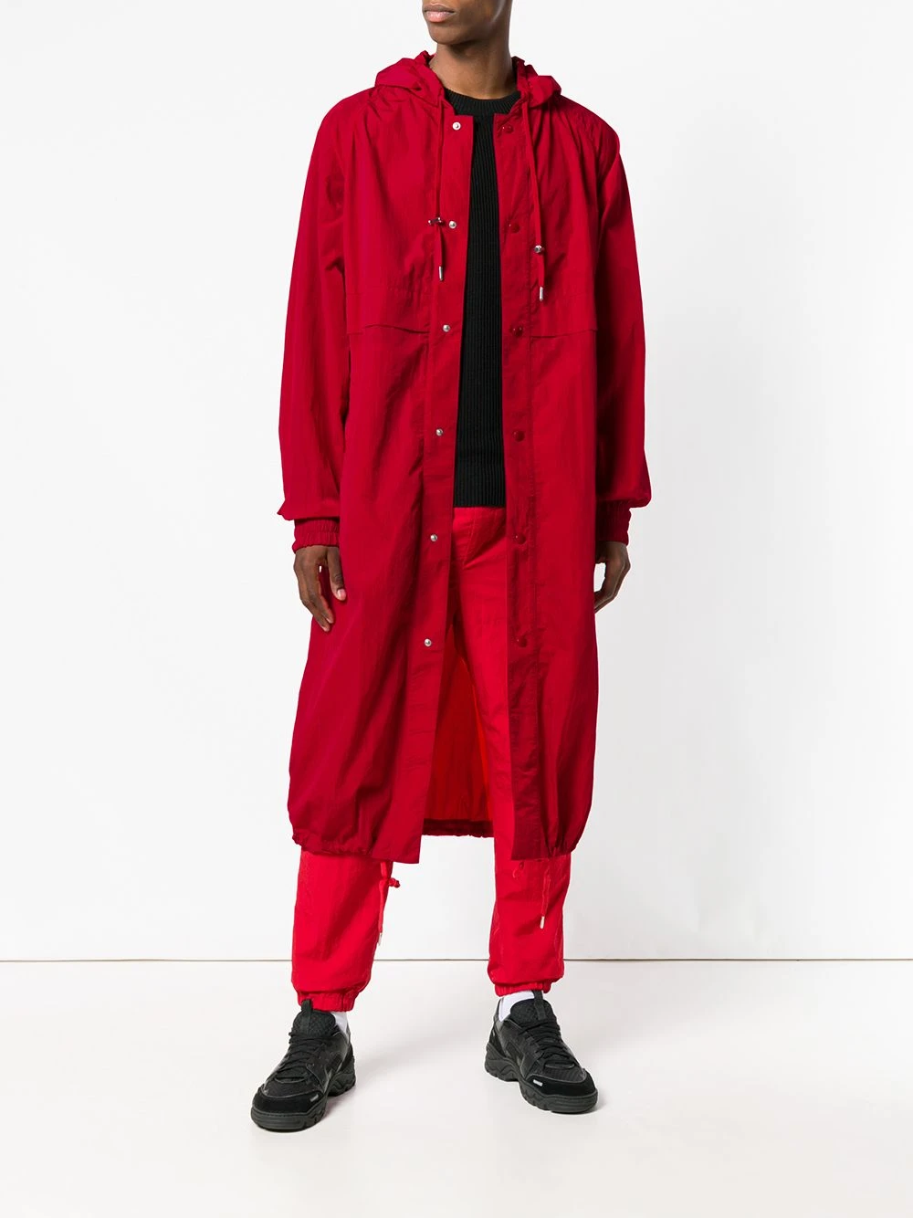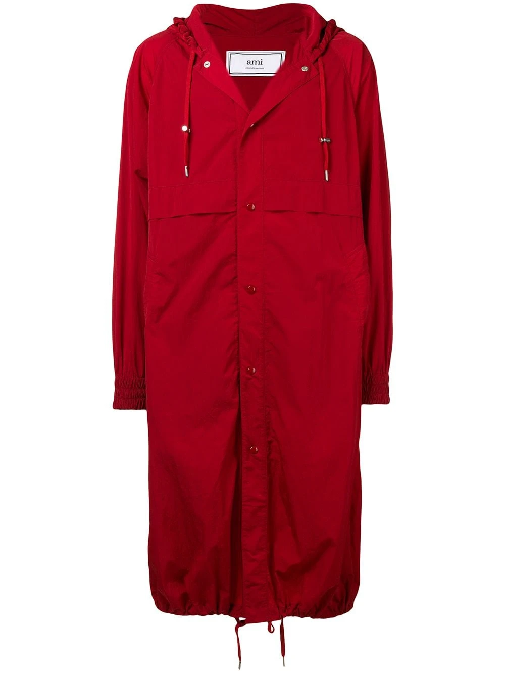 Coupe-vent long à capuche Ami Alexandre Mattiussi avec coupe droite, longueur mi-mollet, fermeture à boutons pression, poignets élastiqués, capuche à lien de resserrage et ourlet à lien de resserrage. Couleur : rouge.
