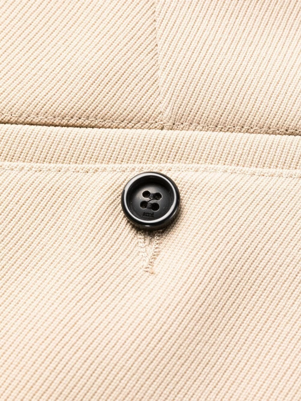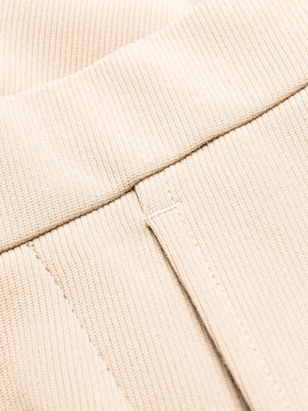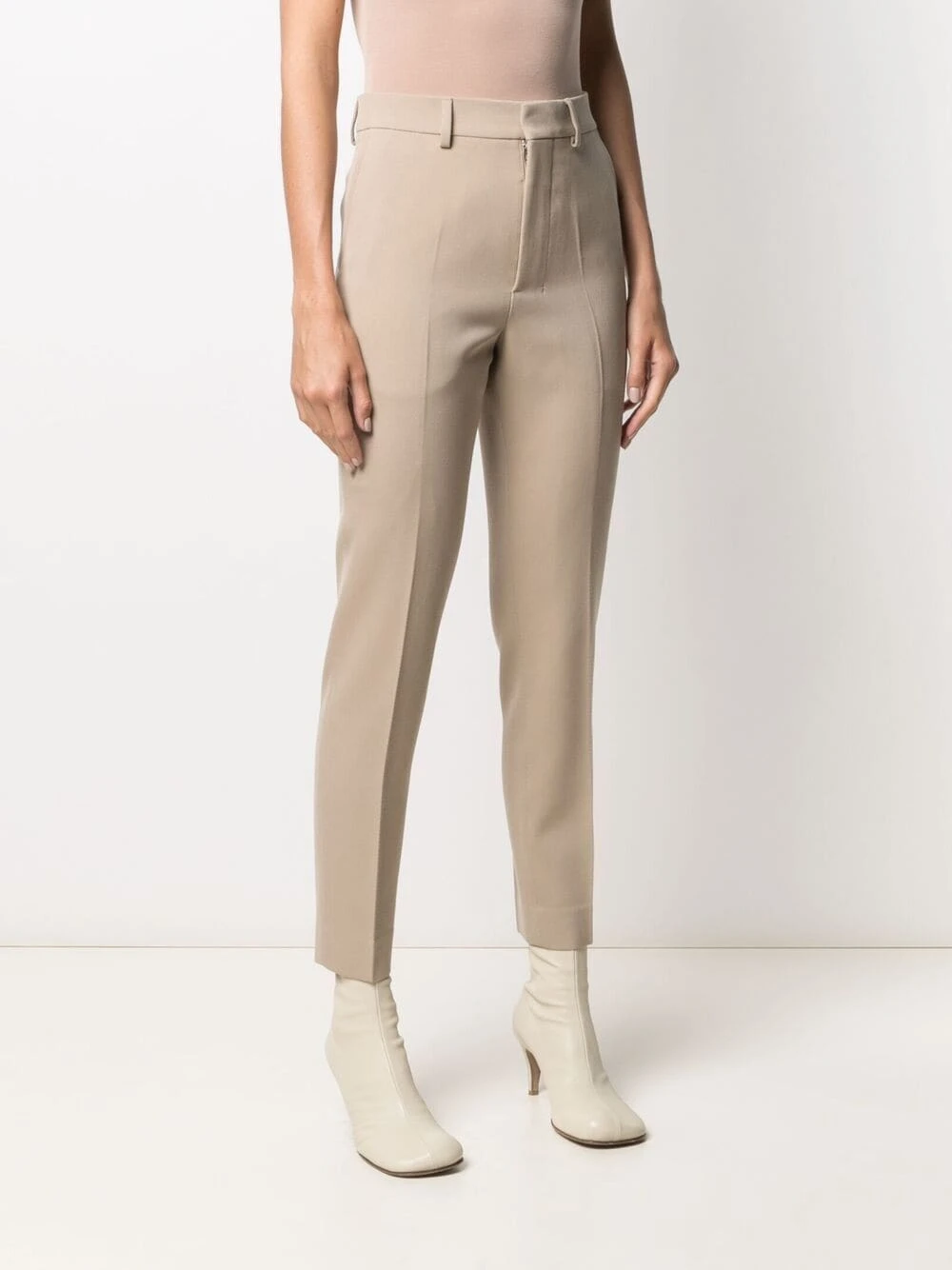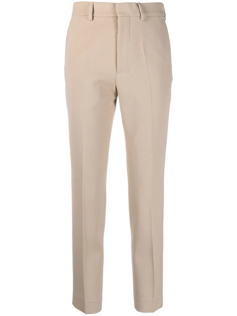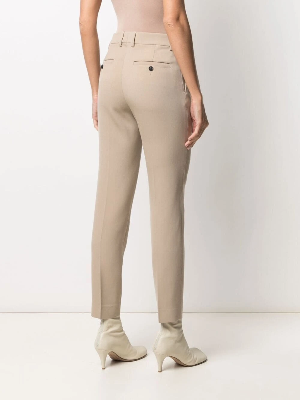 Taille haute, fermeture dissimulée sur le devant, passants de ceinture, plis marqués, deux poches latérales fendues, poches arrière passepoilées, coupe slim, longueur crop. Matière : laine vierge.