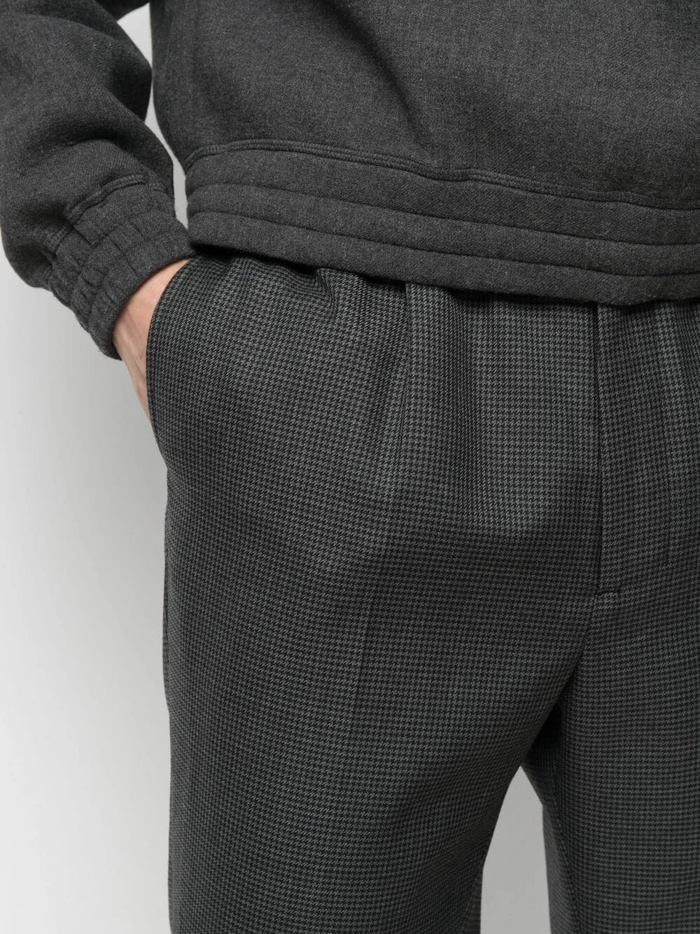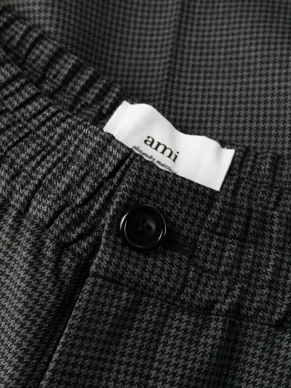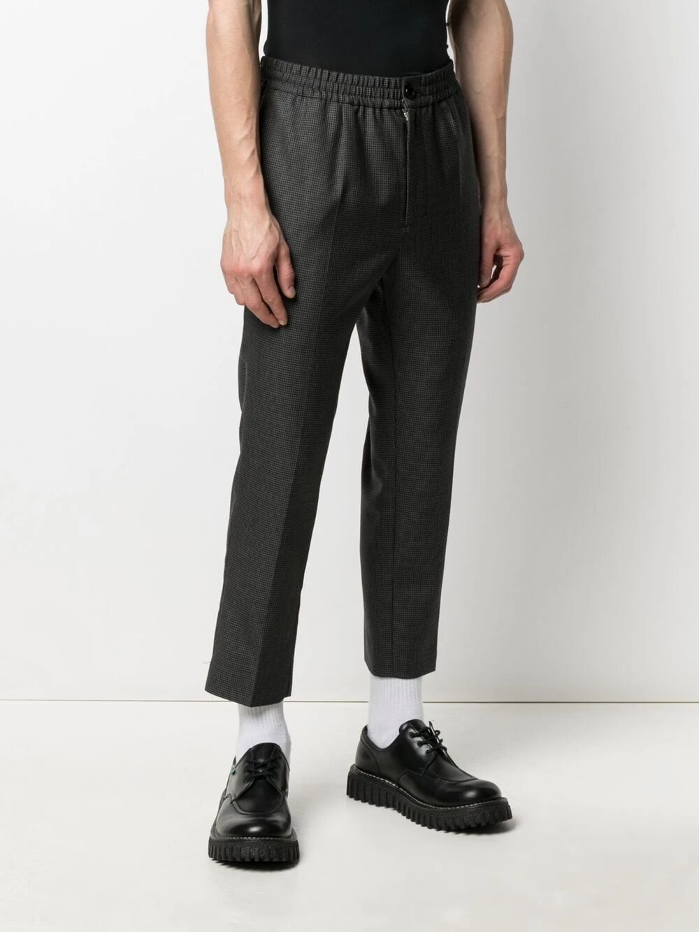 Motif pied-de-poule, ceinture élastique, fermeture à zip et boutons sur le devant, deux poches latérales fendues, poches arrière passepoilées, longueur crop. Matière : laine vierge.