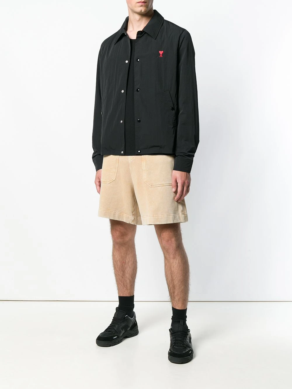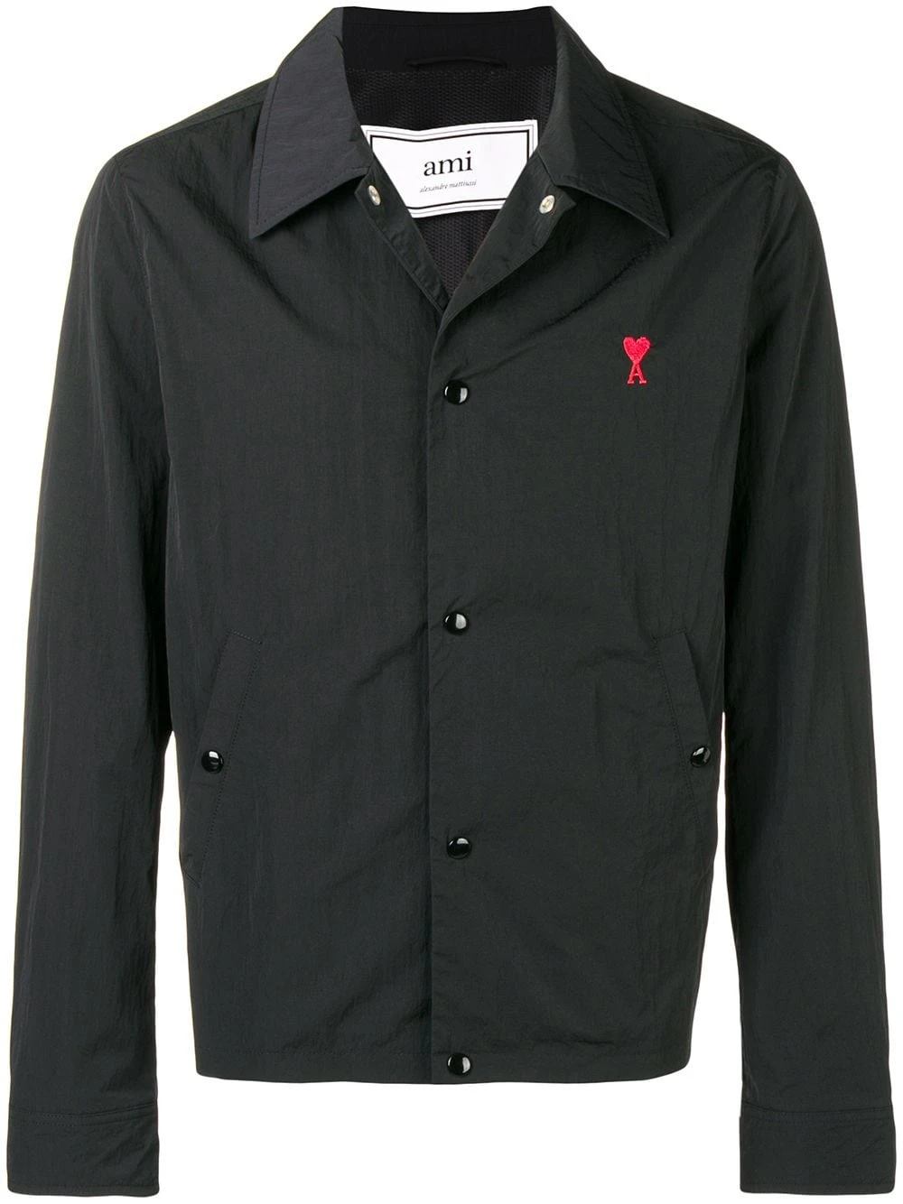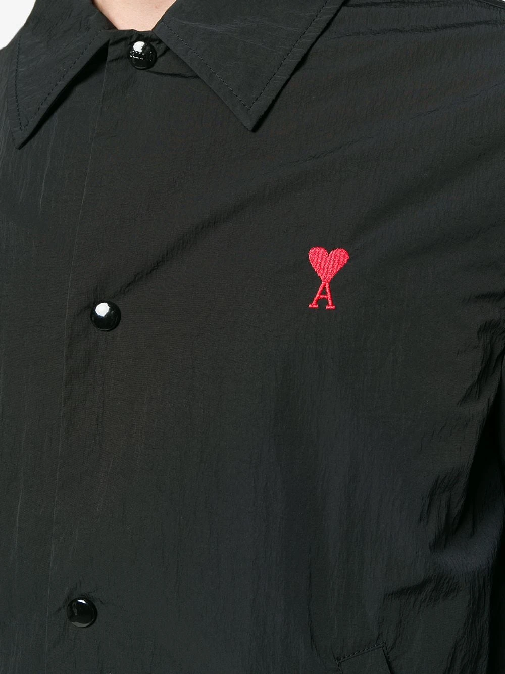 Blouson Ami de Coeur à pressions Ami Alexandre Mattiussi avec coupe droite, boutons pression, manches longues, poignets boutonnés, poches latérales, logo contrastant brodé sur la poitrine et doublure. Couleur: noir.