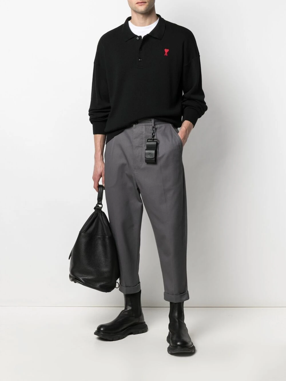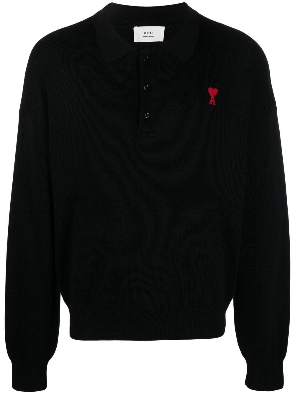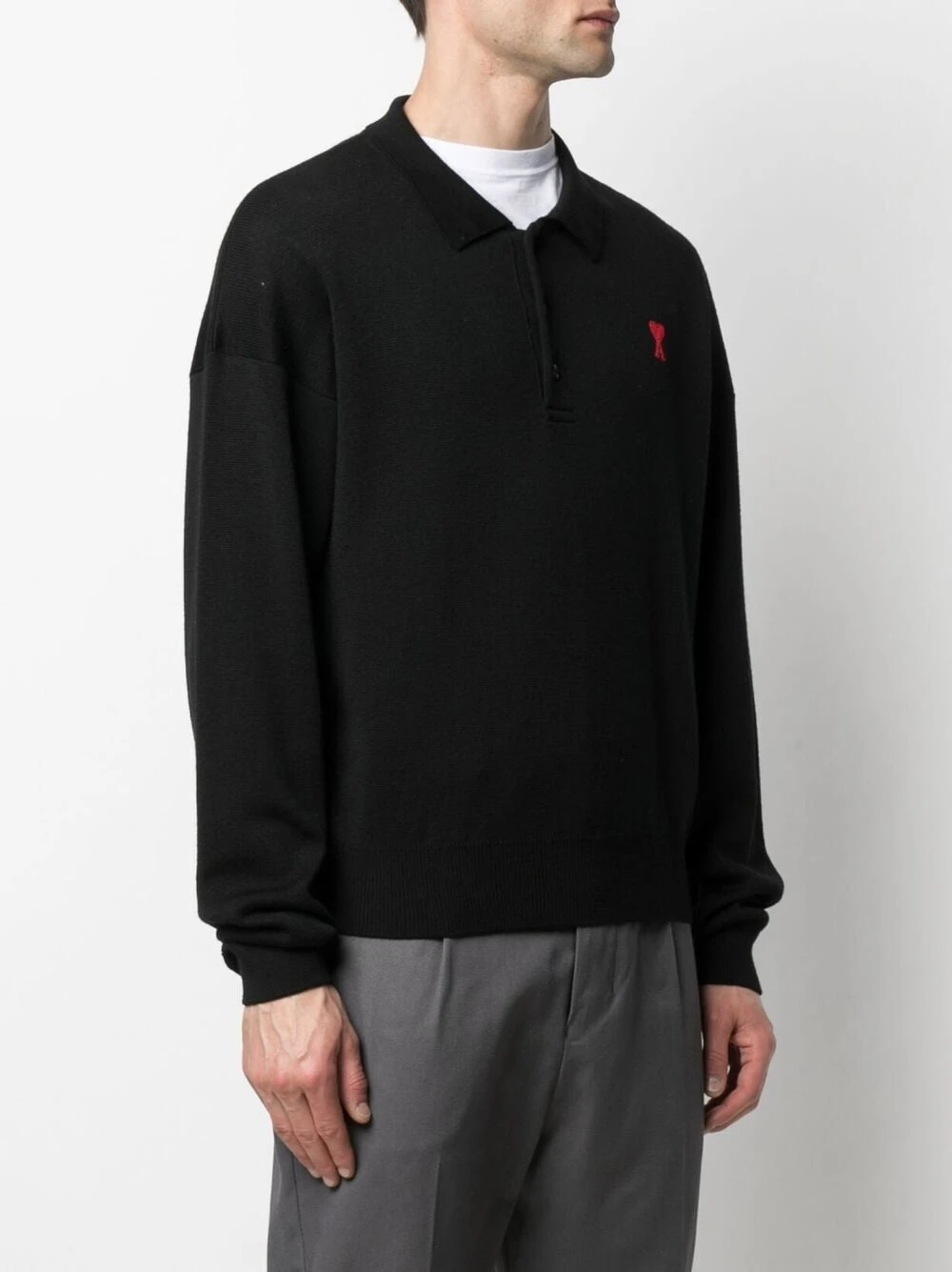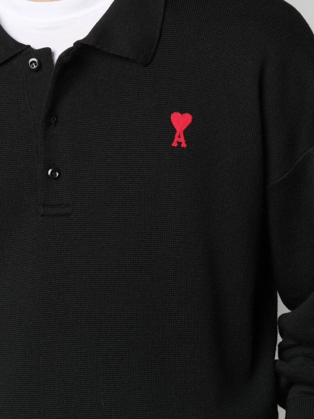 Logo Ami de Coeur signature, col polo, patte de boutonnage sur le devant, effet d’épaules descendues, manches longues. Couleur : noir. Matière : mérinos.