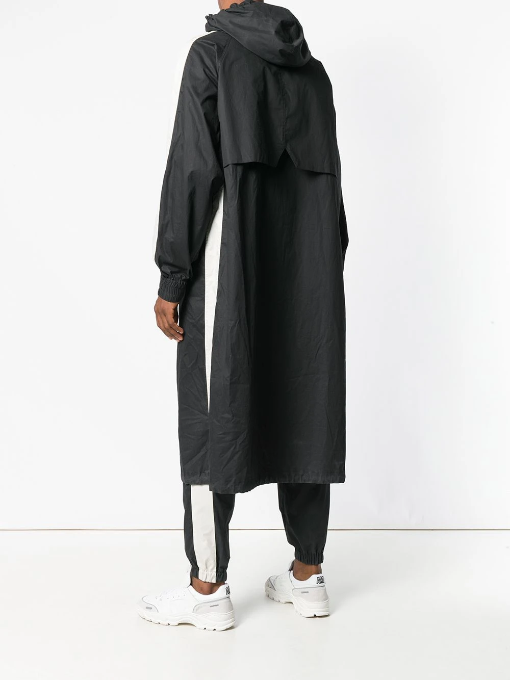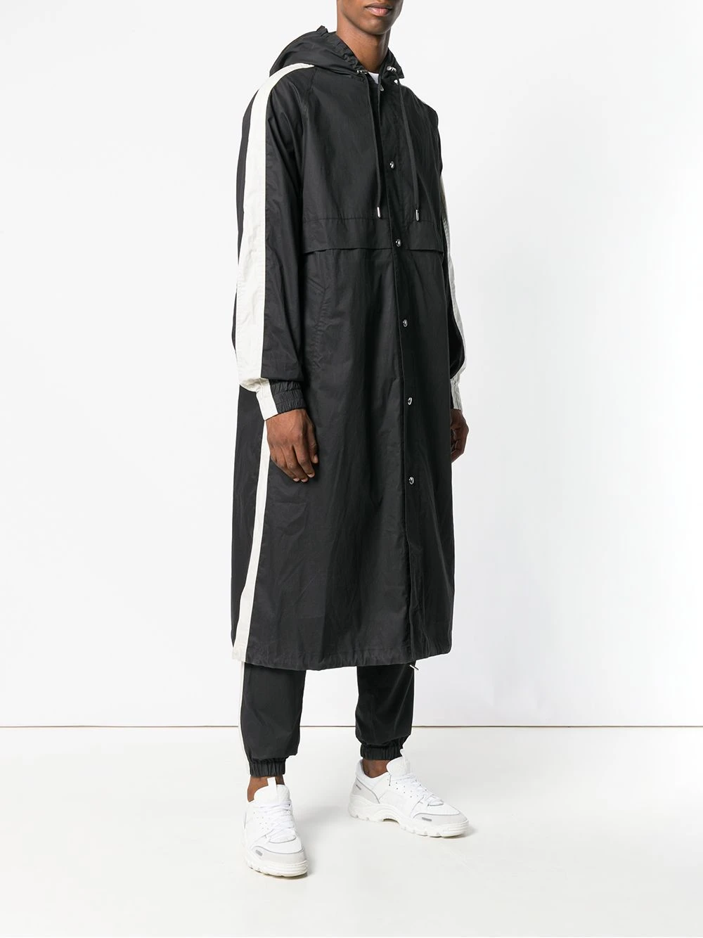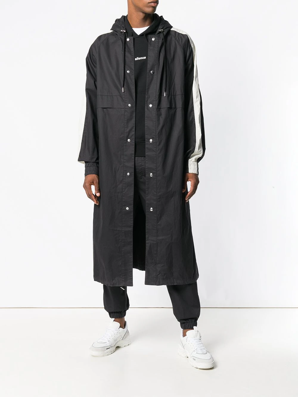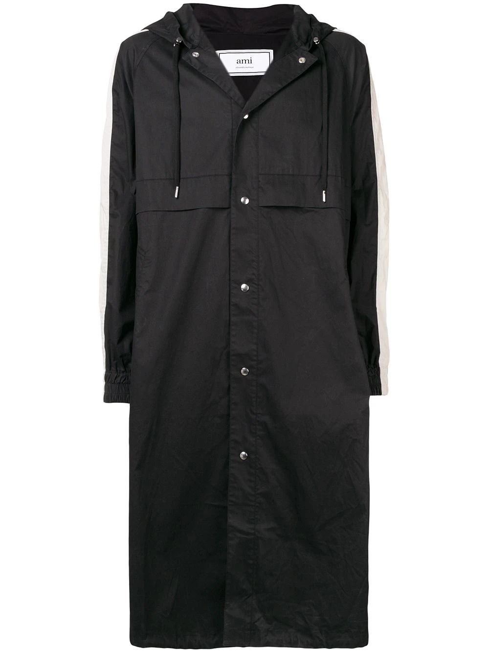 Coupe-vent long à capuche en coton Ami Alexandre Mattiussi avec aspect souple, boutons pression, poignets resserrés, capuche à lien de resserrage, longueur mi-mollet, poches latérales et manches longues raglan. Couleur : noir.