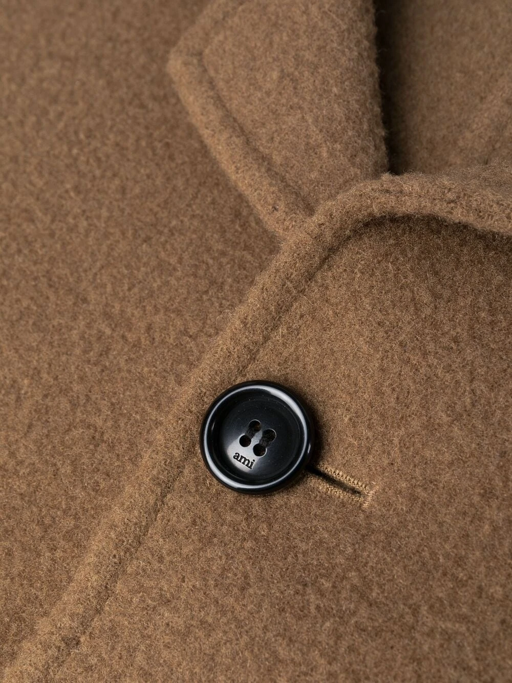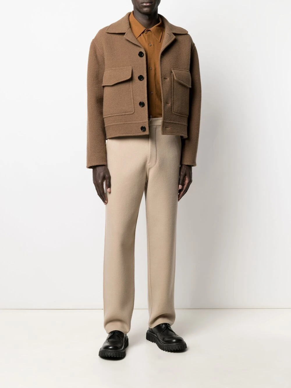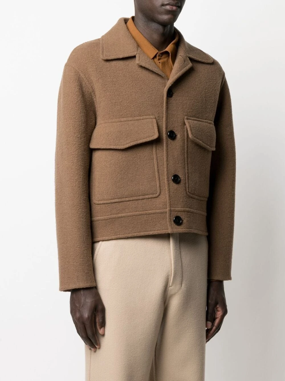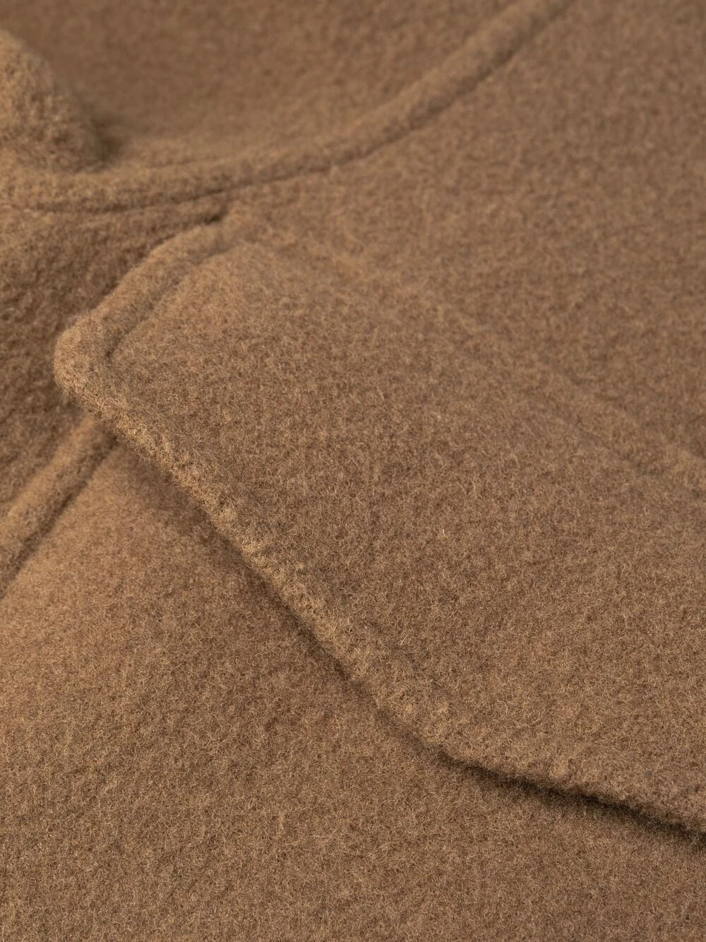 Col classique, effet d’épaules descendues, boutonnière sur le devant, manches longues, deux poches à rabat sur le devant. Matière : laine.