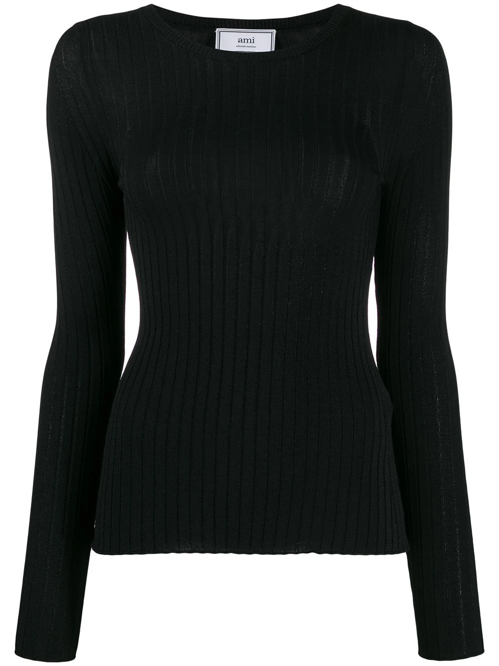Pull nervuré AMI Paris avec encolure ronde, manches longues, a fine knit et ourlet et poignets nervurés. Couleur : noir.