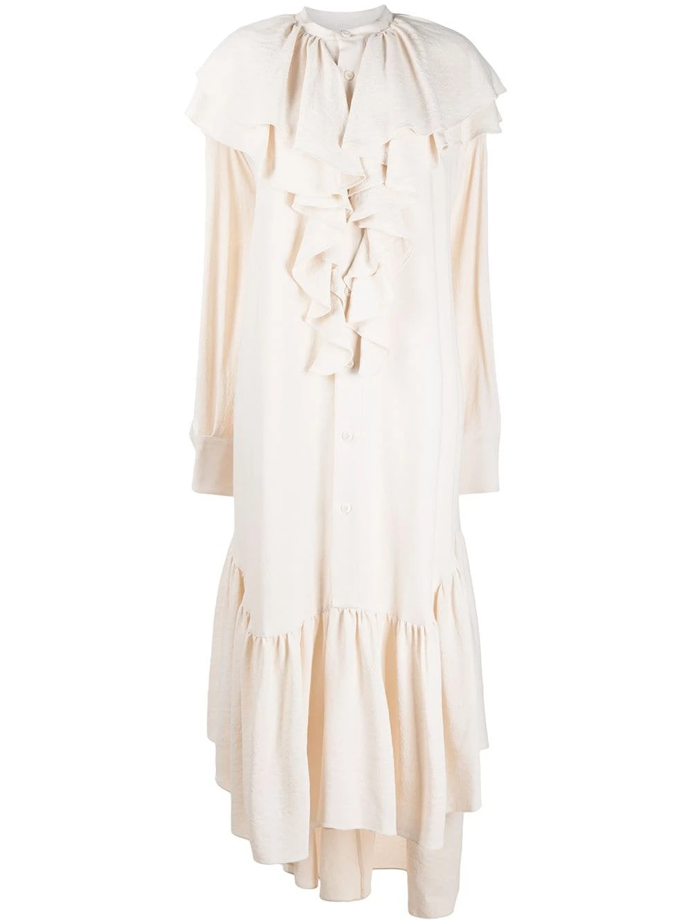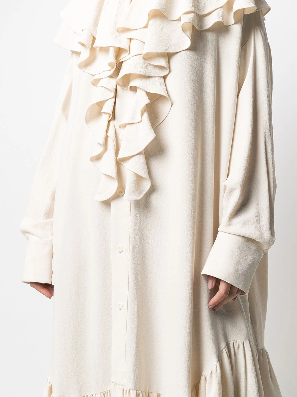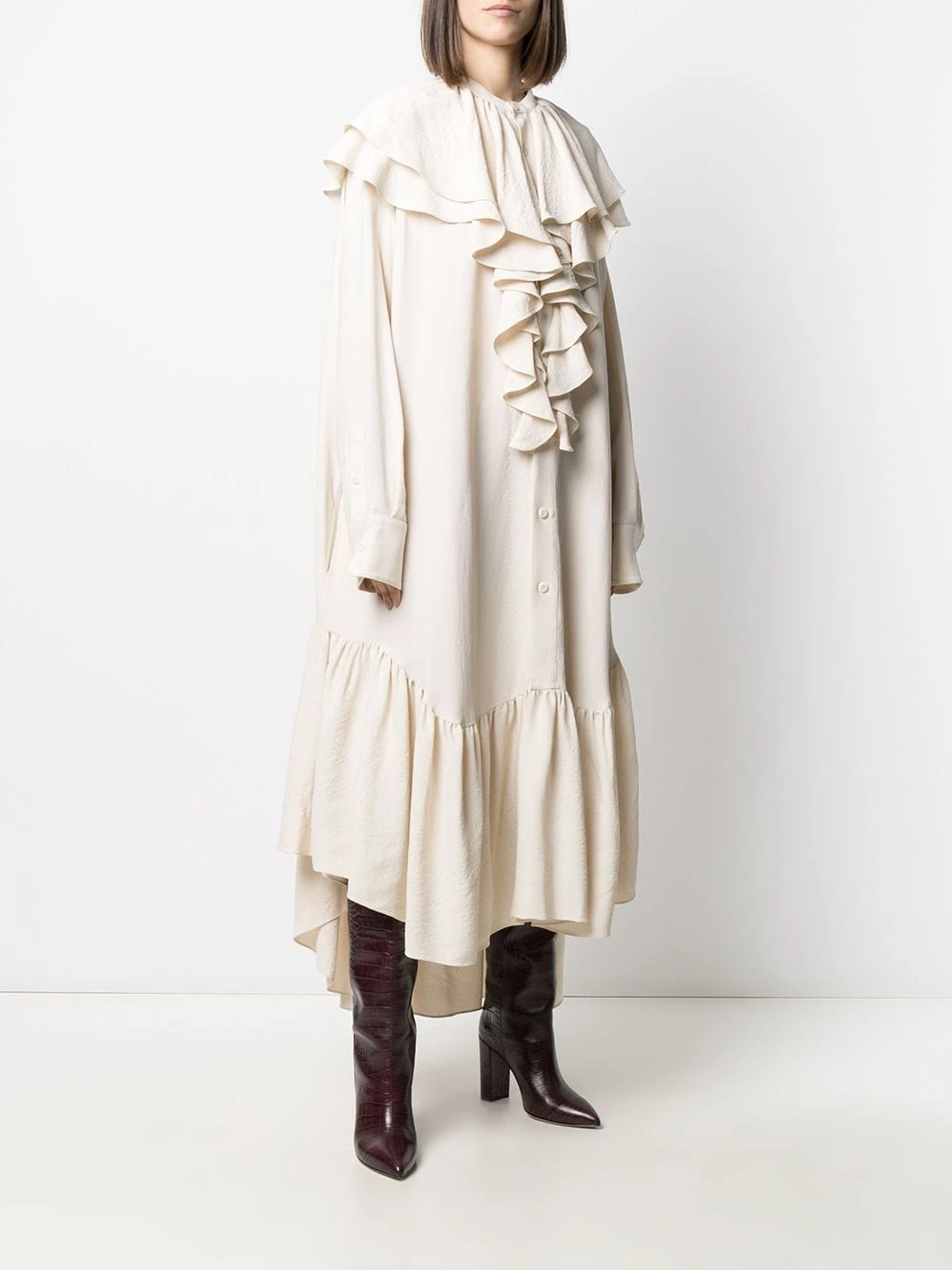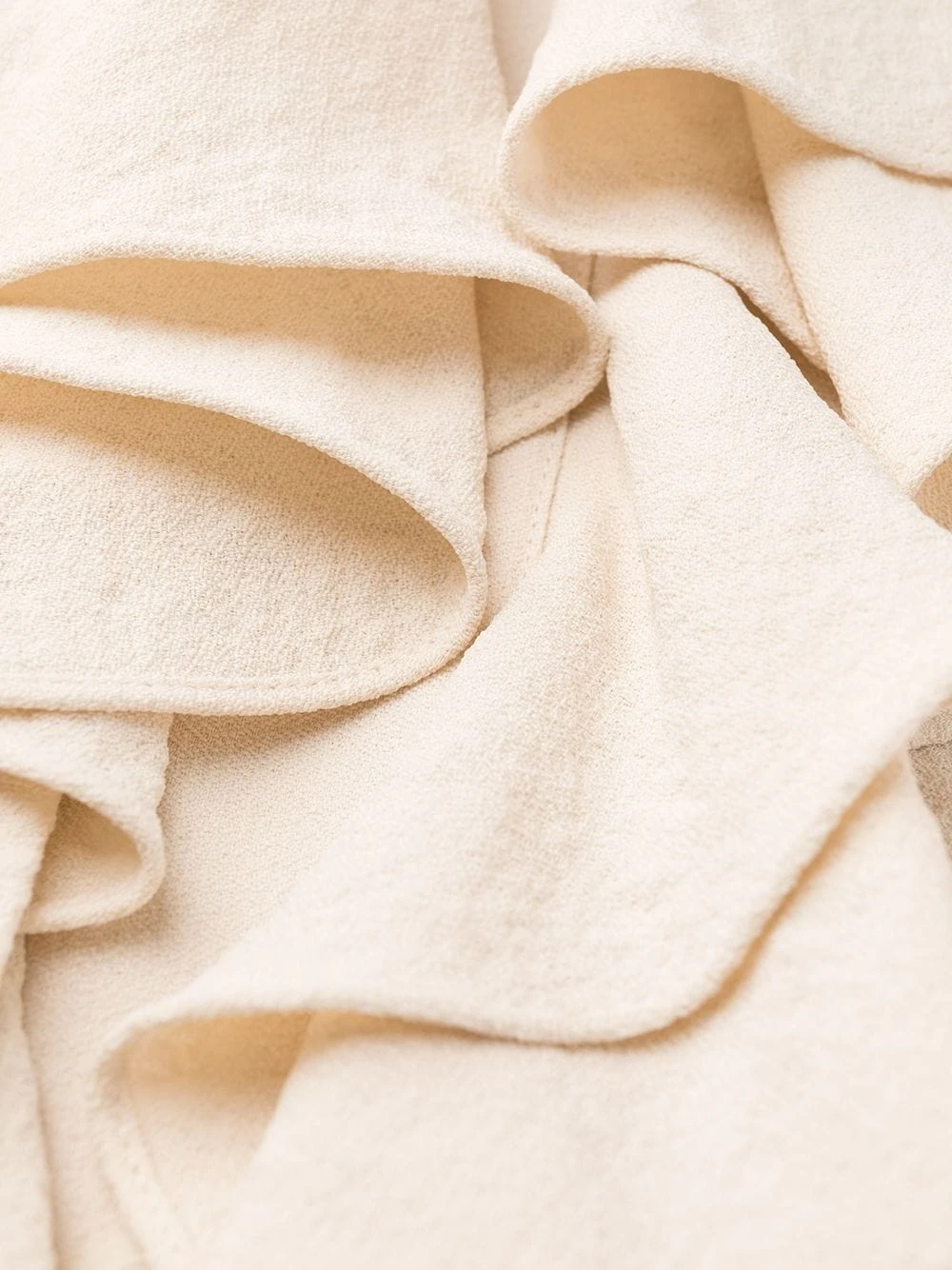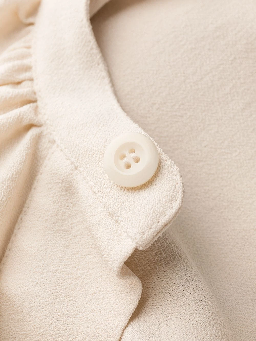 Col italien, détails de volants, manches courtes, boutonnière sur le devant, coupe mi-longue, fentes latérales. Matière : tissu.