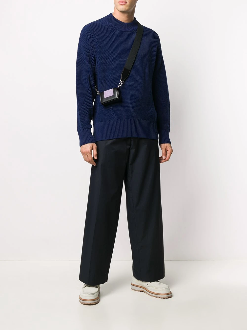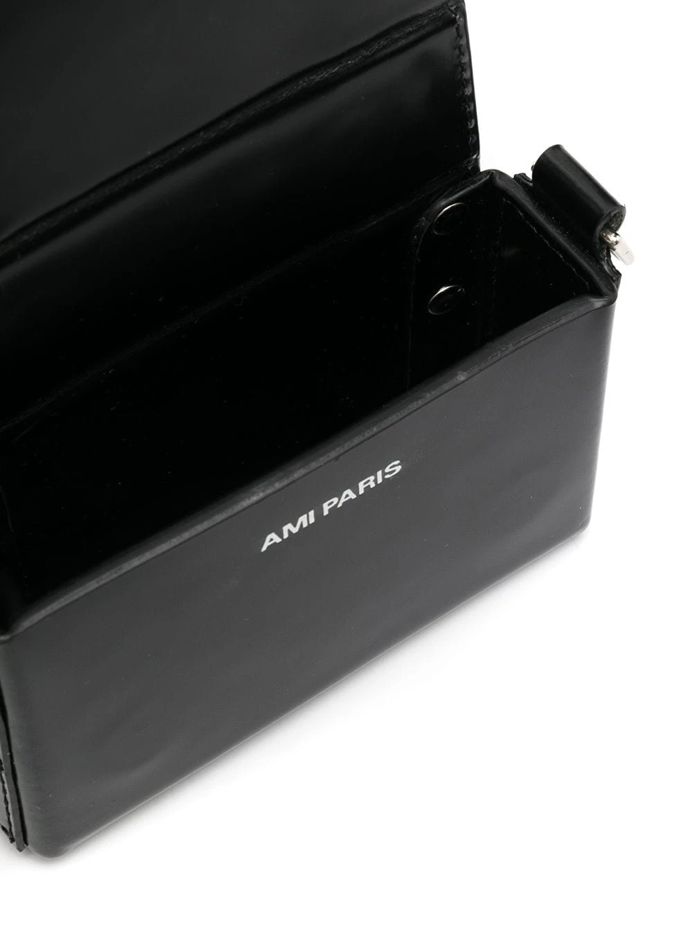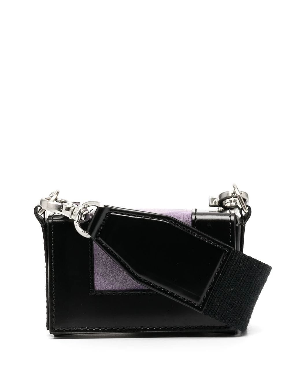 Design à empiècements colour block, détails de clous argentés, logo embossé sur le devant, forme rectangulaire structurée, rabat sur le devant, bride portée épaule détachable. Matière : cuir.