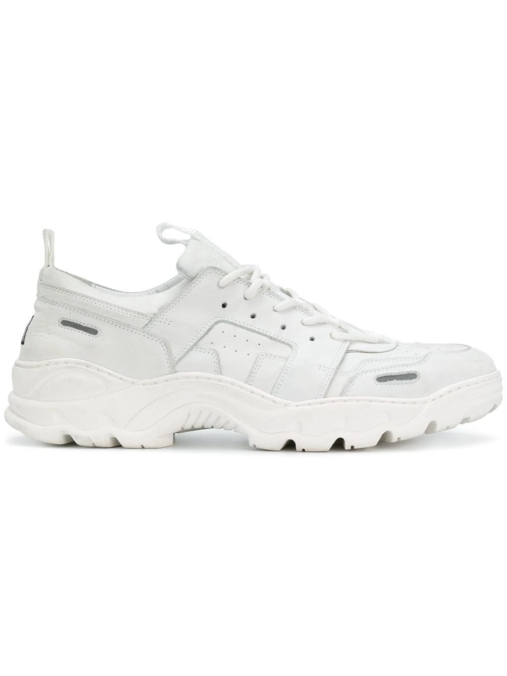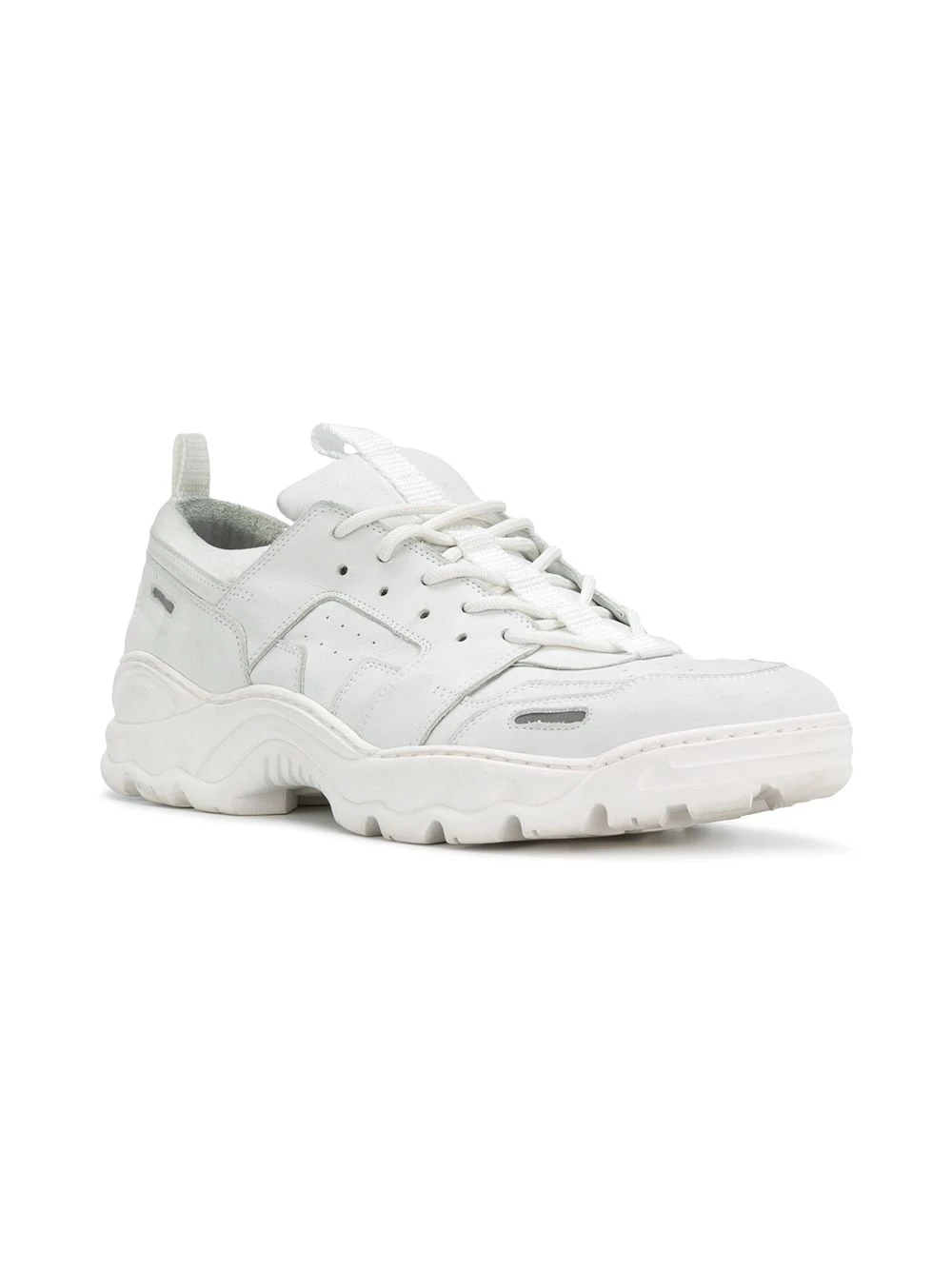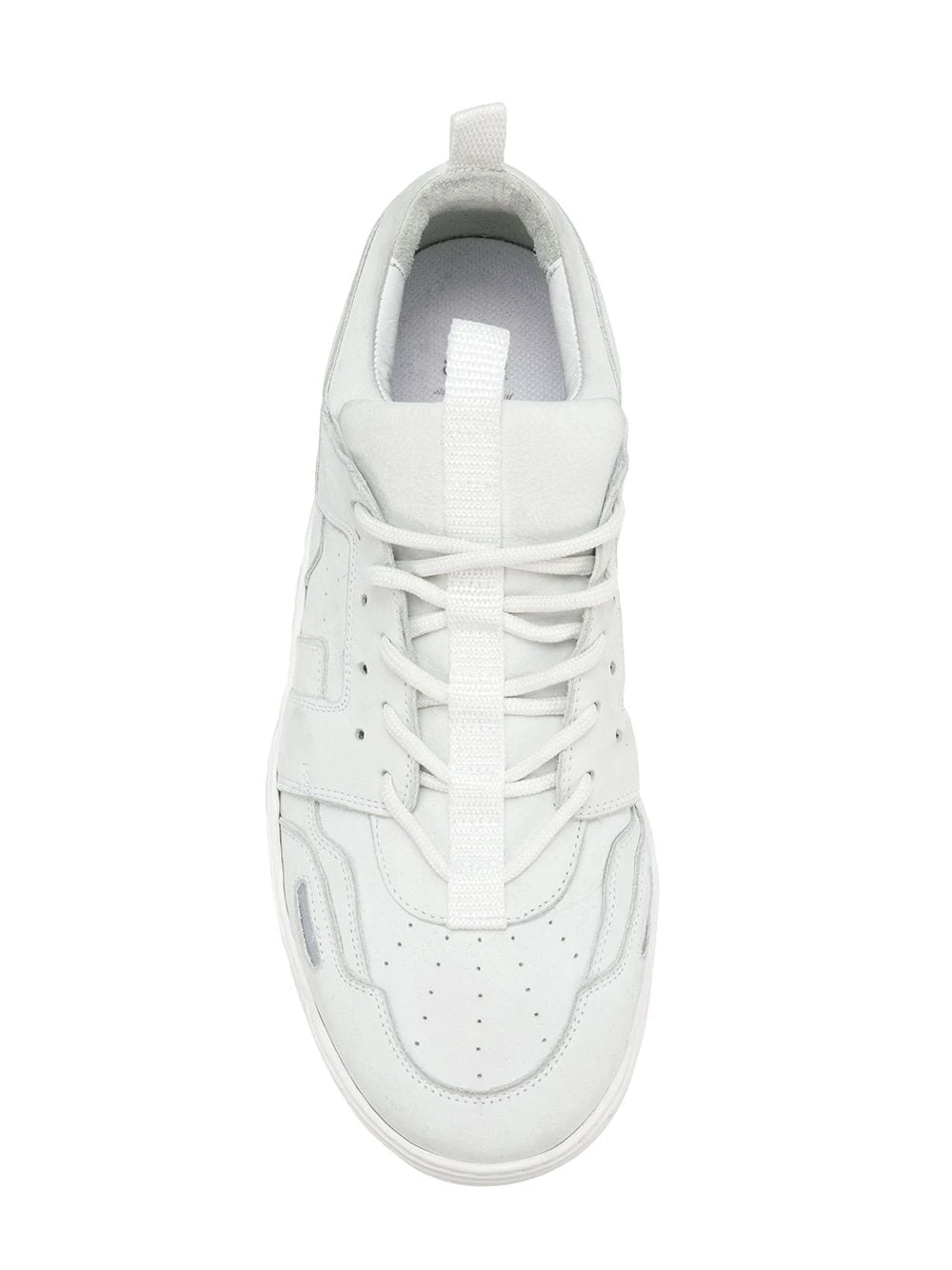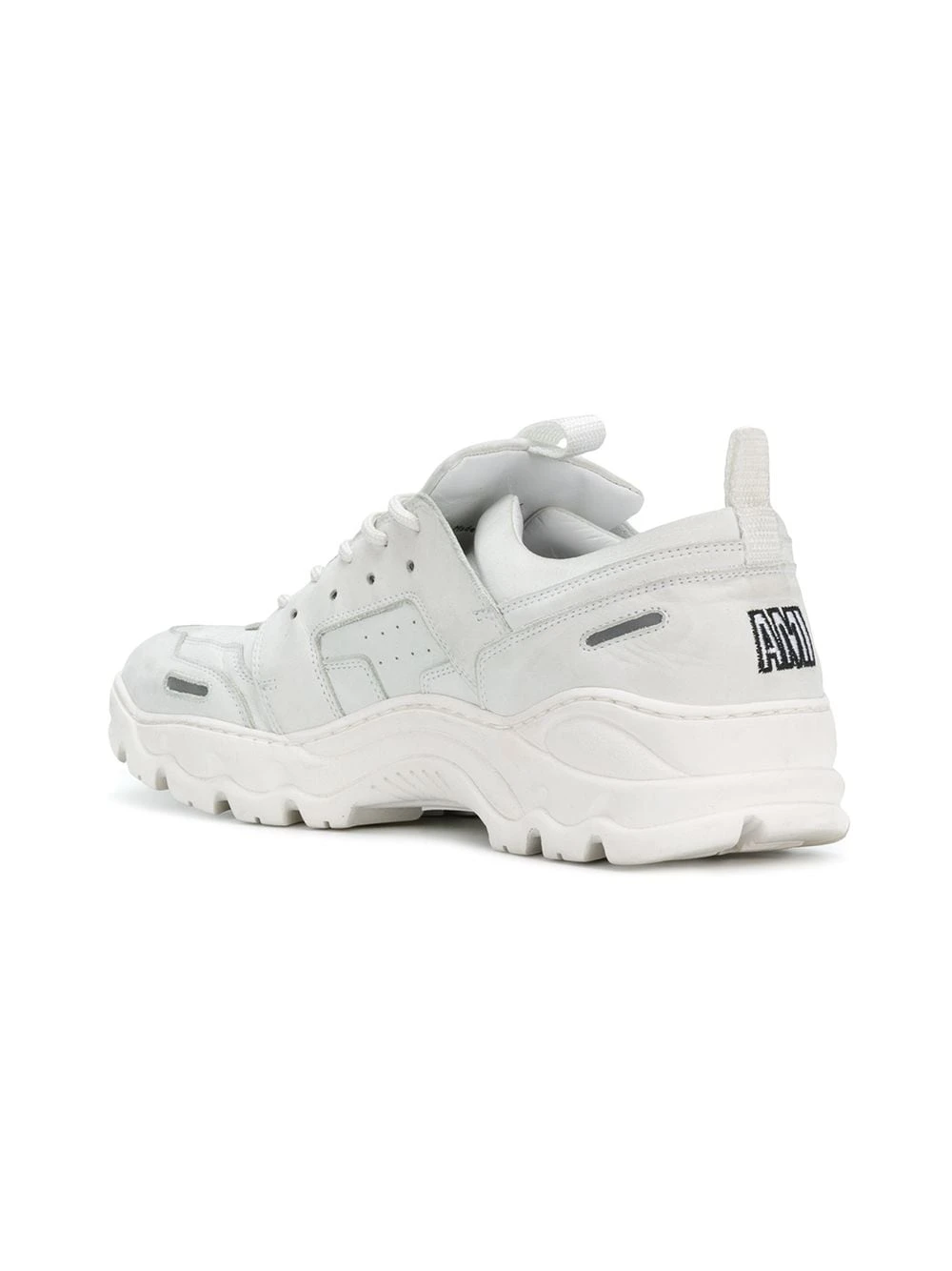 Running Lucky 9 en cuir et daim blancs Ami Alexandre Mattiussi avec bout rond, perforations décoratives, fermeture à lacer sur le devant, languette arrière, semelle intérieure à logo, semelle crantée en caoutchouc et monogramme sur le talon.