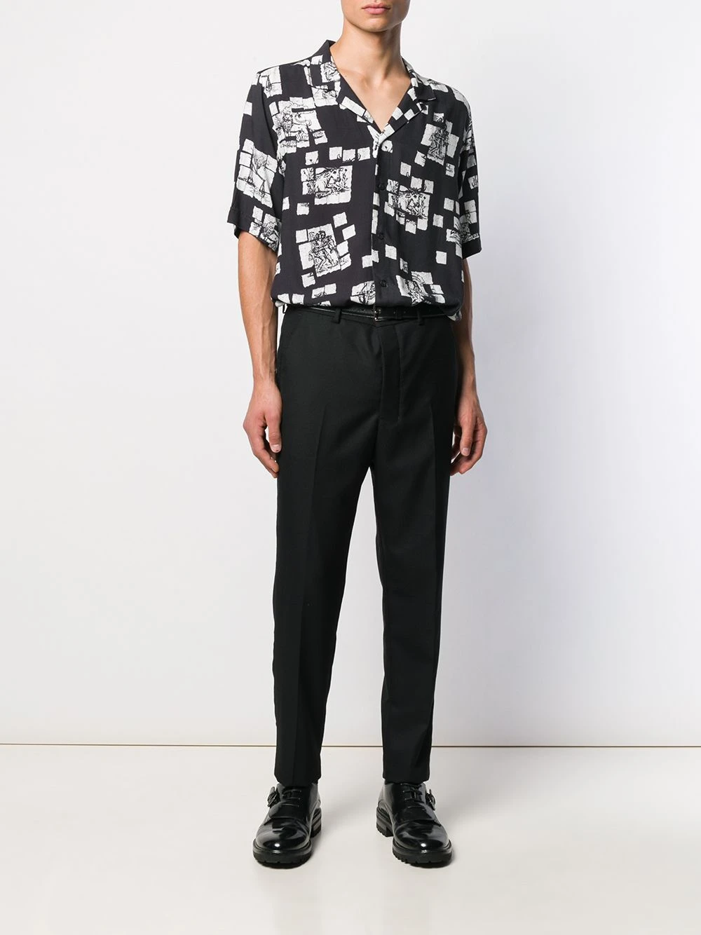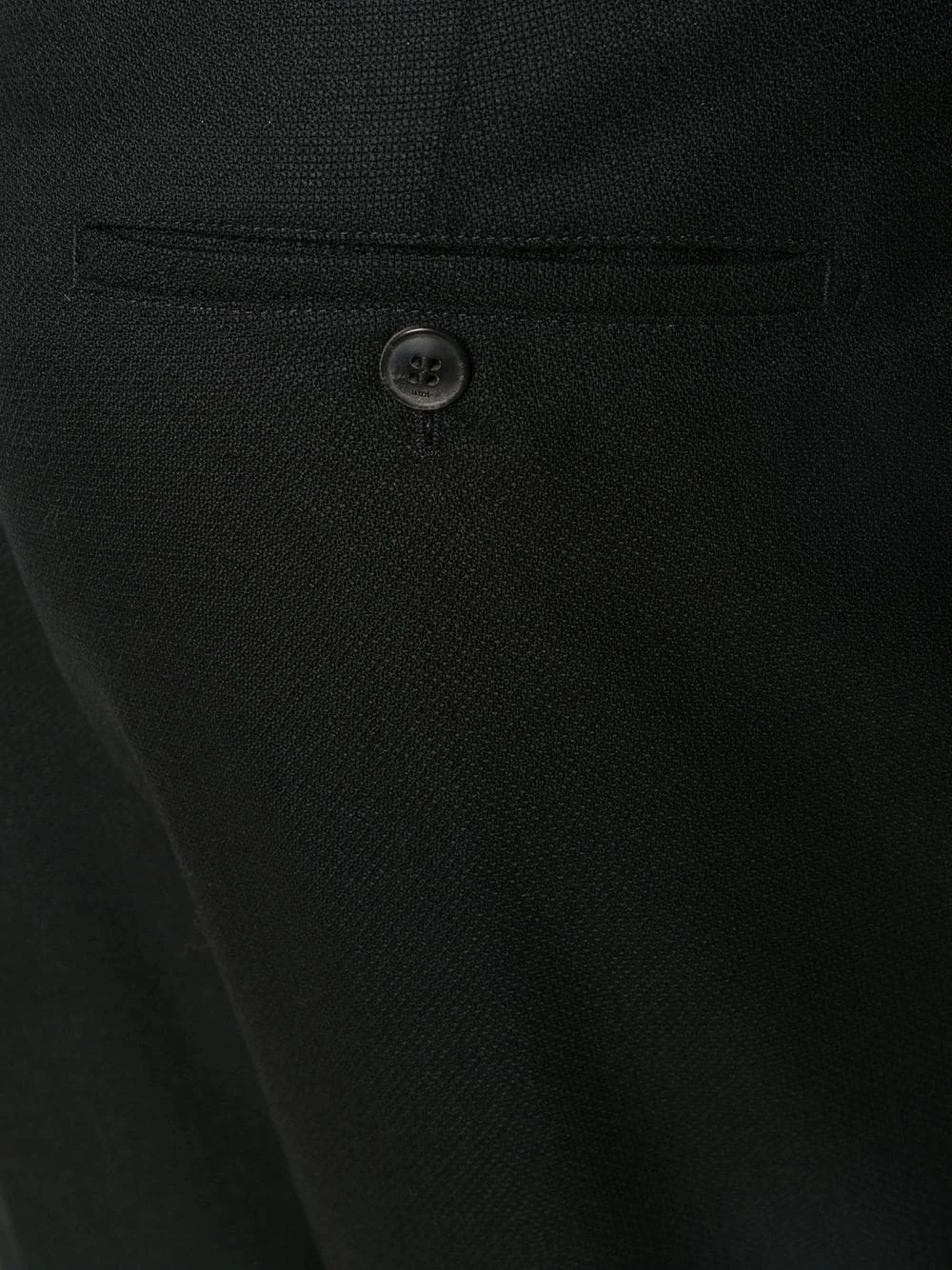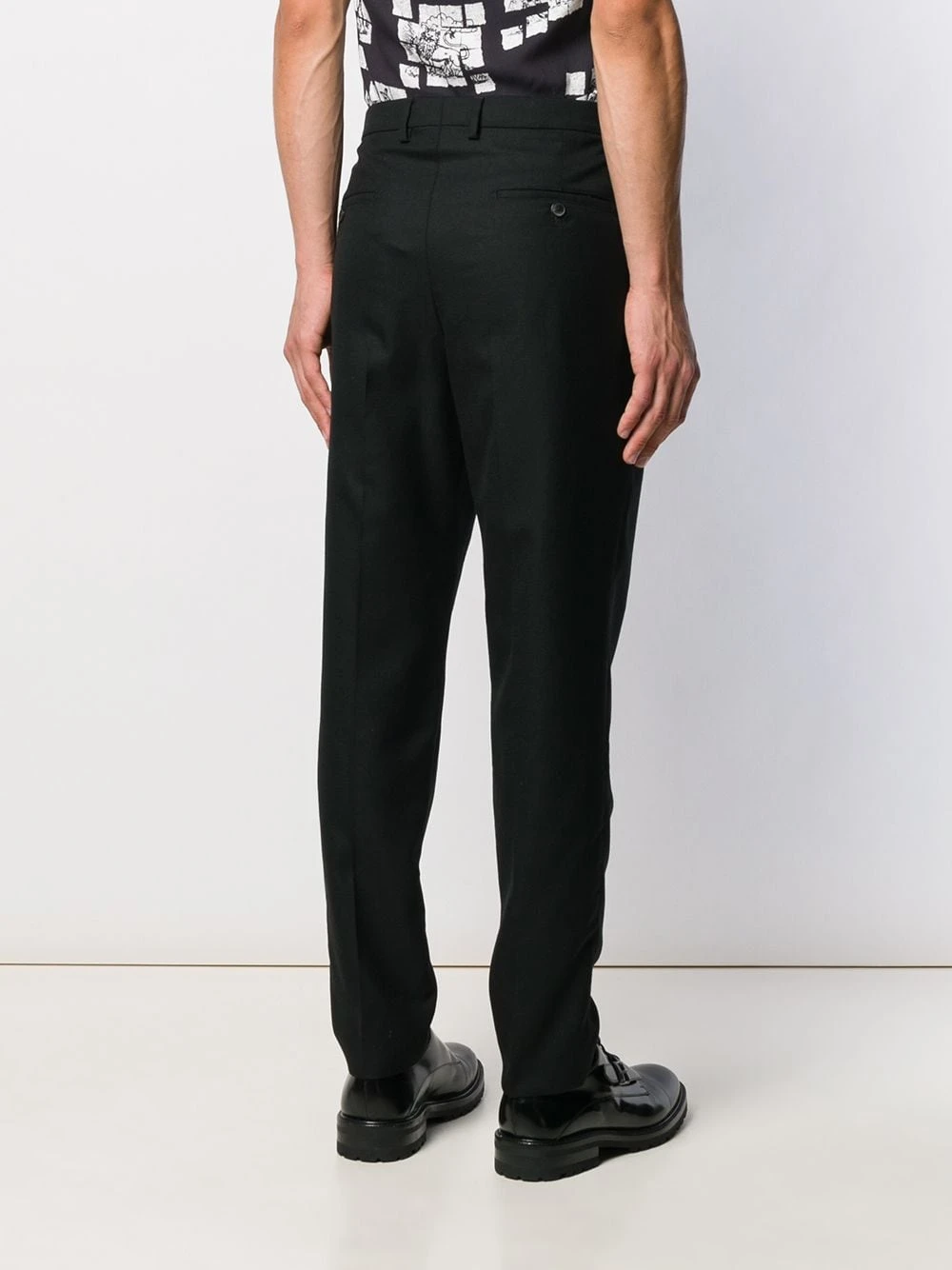 Pantalon carotte classique en laine vierge AMI Alexandre Mattiussi avec passants de ceinture, fermeture devant dissimulée, poches latérales, deux poches arrière passepoilées et boutonnées et détails plissés. Couleur : noir.