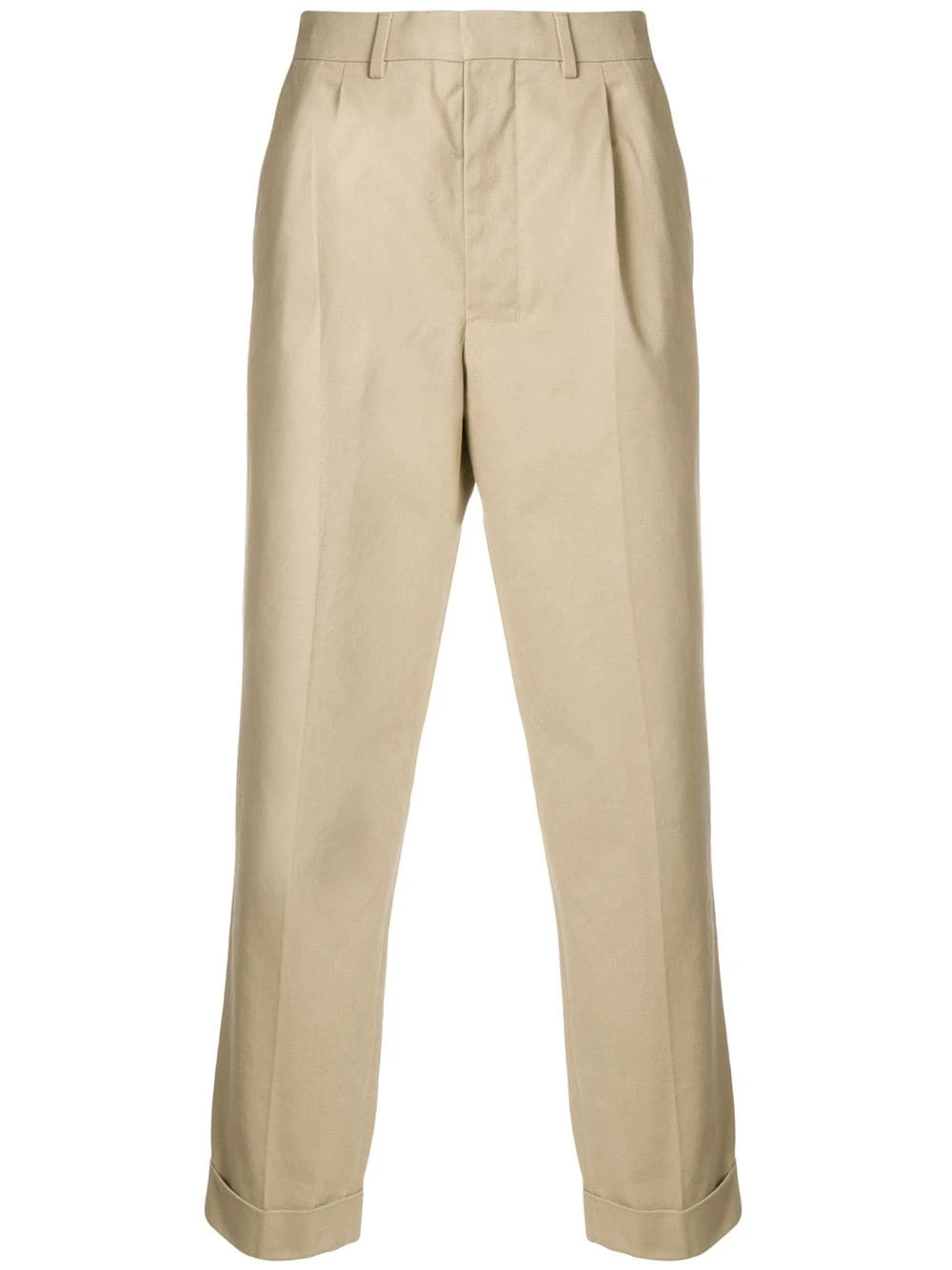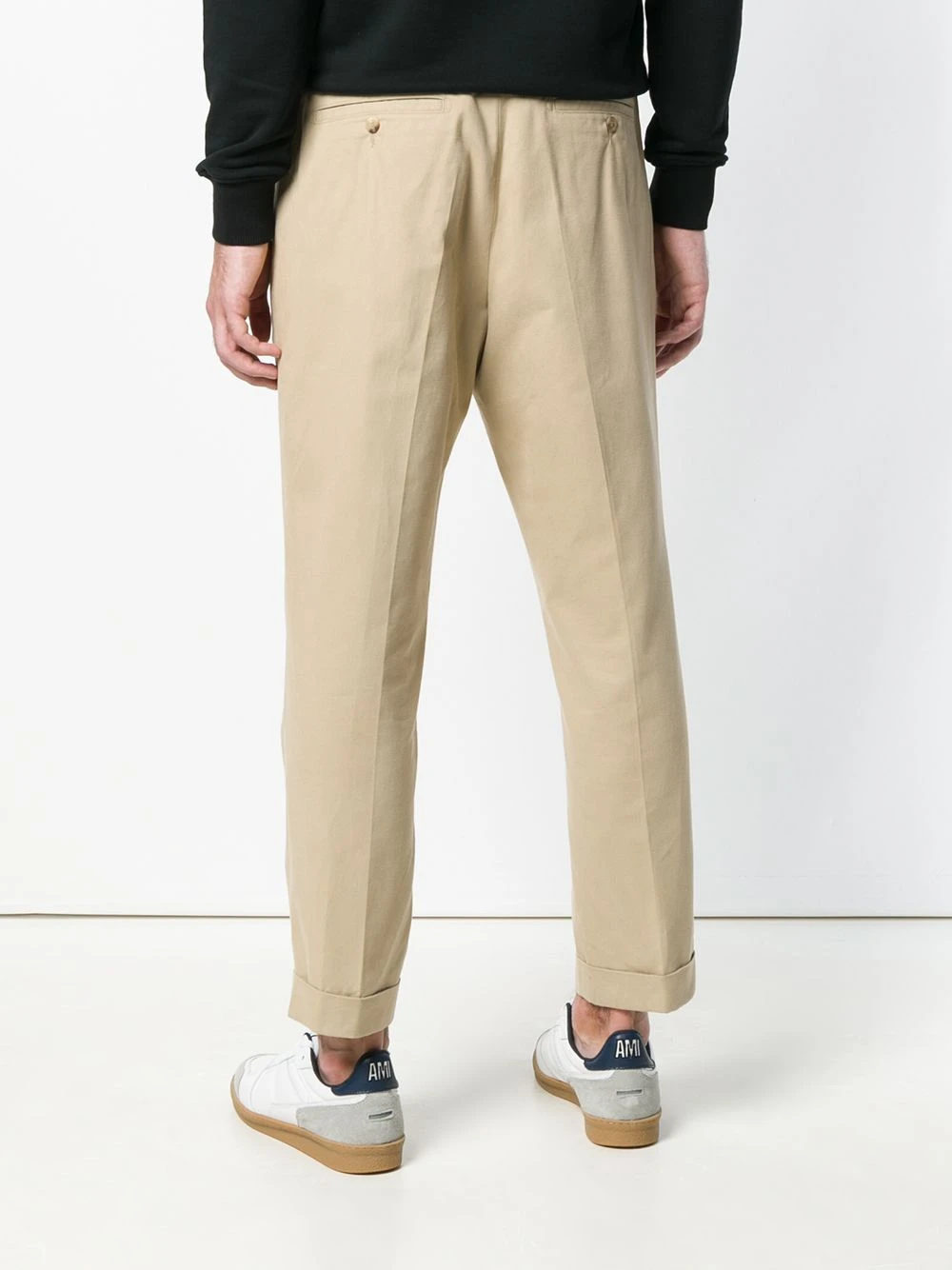 Pantalon carotte à plis en coton Ami Alexandre Mattiussi avec taille normale, passants de ceinture à la taille, fermeture devant dissimulée, coupe fuselée, poches latérales, détails plissés, deux poches arrière passepoilées et boutonnées et ourlet retroussé.