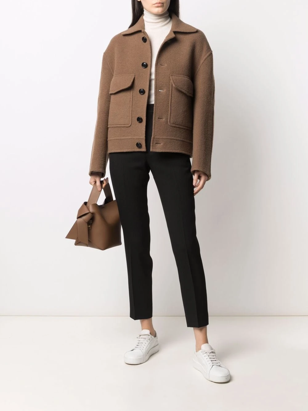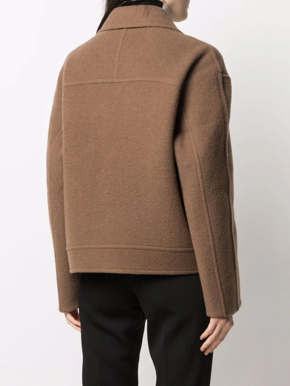 Col cranté, boutonnière sur le devant, deux poches à rabat sur le devant, manches longues, ourlet droit. Couleur : marron. Matière : laine.