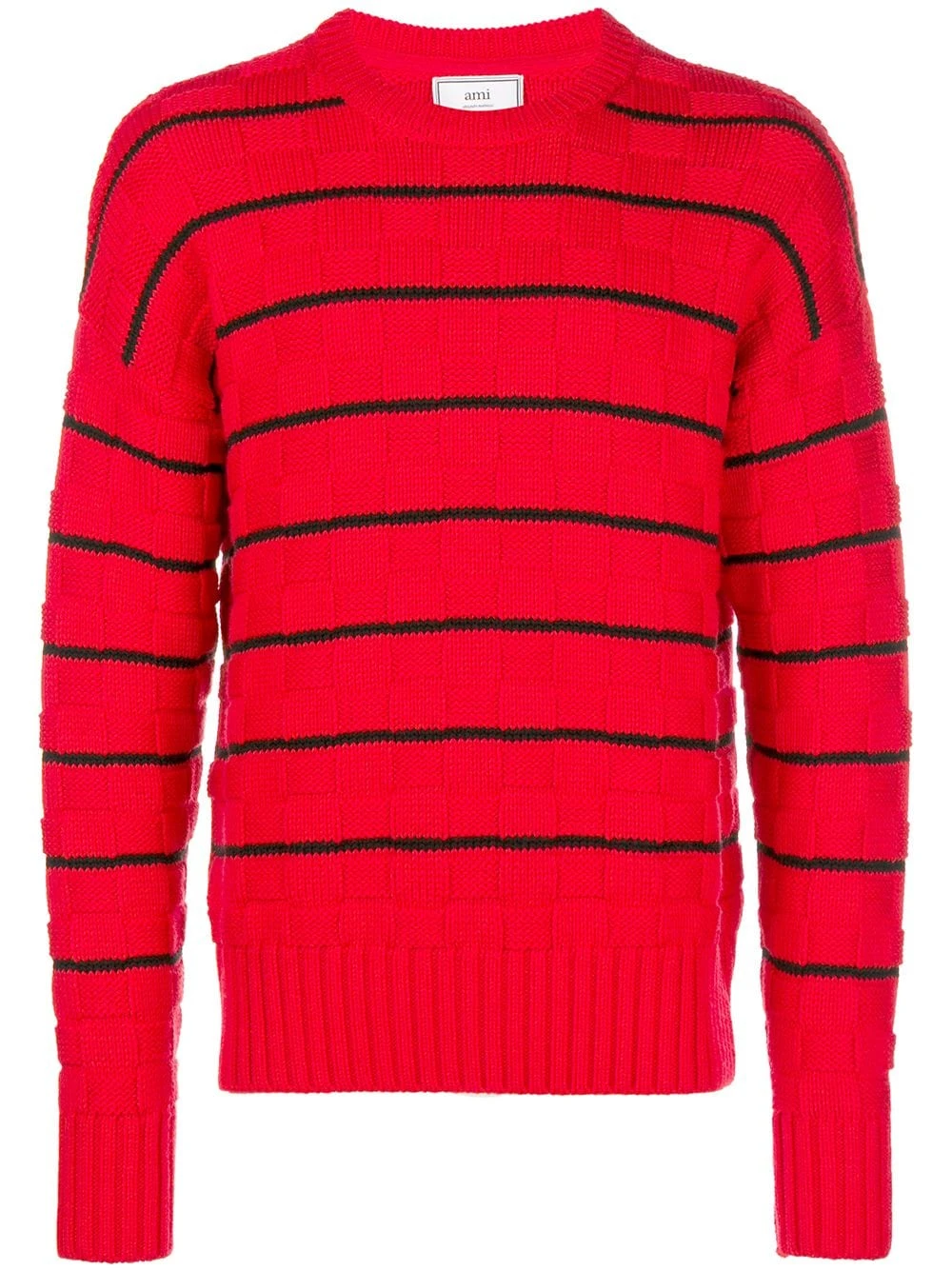 Pull col rond oversize rayé en Natural (other)->Wool Ami Alexandre Mattiussi avec coupe droite, design texturé, rayures horizontales, encolure ras du cou nervurée, effet d’épaules descendues et ourlet et poignets nervurés. Couleur: .