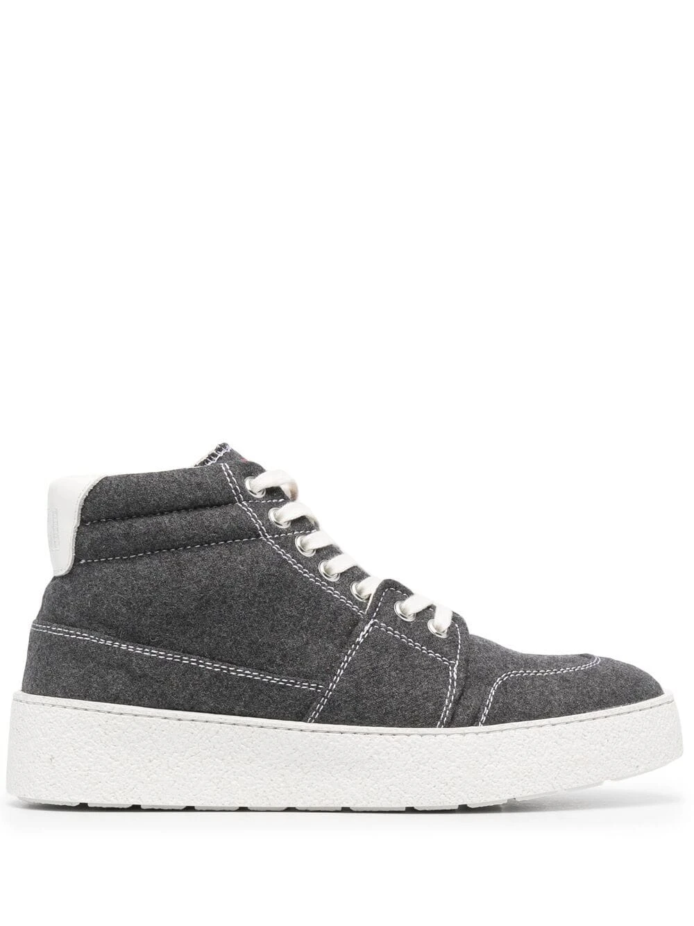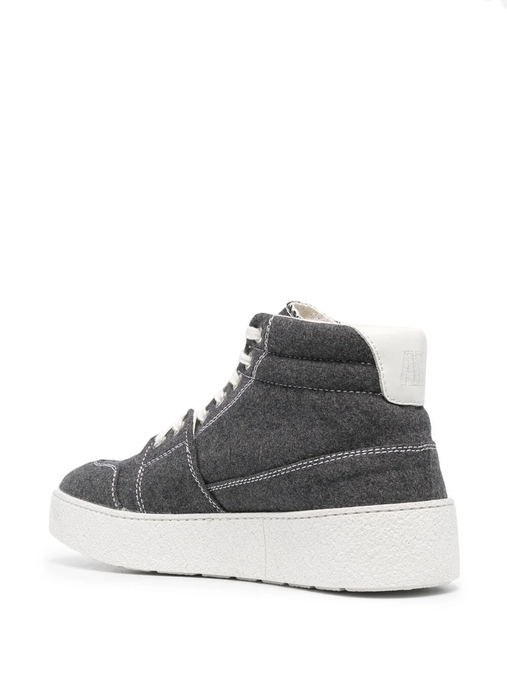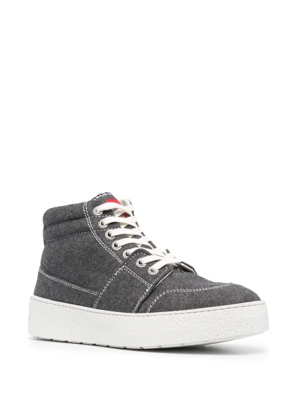 Coutures contrastantes, languette à patch logo, hauteur cheville, bout rond, fermeture à lacer sur le devant, semelle plate en caoutchouc.
