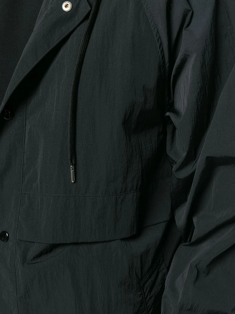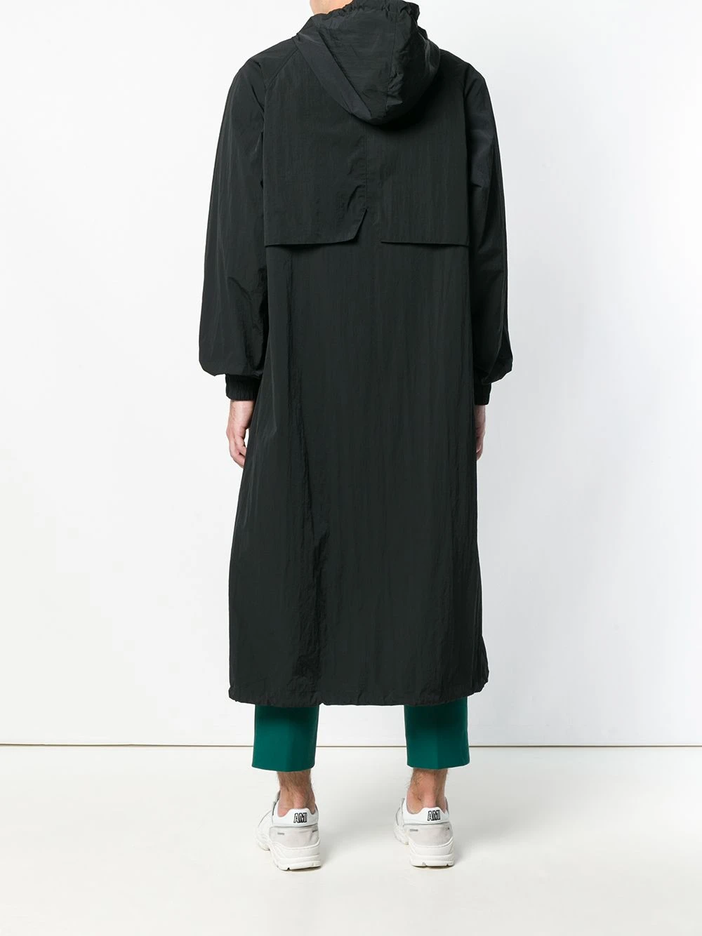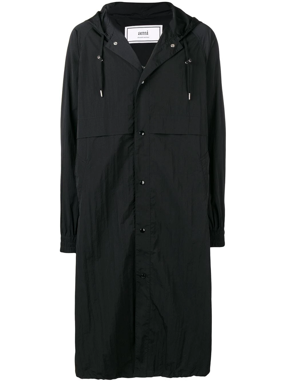 Coupe-vent long à capuche Ami Alexandre Mattiussi avec fermeture à boutons pression, aspect souple, capuche à lien de resserrage, ourlet à lien de resserrage, poignets resserrés et poches latérales. Couleur : noir.