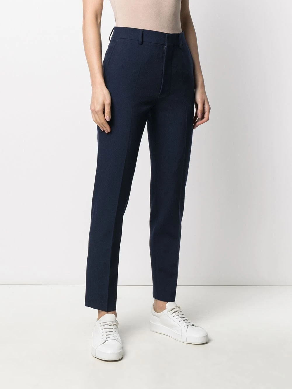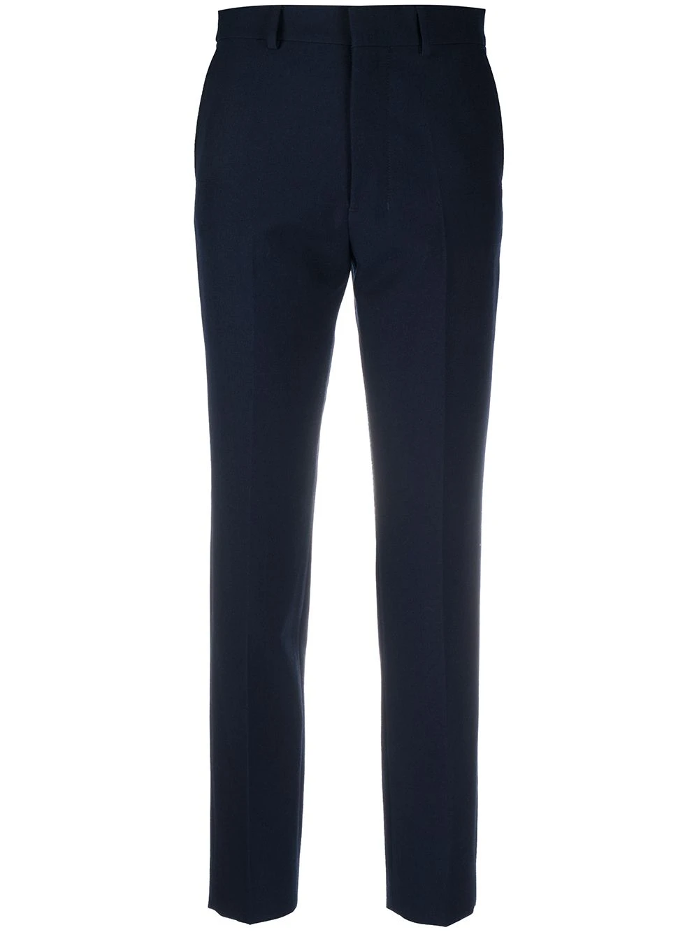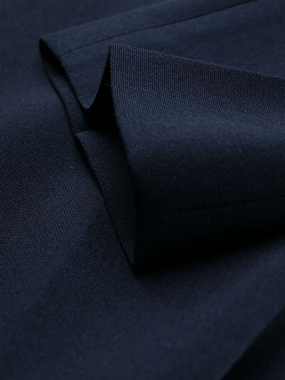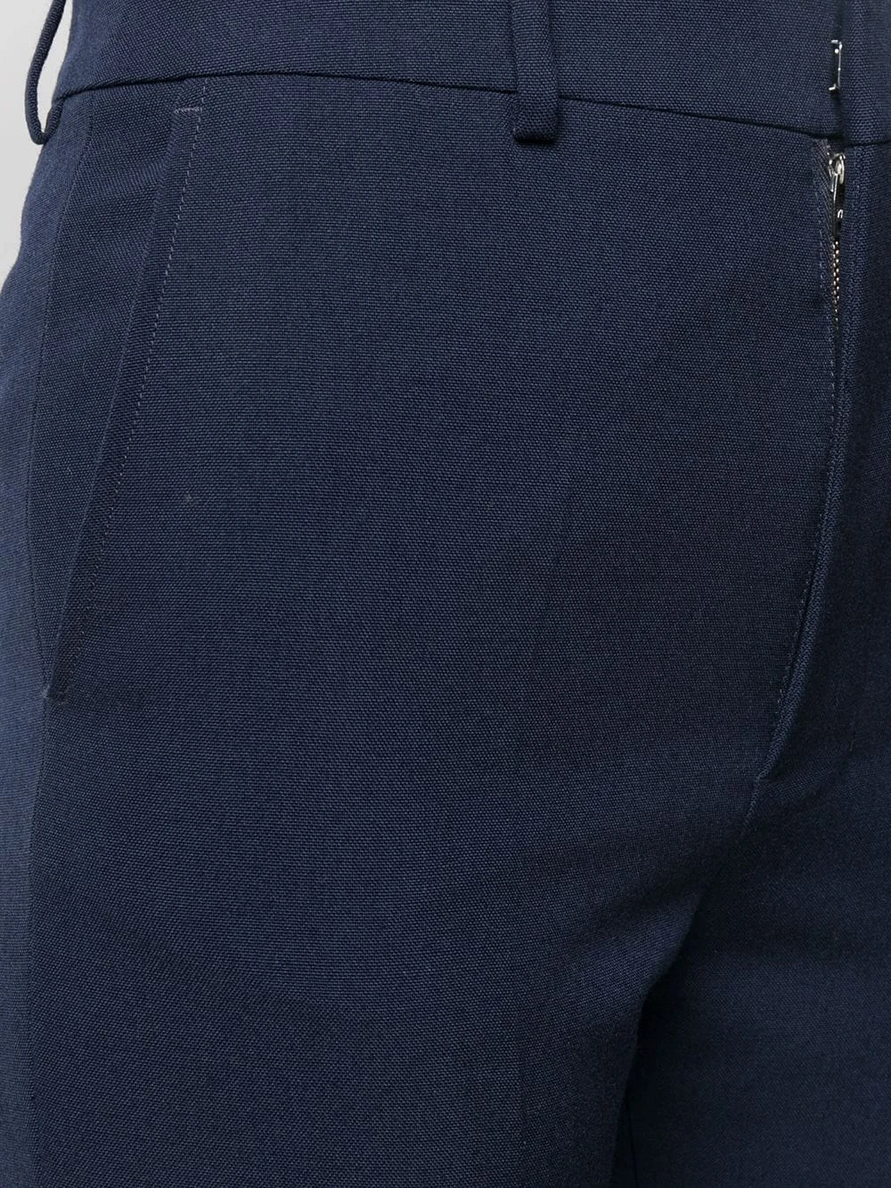 Fermeture dissimulée sur le devant, passants de ceinture, deux poches latérales passepoilées, plis marqués, coupe courte, poches arrière passepoilées.