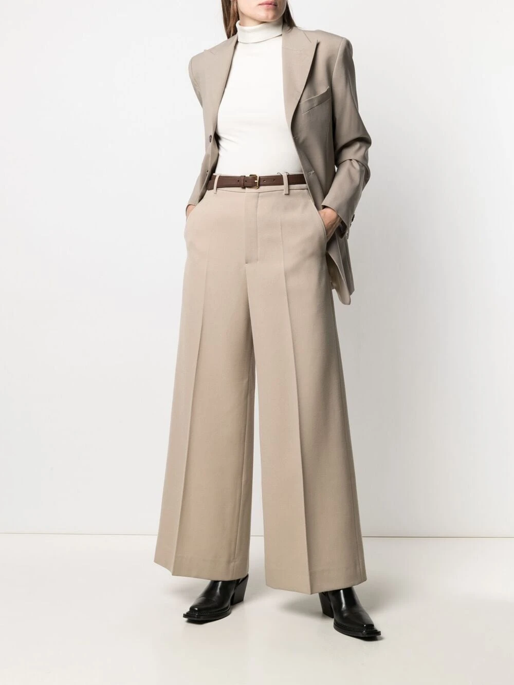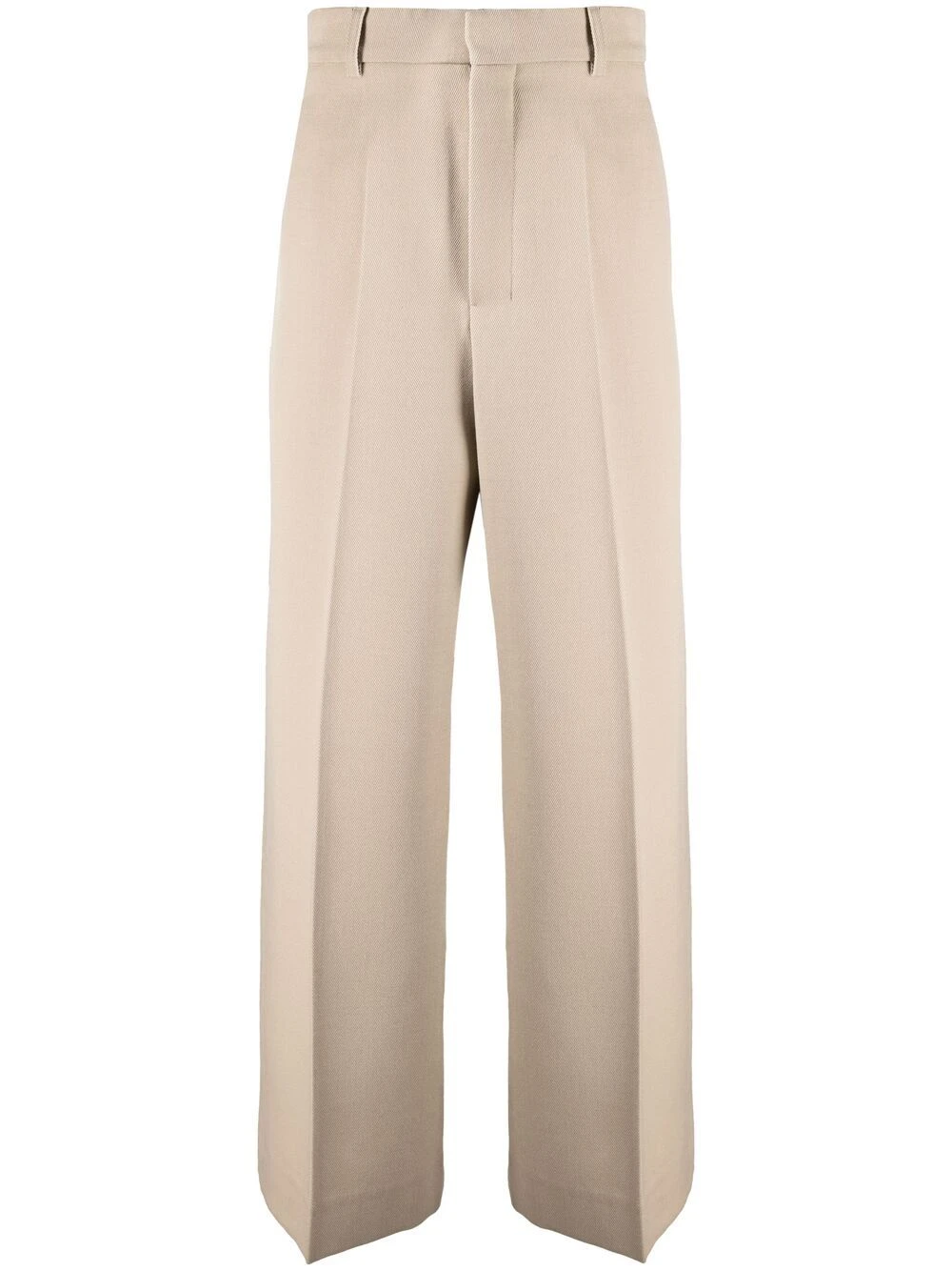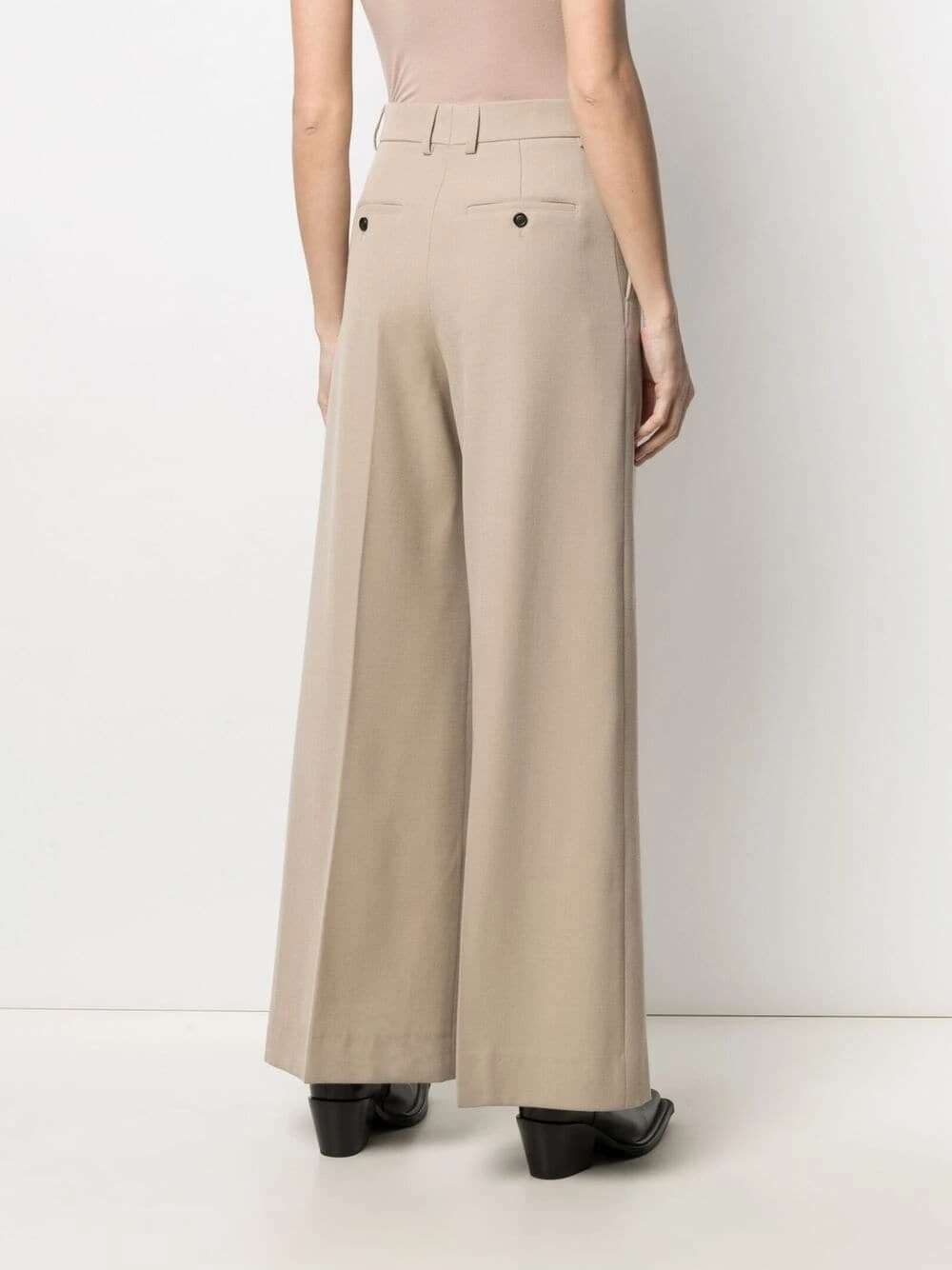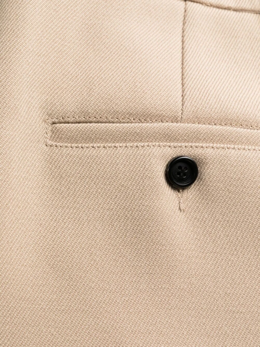 Taille haute, plis marqués, fermeture dissimulée sur le devant, passants de ceinture, deux poches latérales fendues, poches arrière passepoilées, coupe ample.