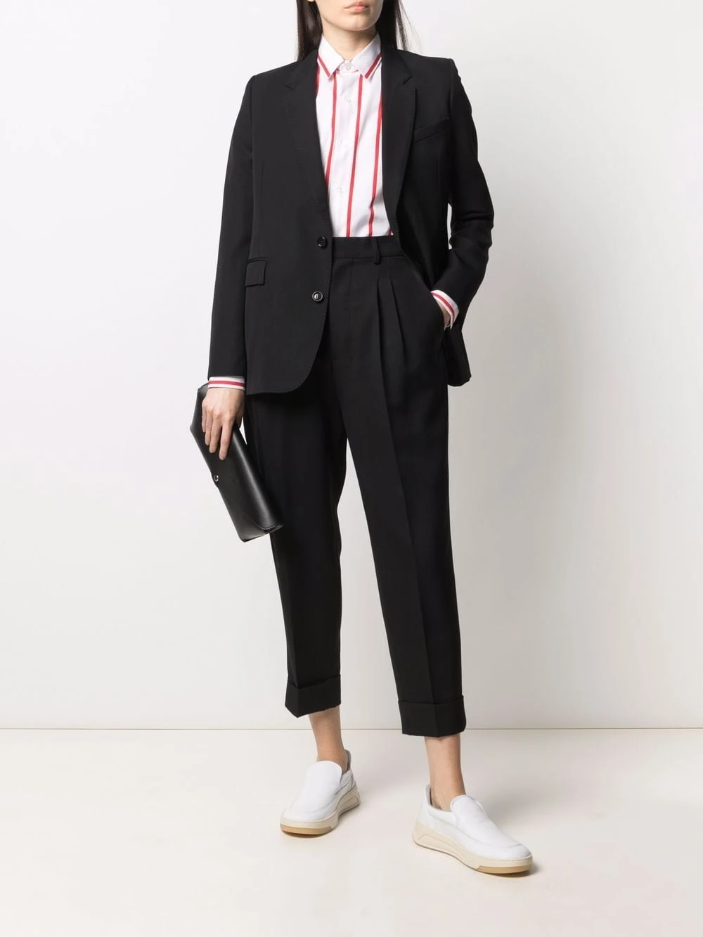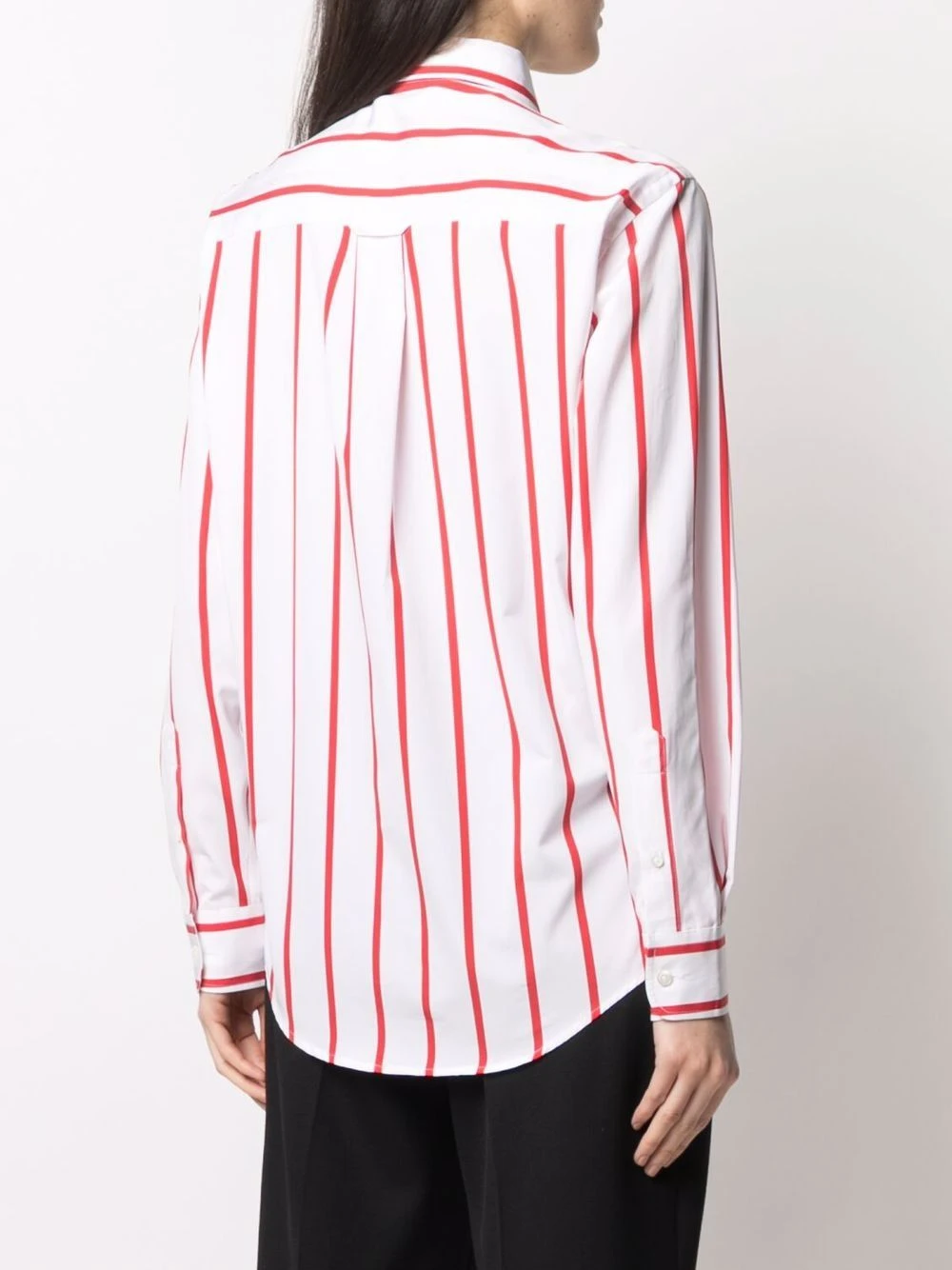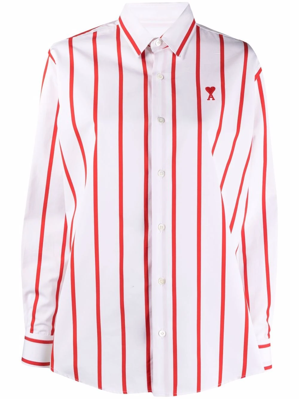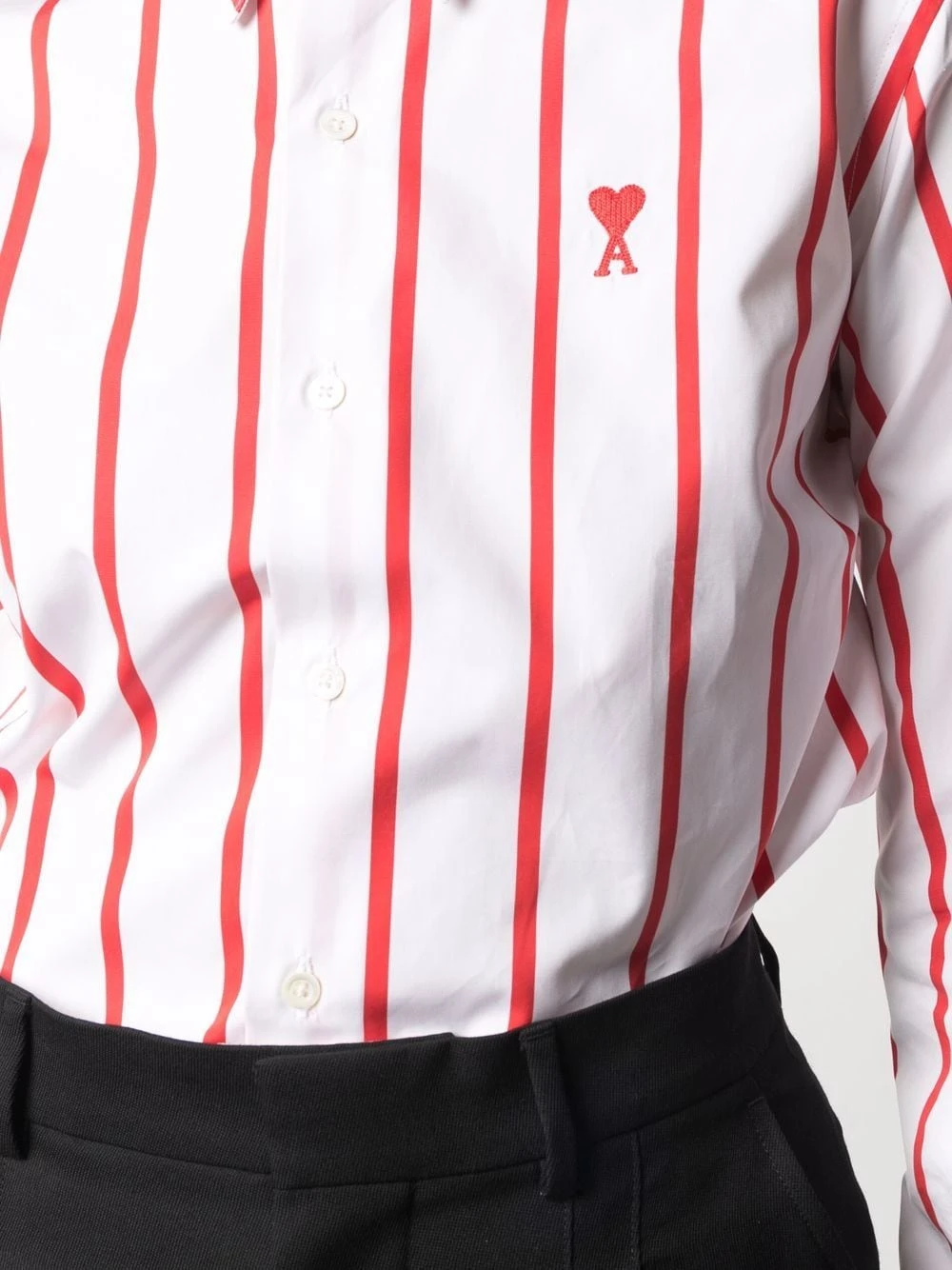 Col classique, boutonnière sur le devant, imprimé à rayures, manches longues, cœur rouge signature brodé, ourlet incurvé. Matière : laine vierge.