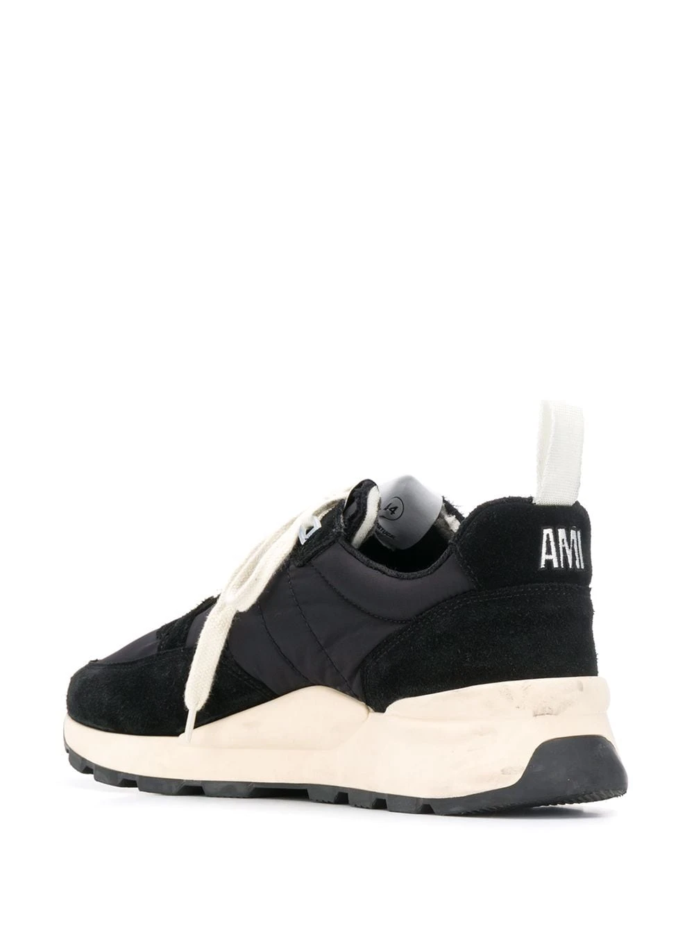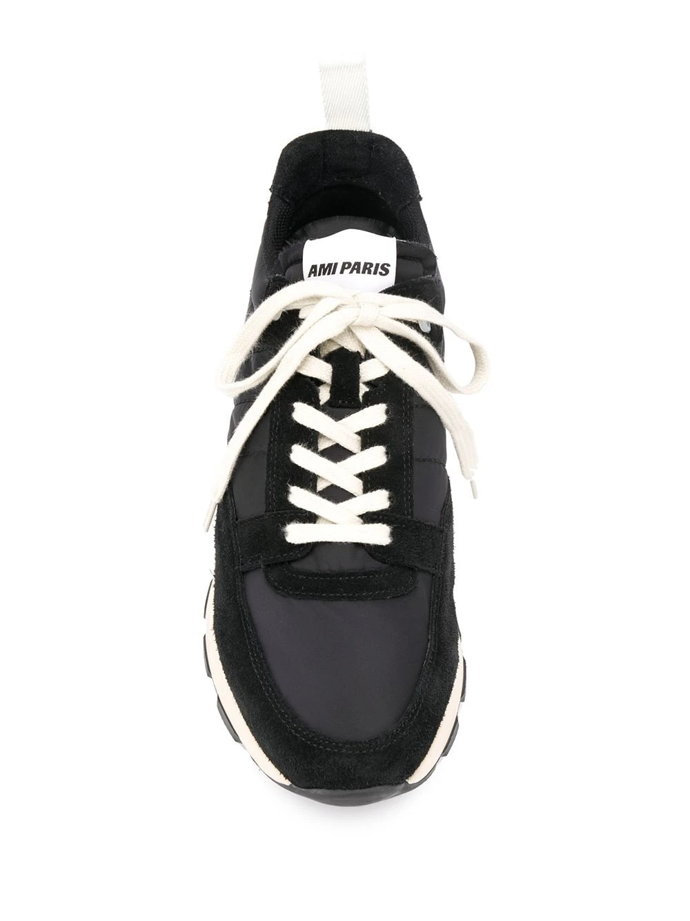 Basket basse Spring 9 AMI Alexandre Mattiussi avec bout rond, fermeture à lacer sur le devant, patch logo sur la languette et semelle en caoutchouc blanc. Couleur : noir.
