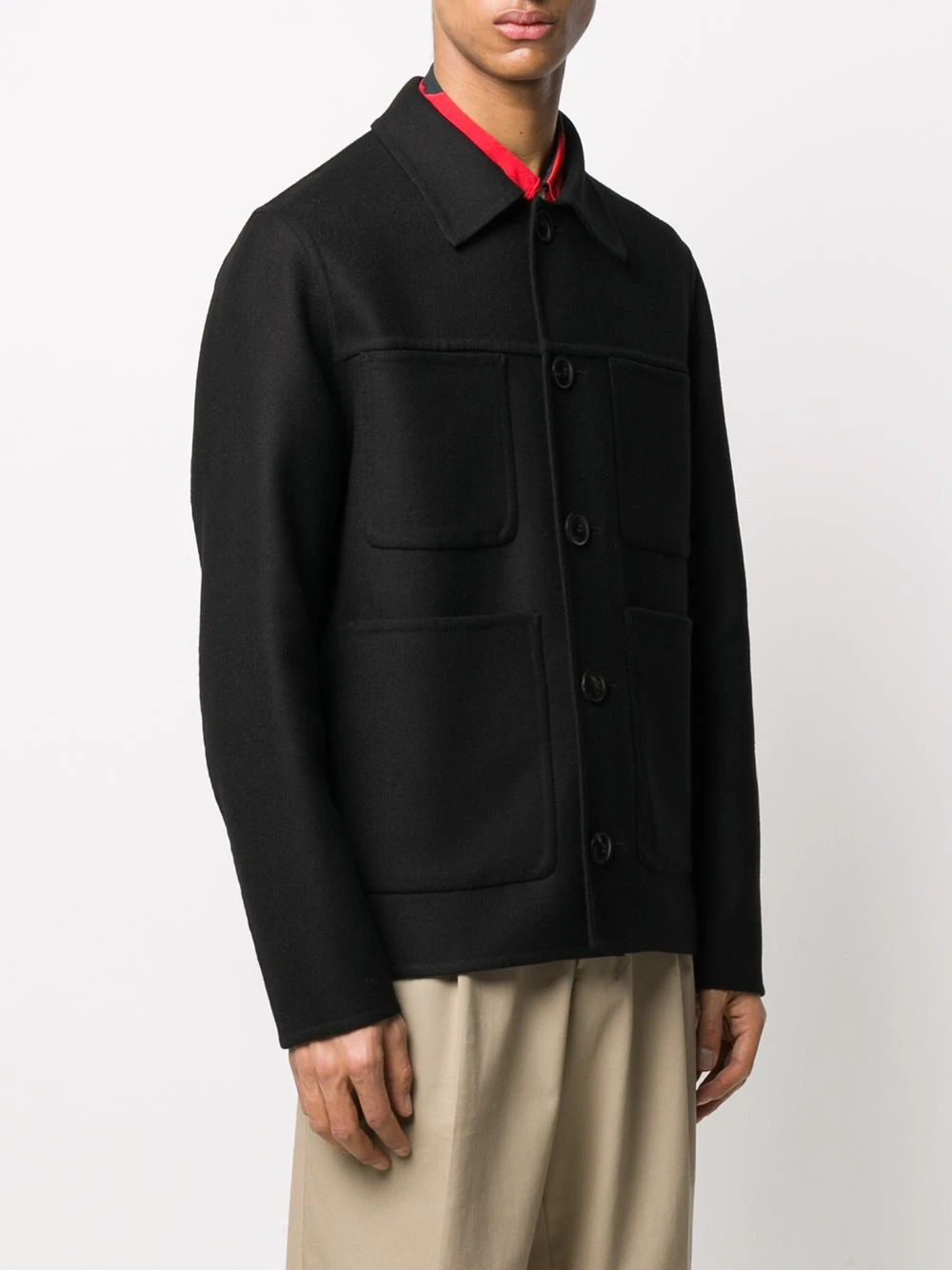 Veste courte boutonnée AMI Paris avec coupe boxy, col pointu, boutonnière sur le devant, manches longues et poches plaquées. Couleur : noir.